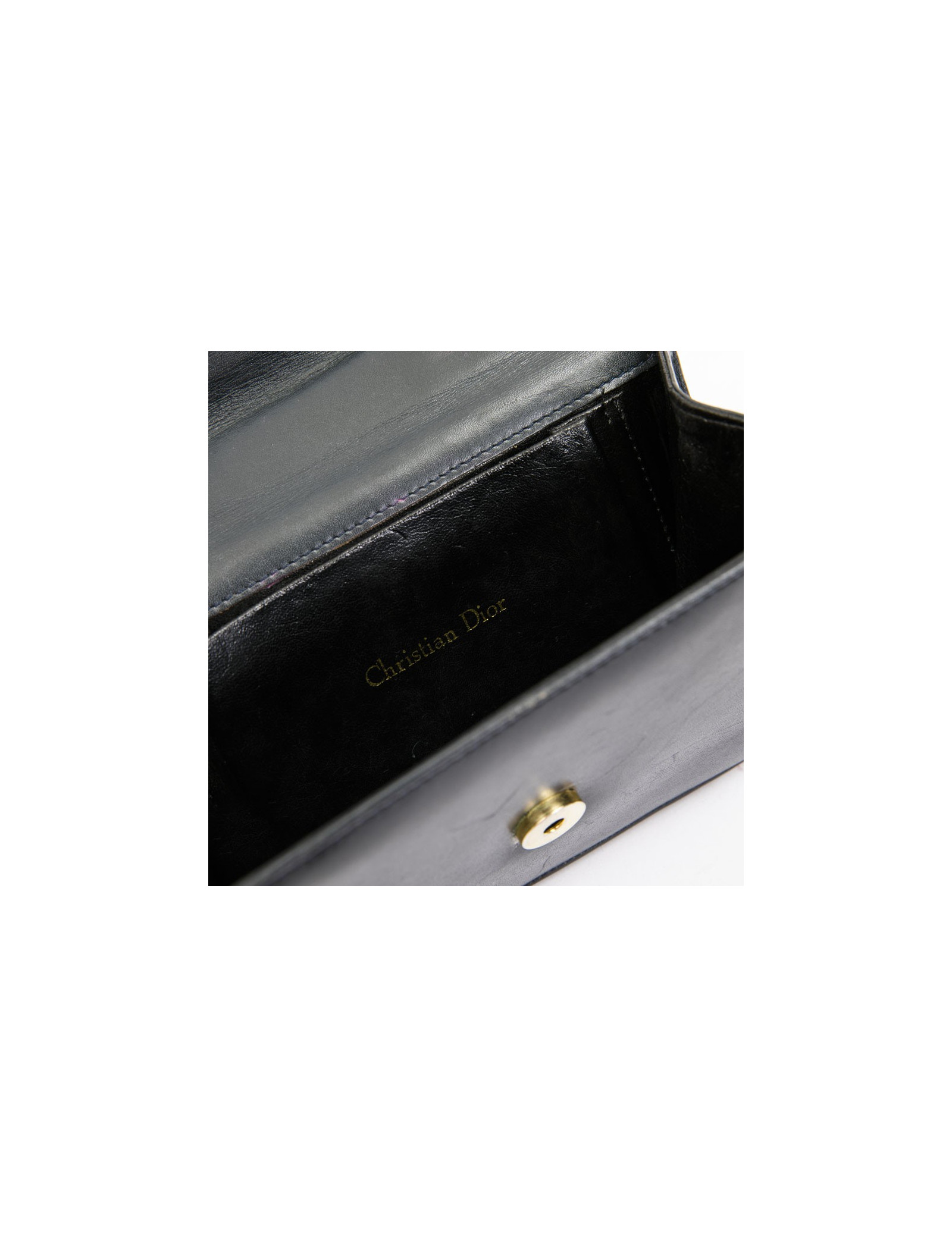 Sac Christian Dior vintage en cuir lisse bleu marine. Bijouterie en métal doré. Fermeture par bouton pression. Doublure intérieure en cuir noir. Grande poche plate sur l'arrière