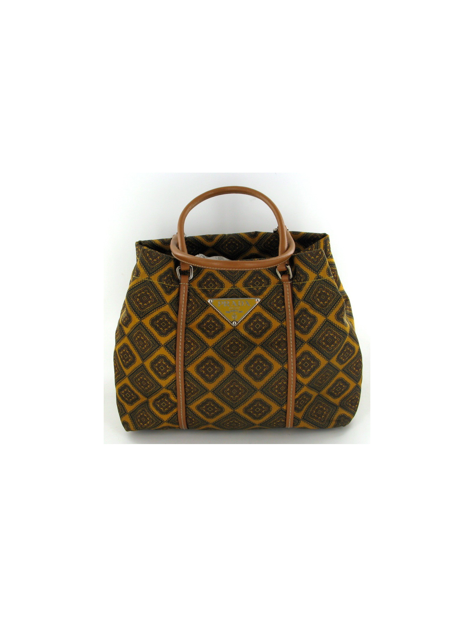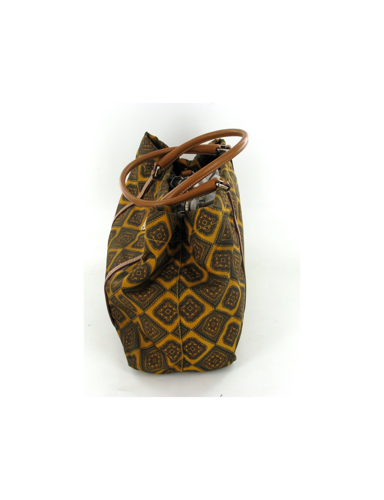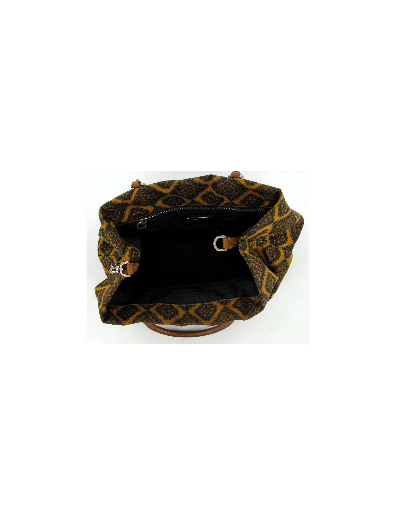 Petit sac PRADA en toile lisse avec des motifs de couleur gold et marron, se ferme à l'aide d' un mousqueton mêlant cuir et bijouterie argent. Les anses sont en cuir couleur gold. L'intérieur est un tissu monogrammé et comporte une poche zippée. Livré avec son dustbag.