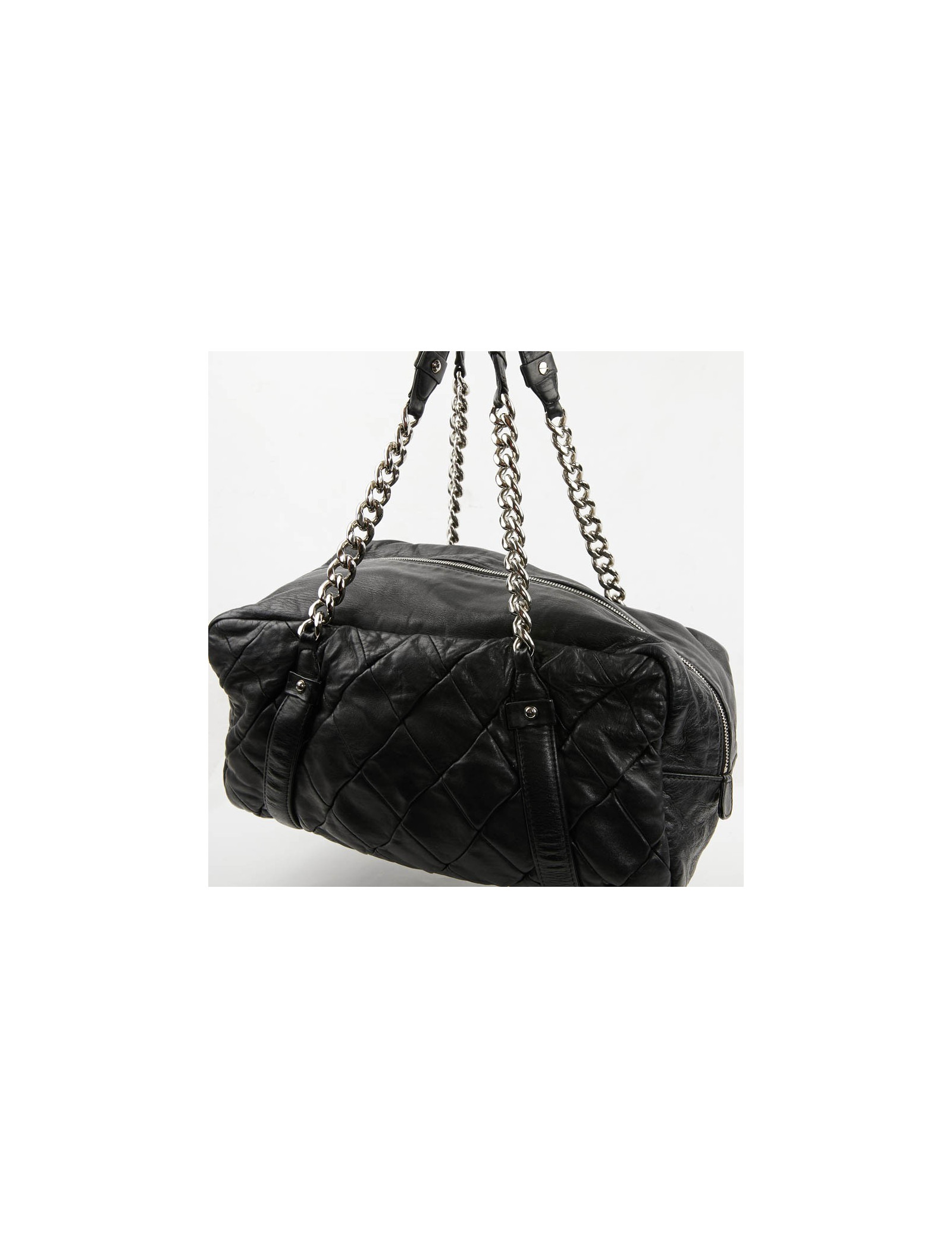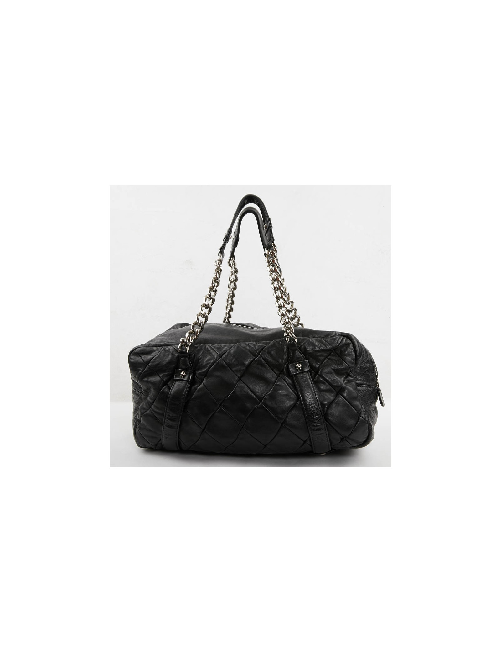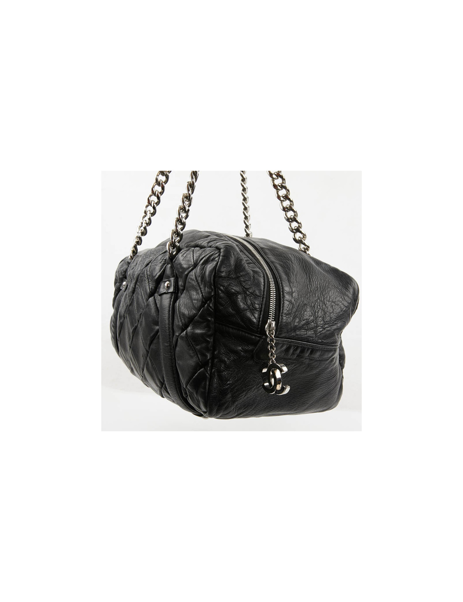 Ce sac forme bowling, Chanel est en cuir de veau matelassé souple noir. La bijouterie est en argent palladié (micro- rayures). Fermeture éclair double. Il se porte à l'épaule par sa double anse en cuir et metal. Il est doublé en tissu monogramme, il a une poche fermée. L'extérieur est en très bon état (pas d'usure des coins ou du cuir).