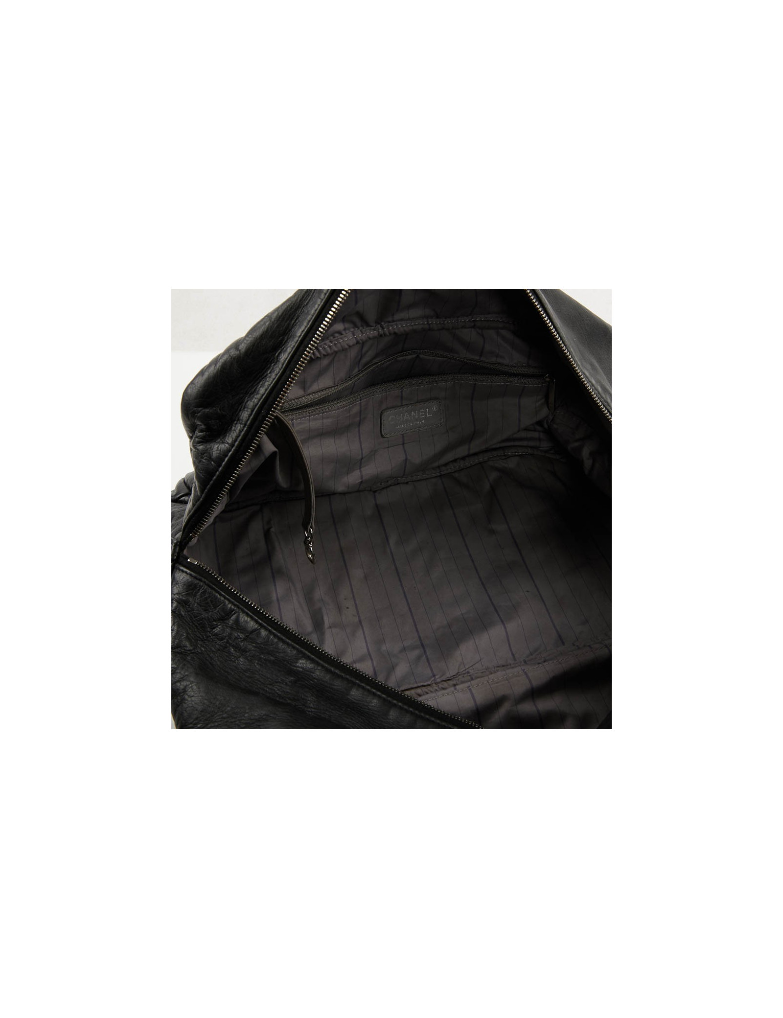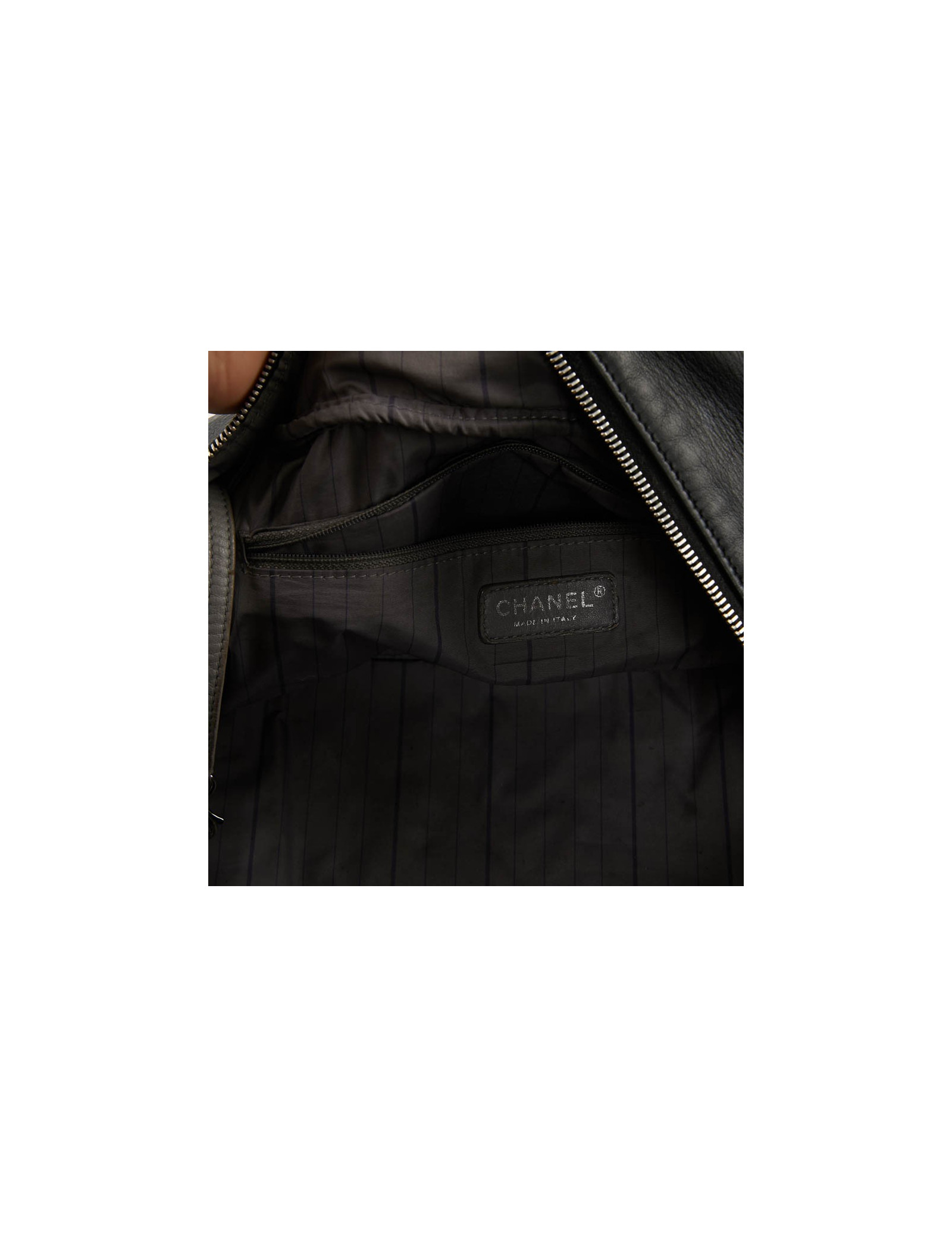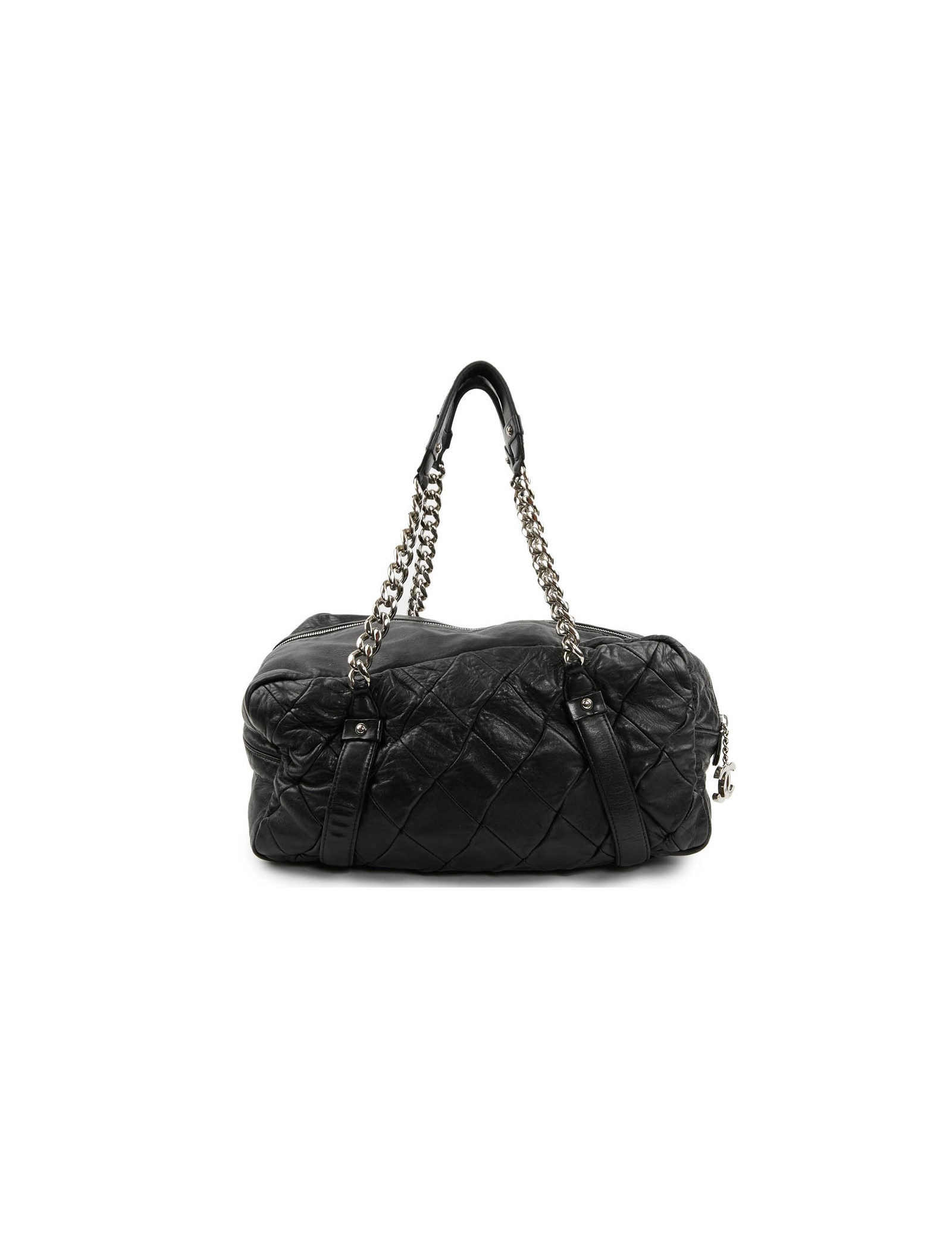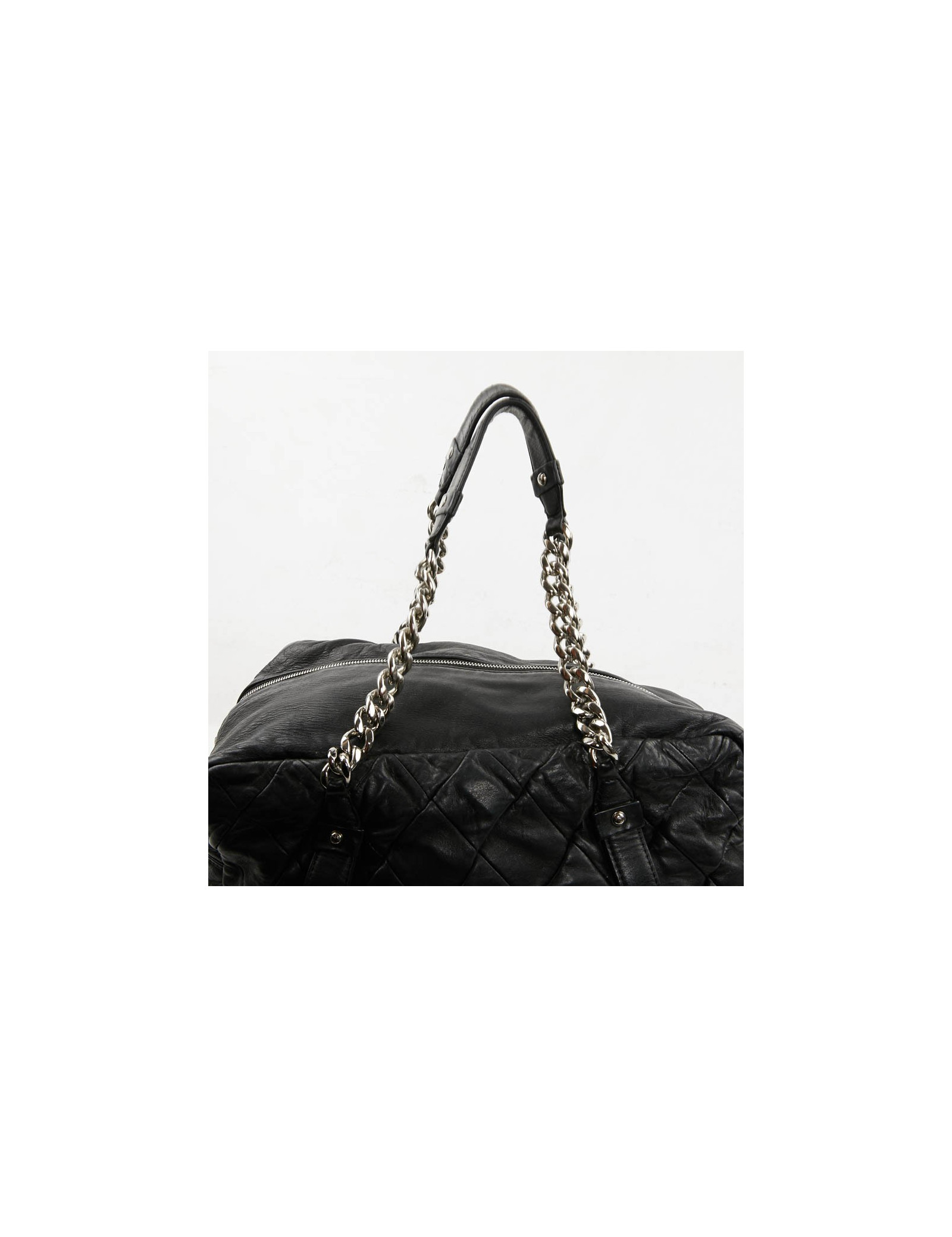 Ce sac forme bowling, Chanel est en cuir de veau matelassé souple noir. La bijouterie est en argent palladié (micro- rayures). Fermeture éclair double. Il se porte à l'épaule par sa double anse en cuir et metal. Il est doublé en tissu monogramme, il a une poche fermée. L'extérieur est en très bon état (pas d'usure des coins ou du cuir).