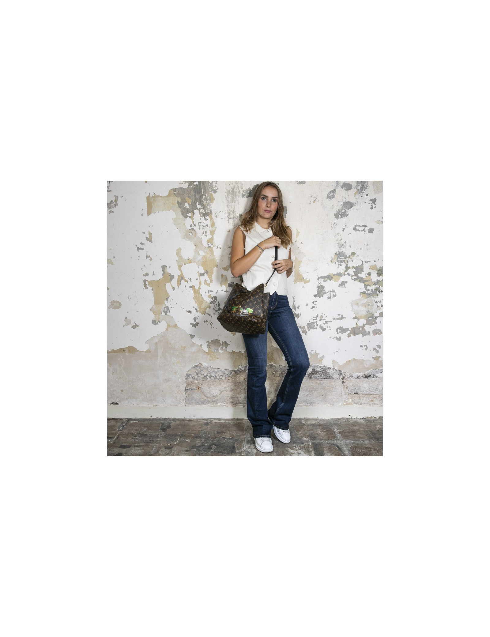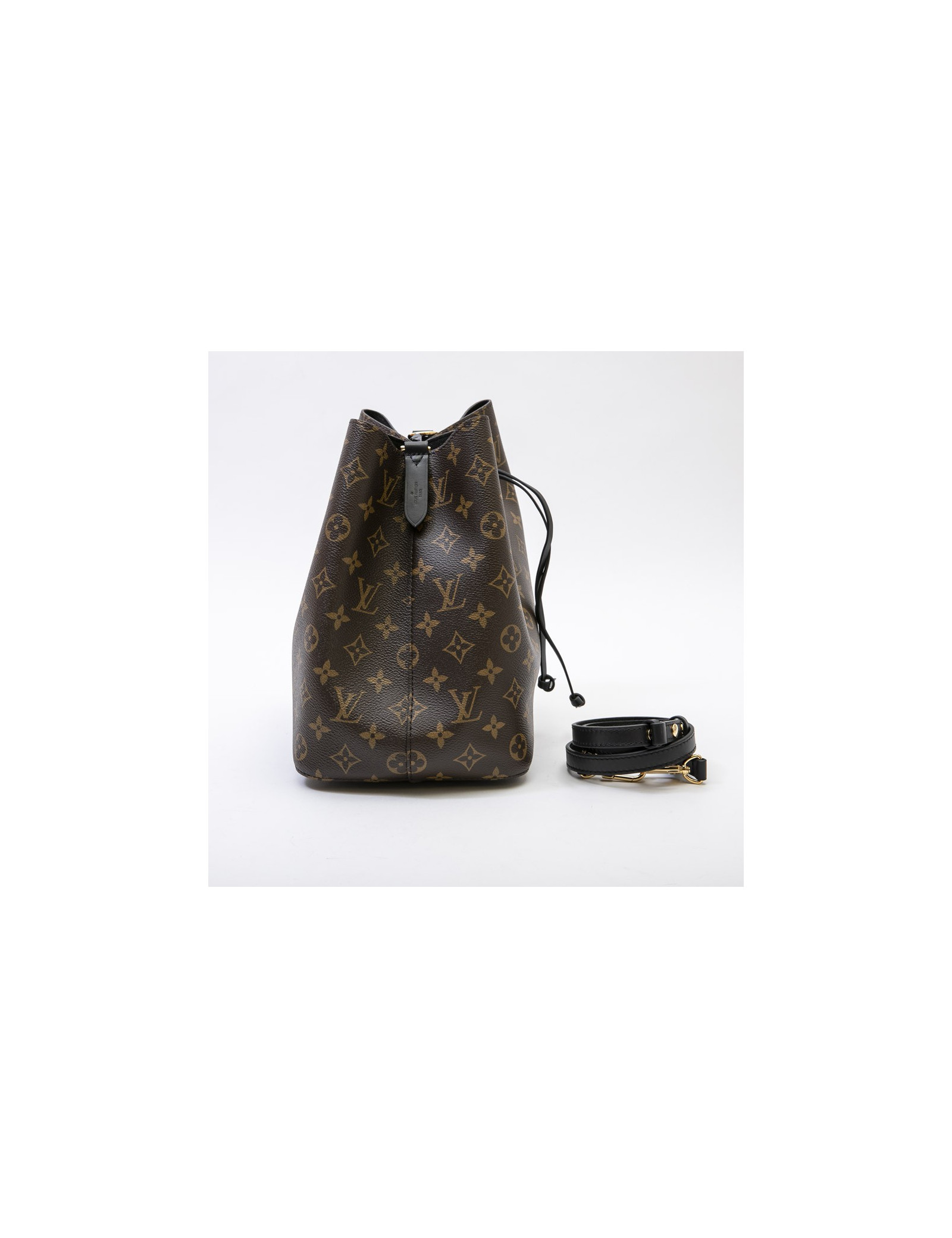 Ce joli sac NOENOE de chez LOUIS VUITTON est d'occasion. C'est une série limitée, cadeau fait aux VIP en Italie, lors d'une inauguration. Le sac à une impression du Colisée. Il se porte à l'épaule ou crossover par une bandoulière en cuir noir amovible. Les finitions sont en cuir de veau. Il se ferme par un cordon de serrage en cuir marron. L'accastillage est en métal doré. L'intérieur est doublé en suède noir avec une poche intérieure zippée. Il n'a jamais été porté.