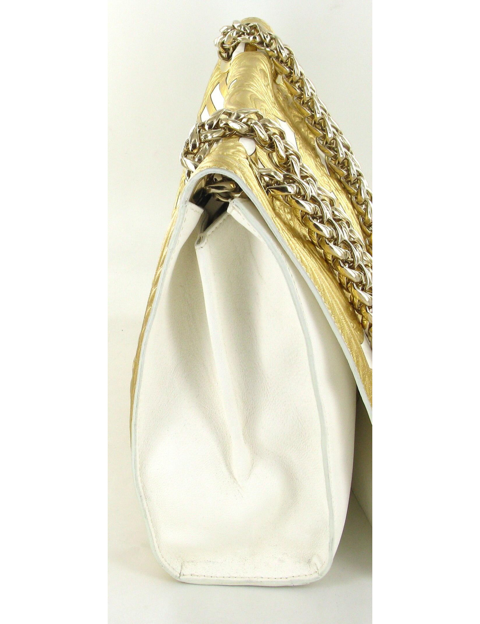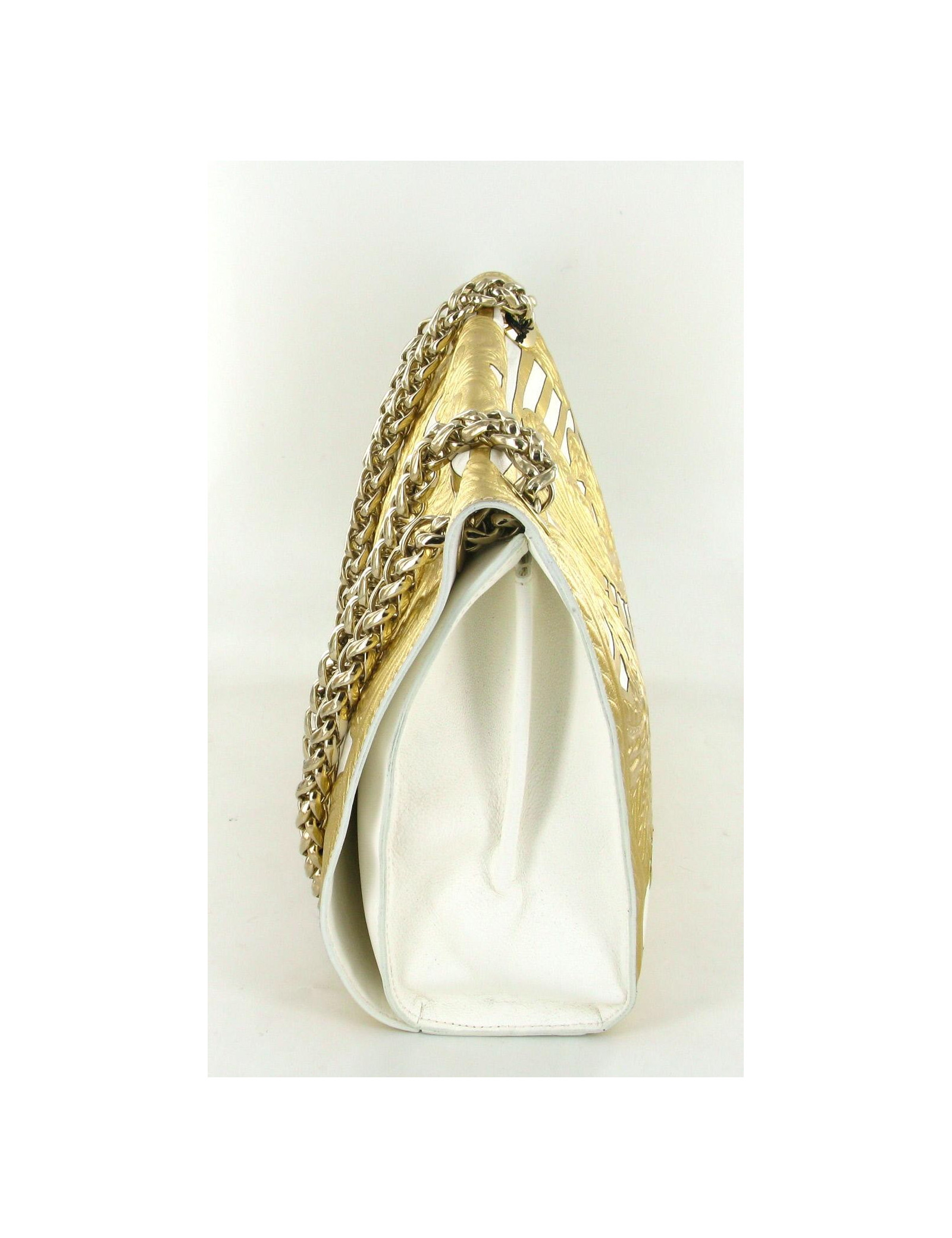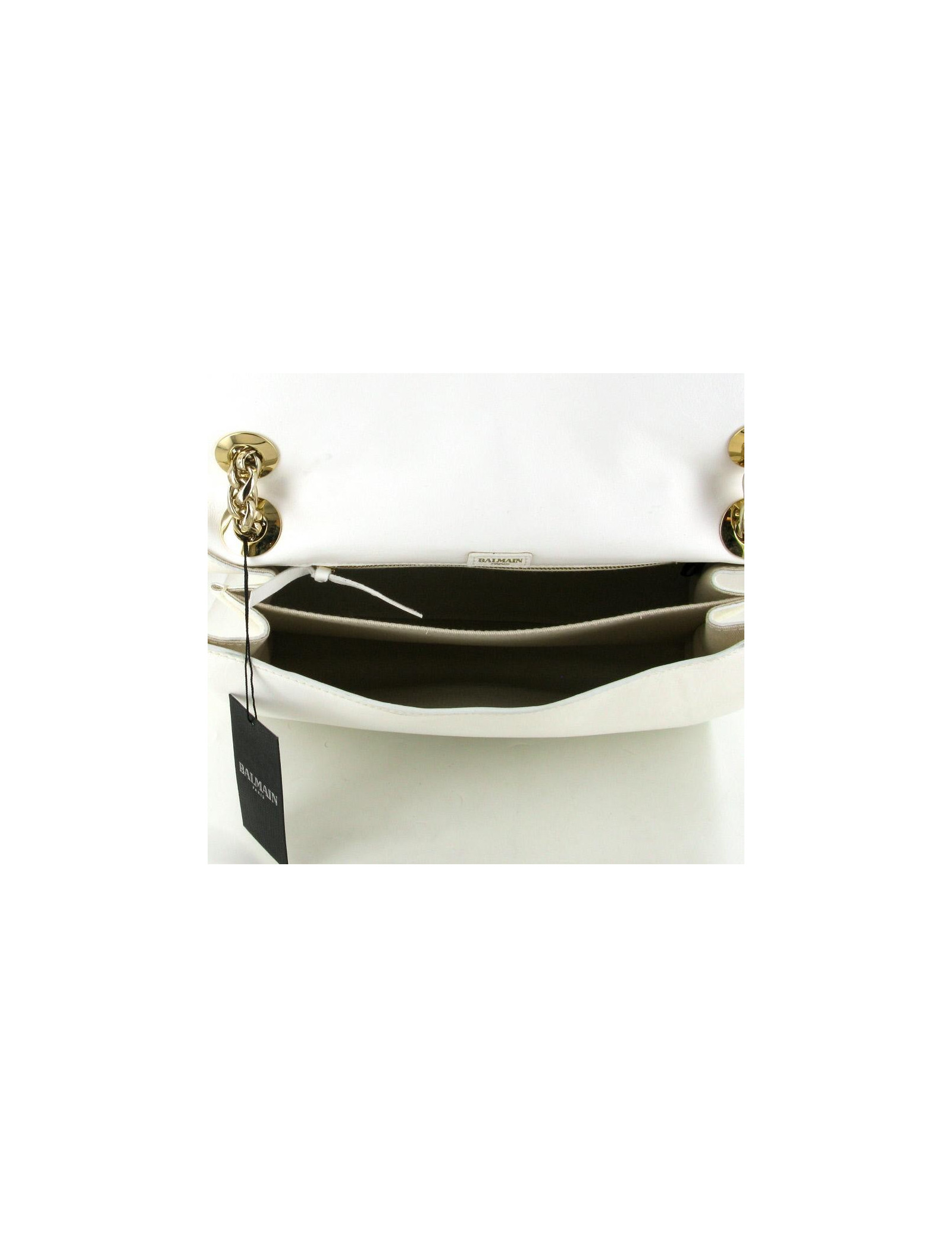 Sac BALMAIN modèle "Ultimate medium embossed" gold. En cuir blanc et embossé de motifs de couleur dorée, il n'a jamais été porté. La bijouterie est dorée. Le fermoir est siglé: BALMAIN; Le sac se porte à l'épaule ou en bandoulière avec deux larges anses modèle épi. L'intérieur est en cuir blanc et se compose de deux compartiments et 1 poche zippée. Livré avec dustbag et certificat d'authenticité. Collection 2012 - Prix public 3800 e
