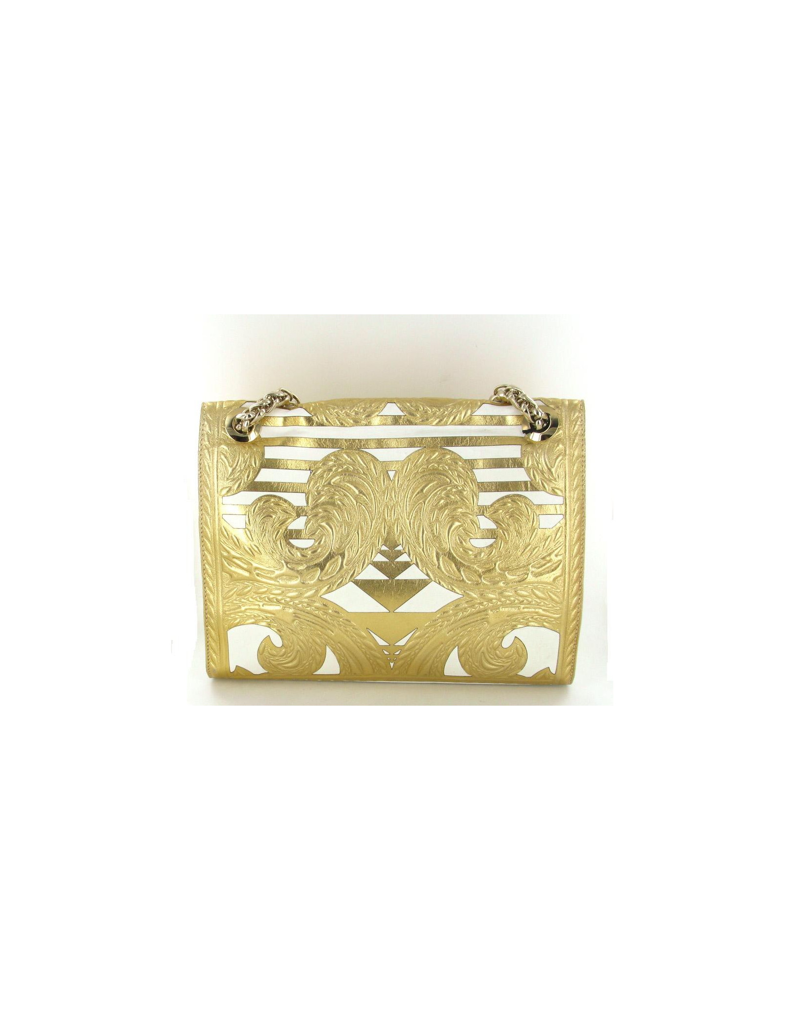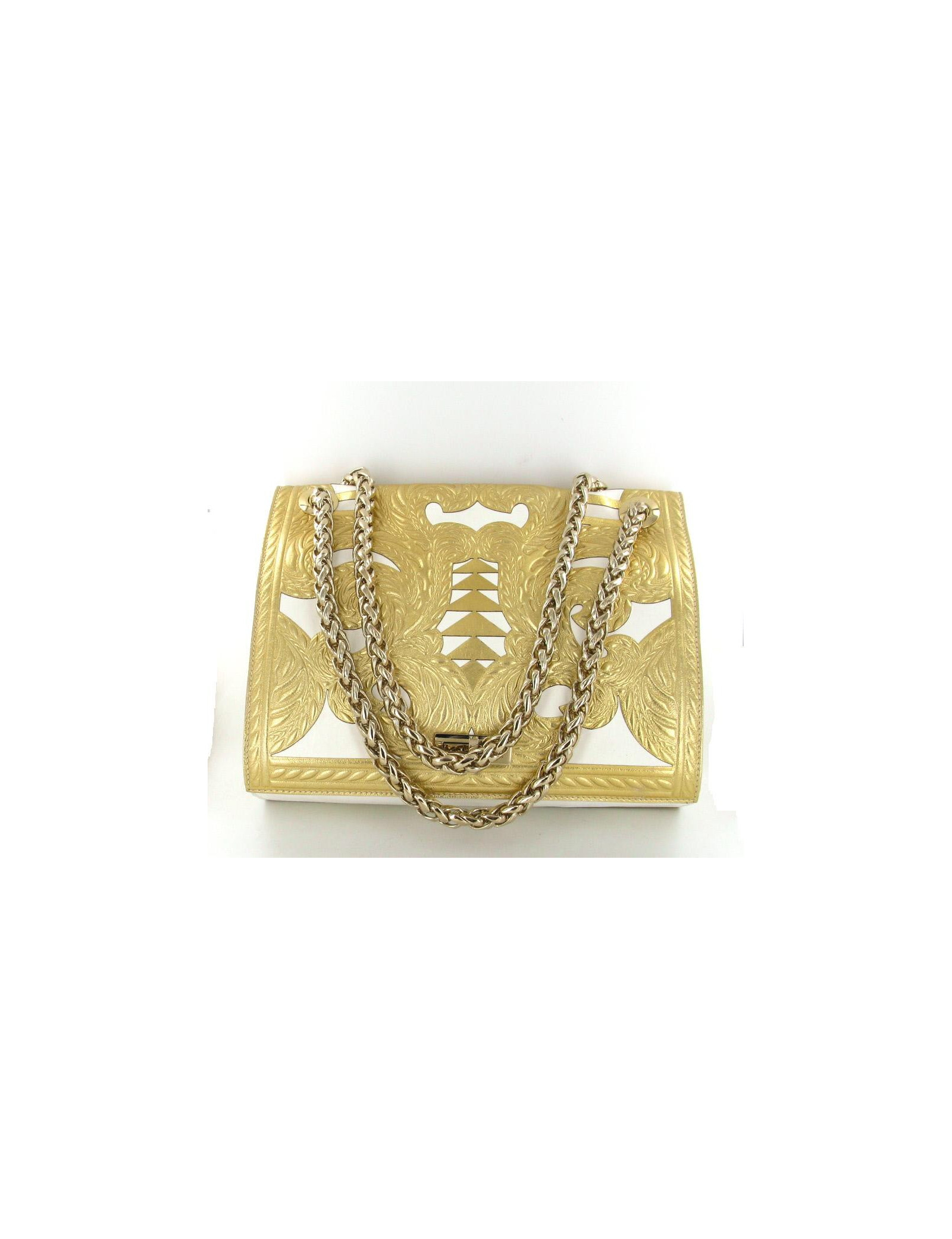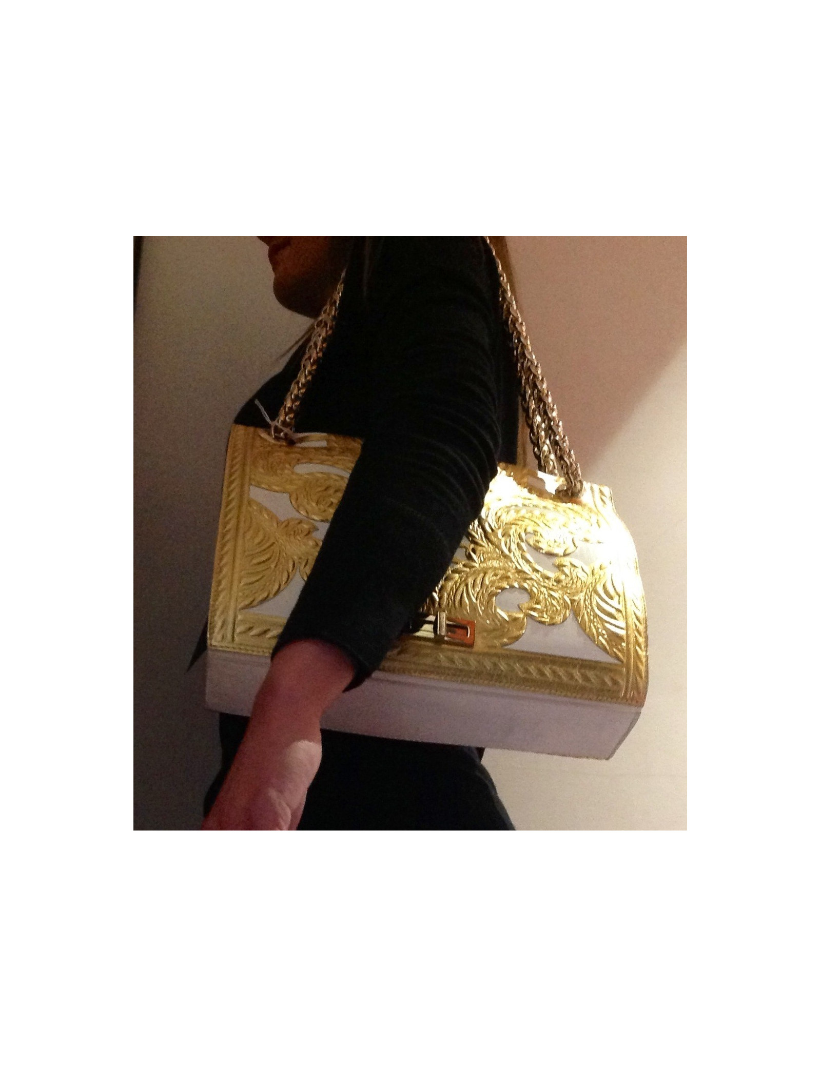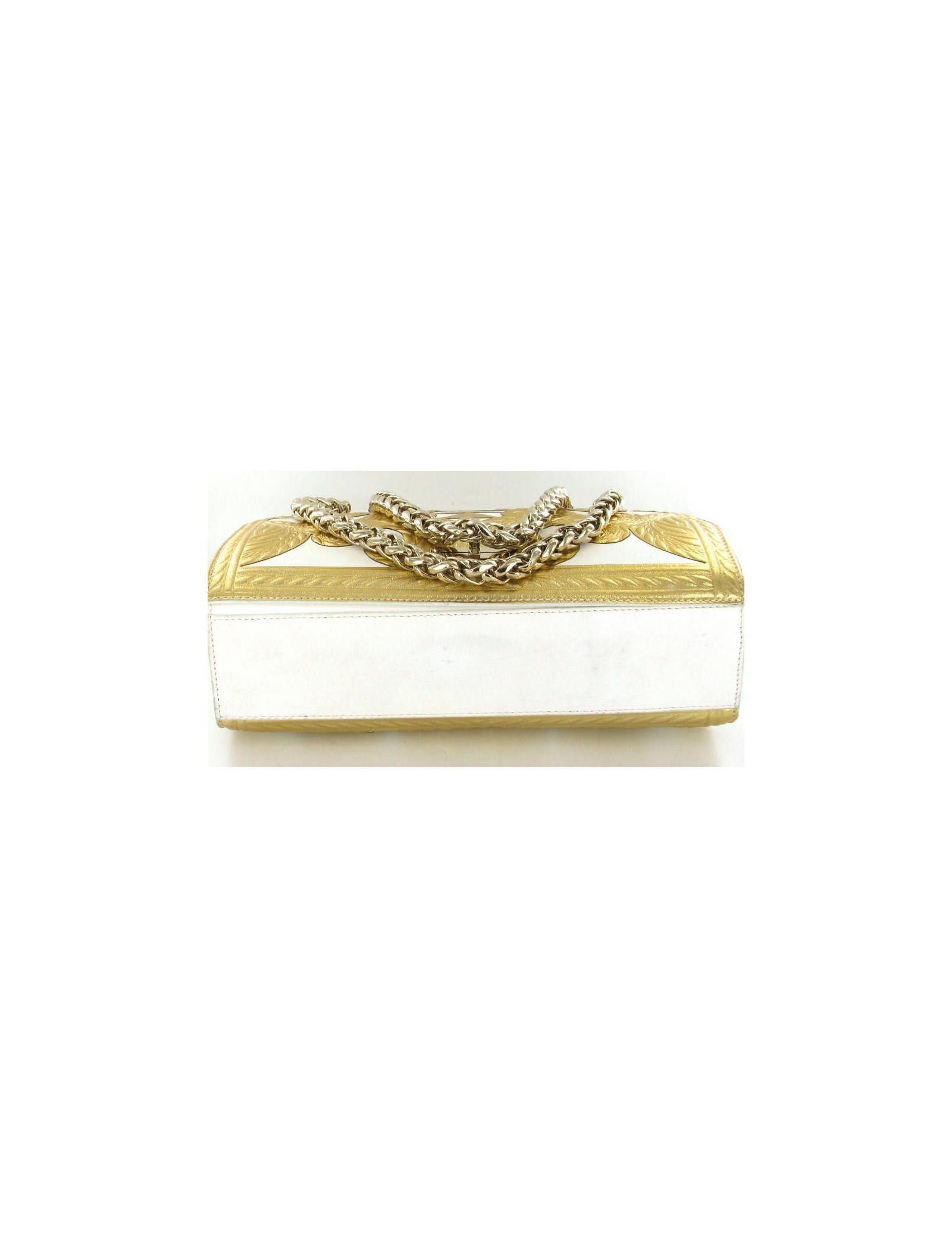 Sac BALMAIN modèle "Ultimate medium embossed" gold. En cuir blanc et embossé de motifs de couleur dorée, il n'a jamais été porté. La bijouterie est dorée. Le fermoir est siglé: BALMAIN; Le sac se porte à l'épaule ou en bandoulière avec deux larges anses modèle épi. L'intérieur est en cuir blanc et se compose de deux compartiments et 1 poche zippée. Livré avec dustbag et certificat d'authenticité. Collection 2012 - Prix public 3800 e