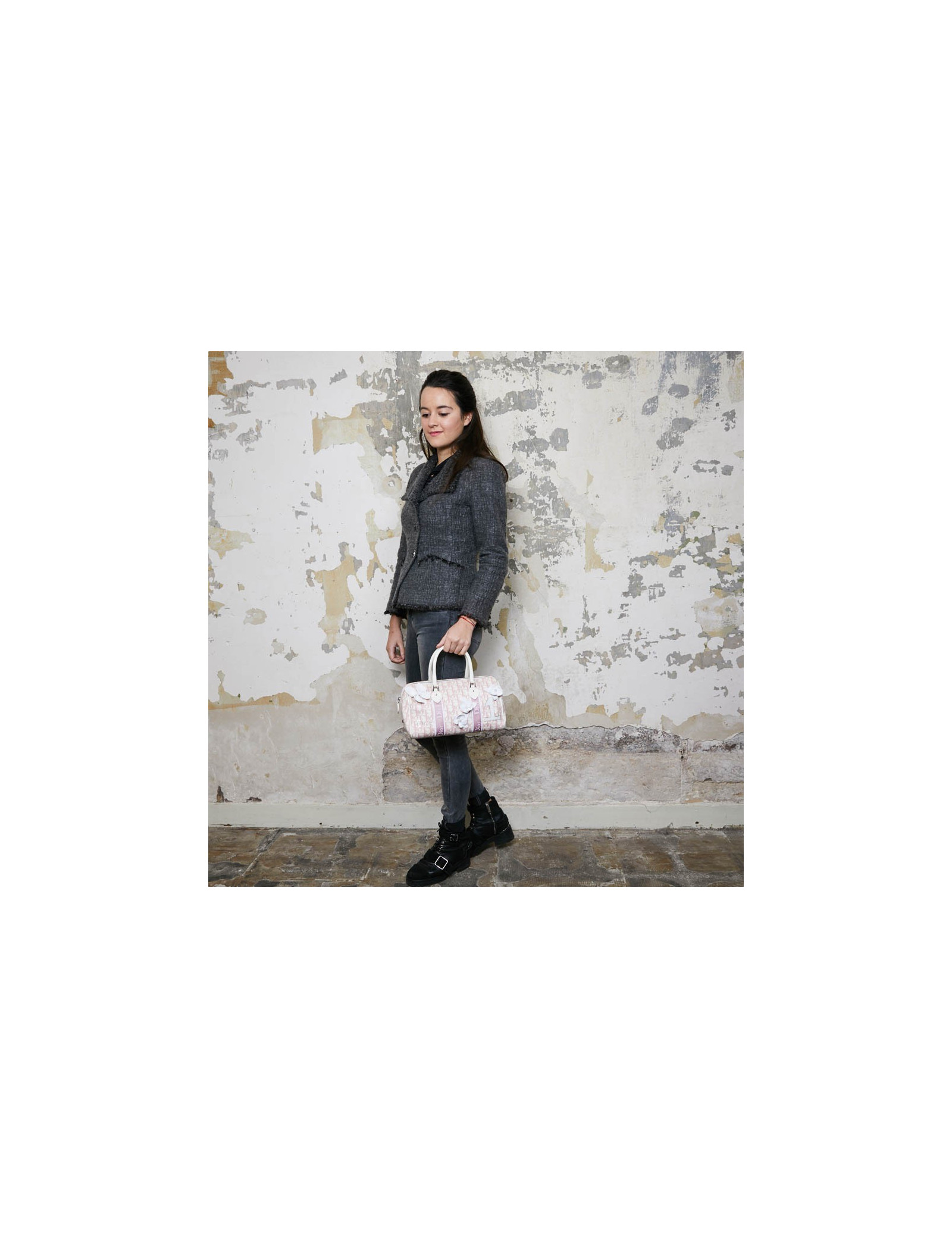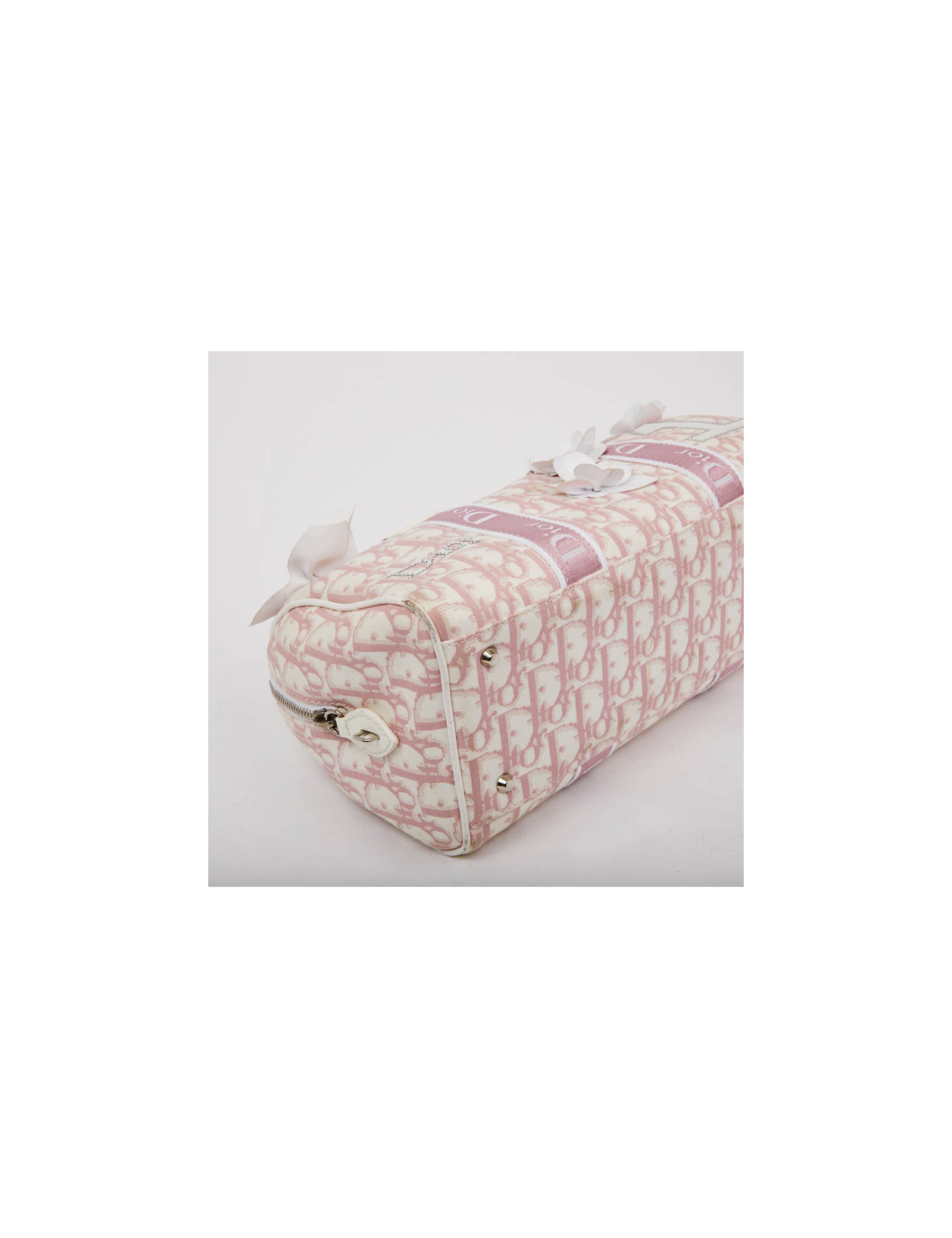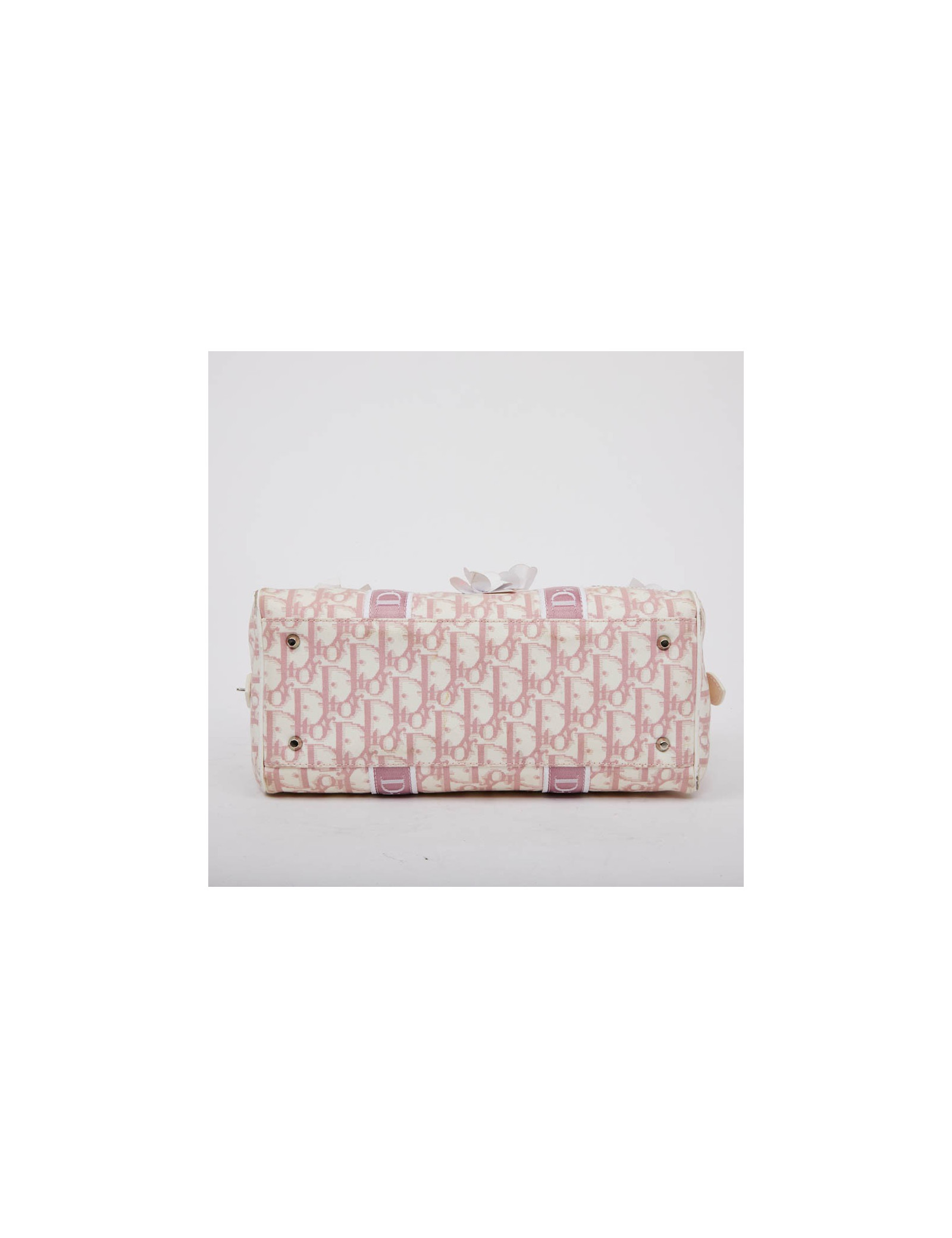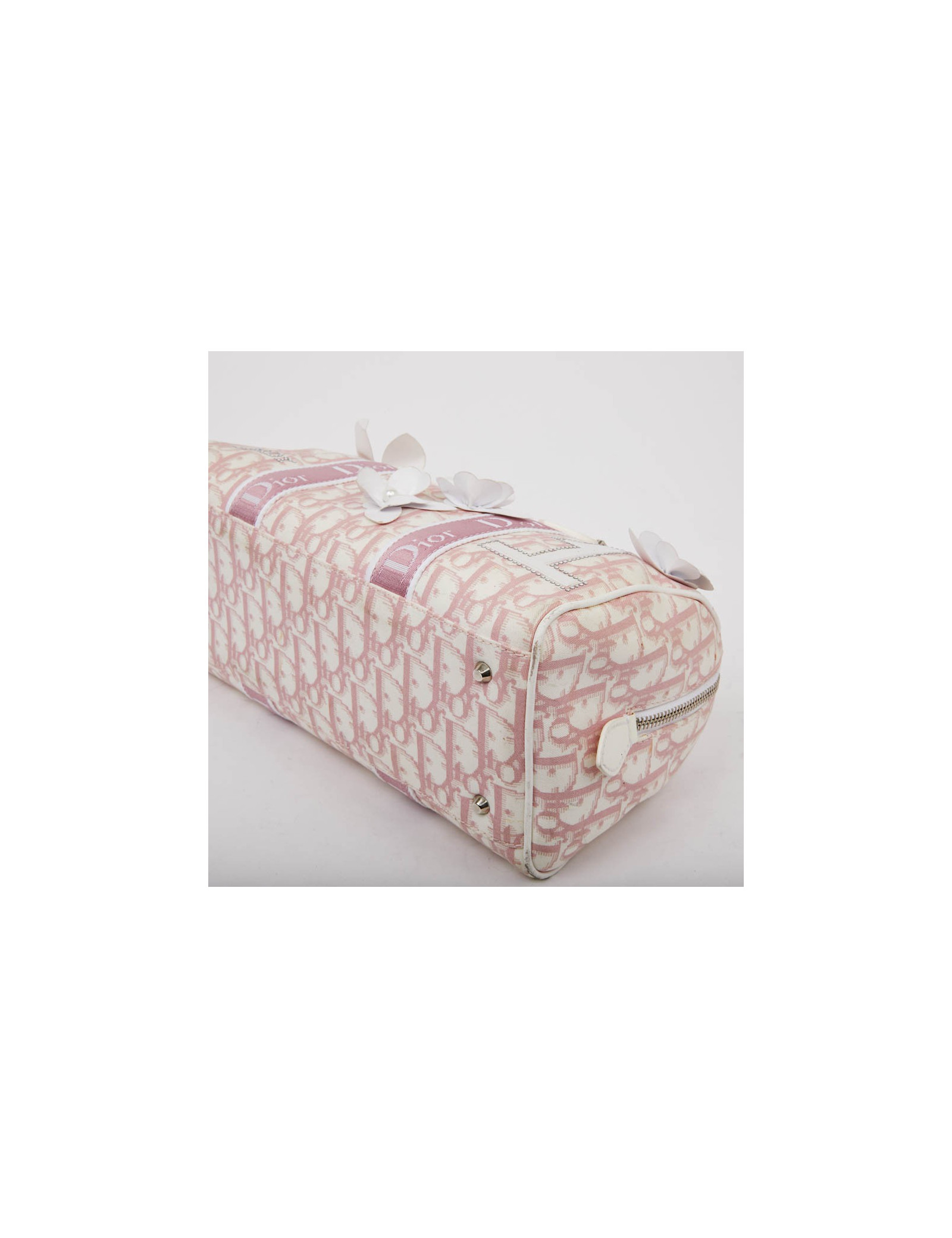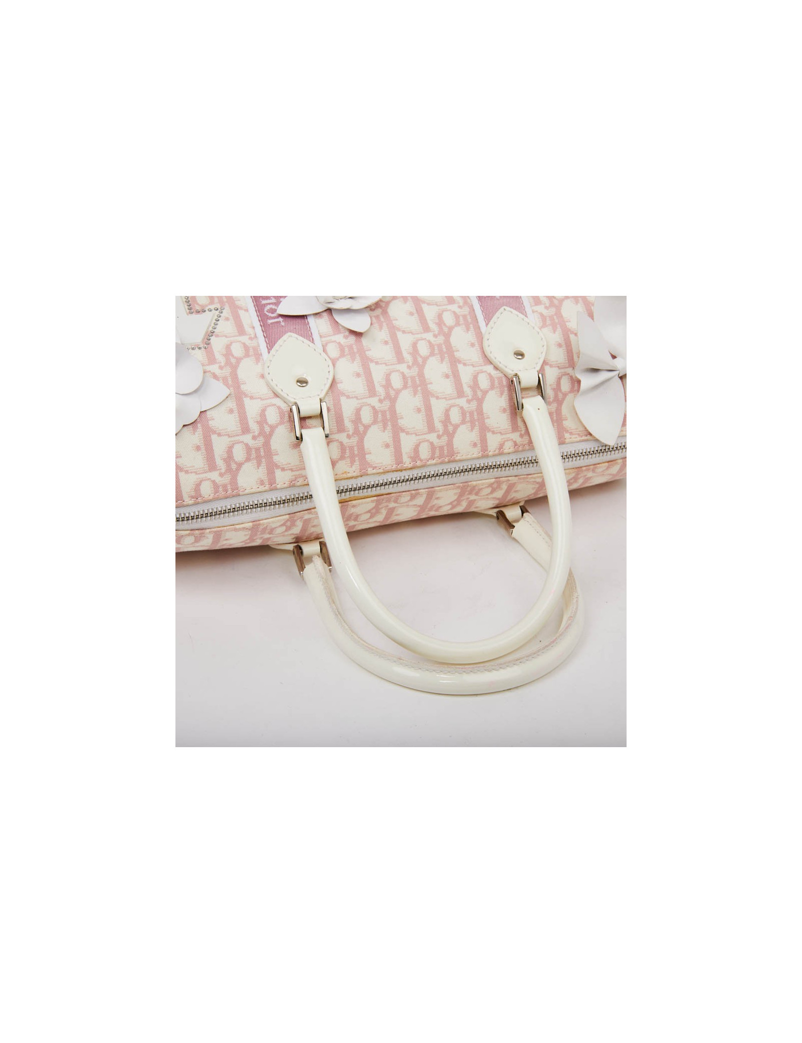 Sac vintage DIOR rose agrémenté de fleurs blanches - détails: