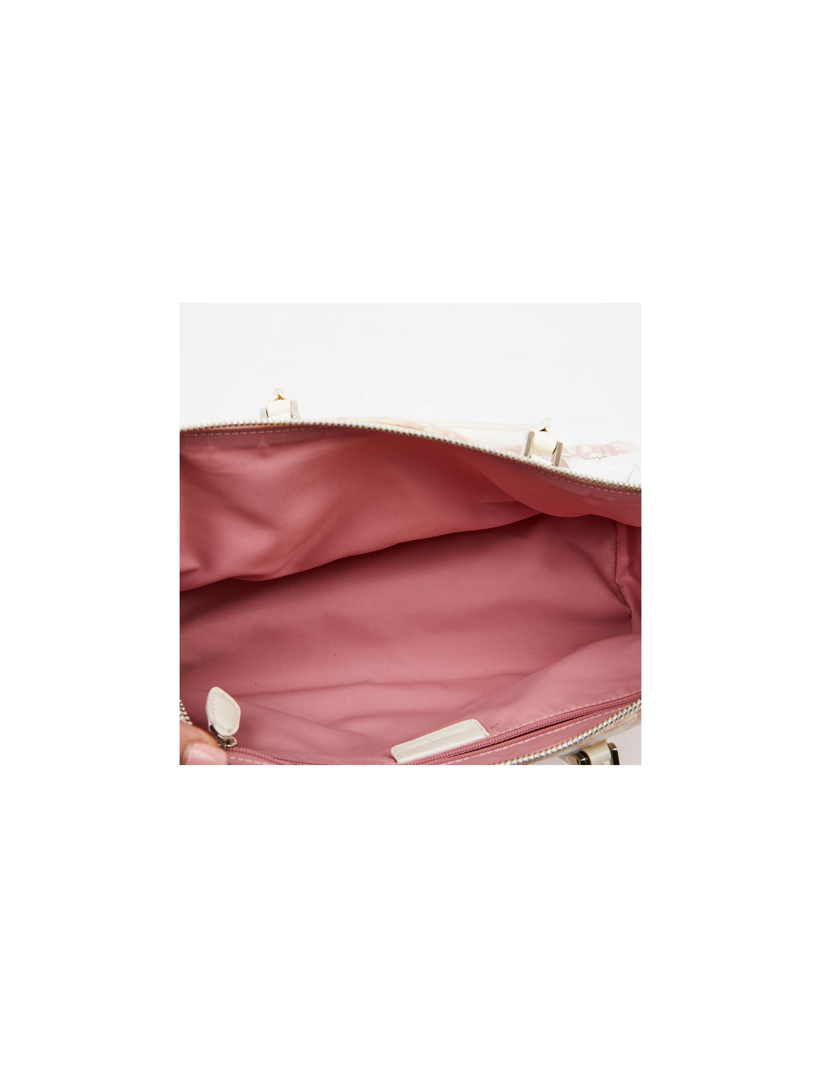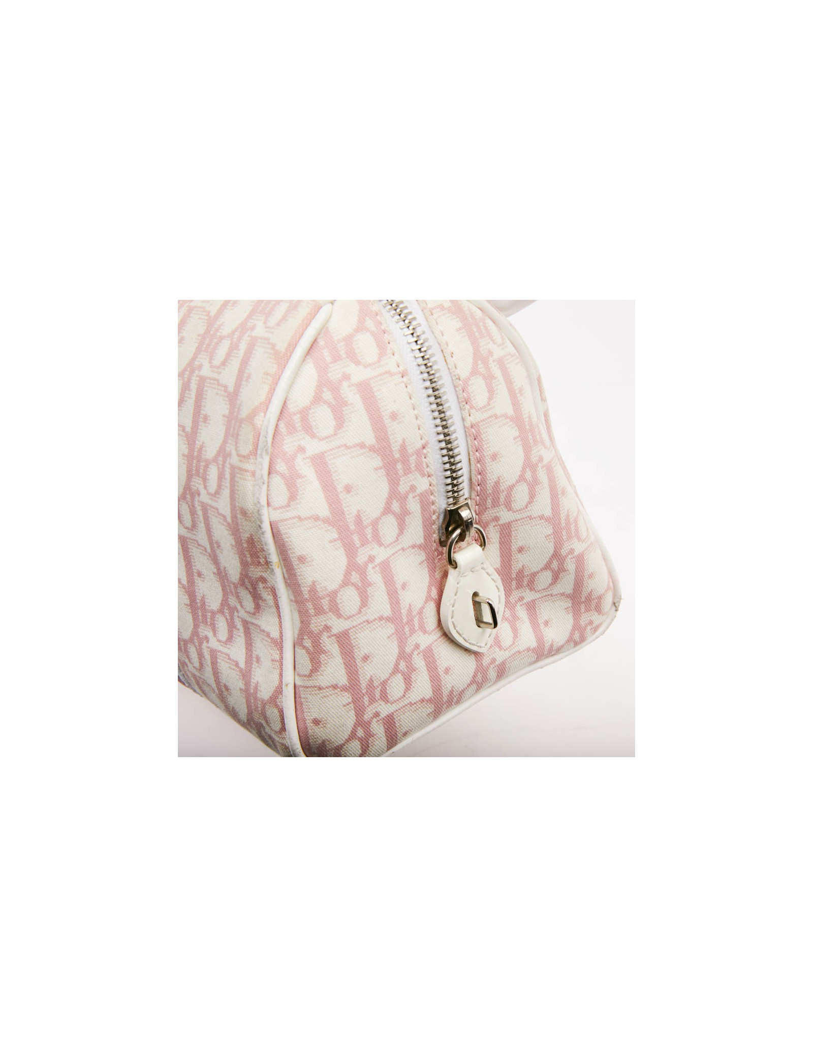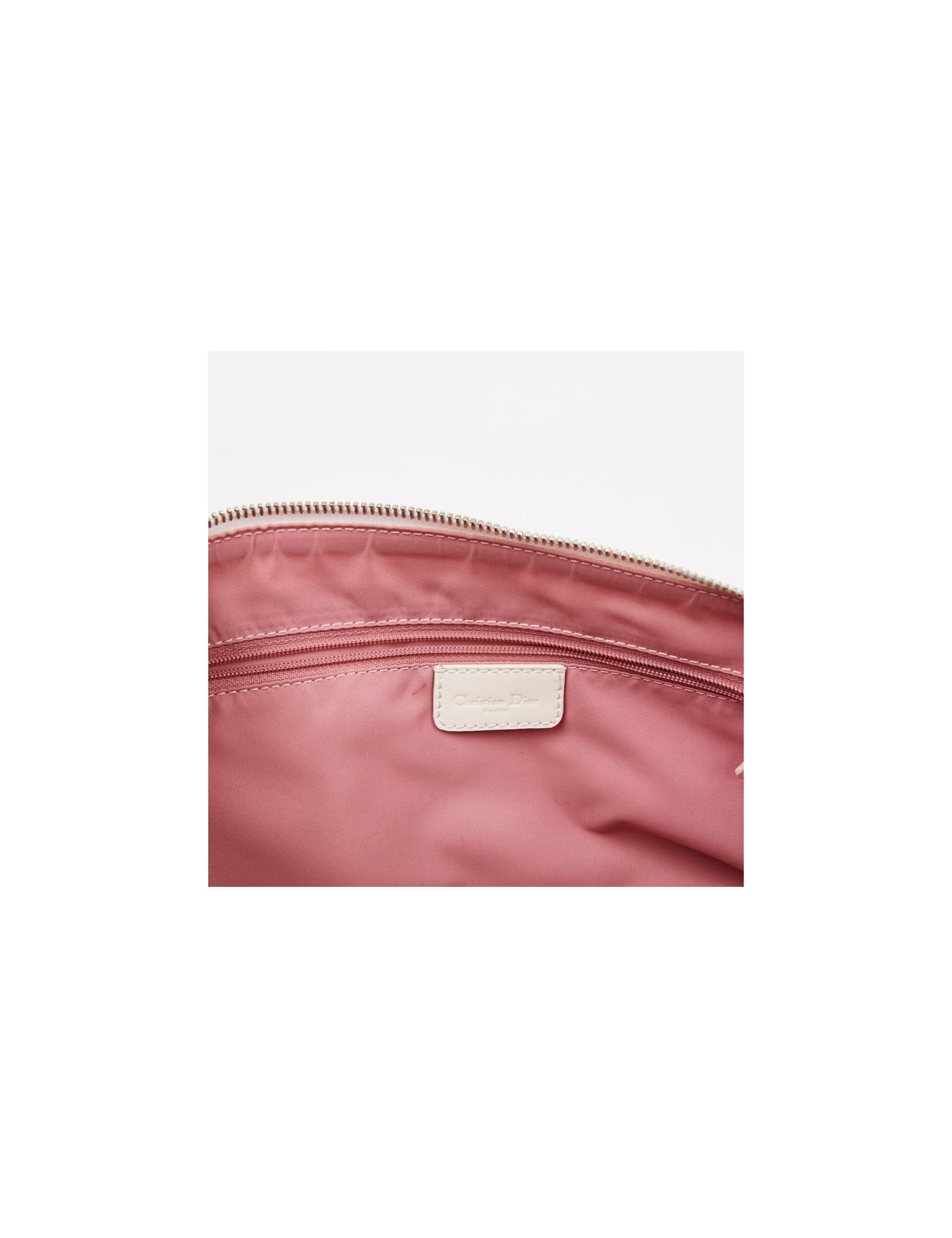 Sac à main DIOR en toile monogramme rose agrémenté de fleurs blanches en vynil. Il y a le chiffre "1" et DIOR en strass. Il est vintage. L'accastillage est en métal argent. L'intérieur est doublé d'un tissu vieux rose avec une poche plate  zippée. Il est en très bon état (légère usure des coins sur le passe-poil). Il se porte à la main.