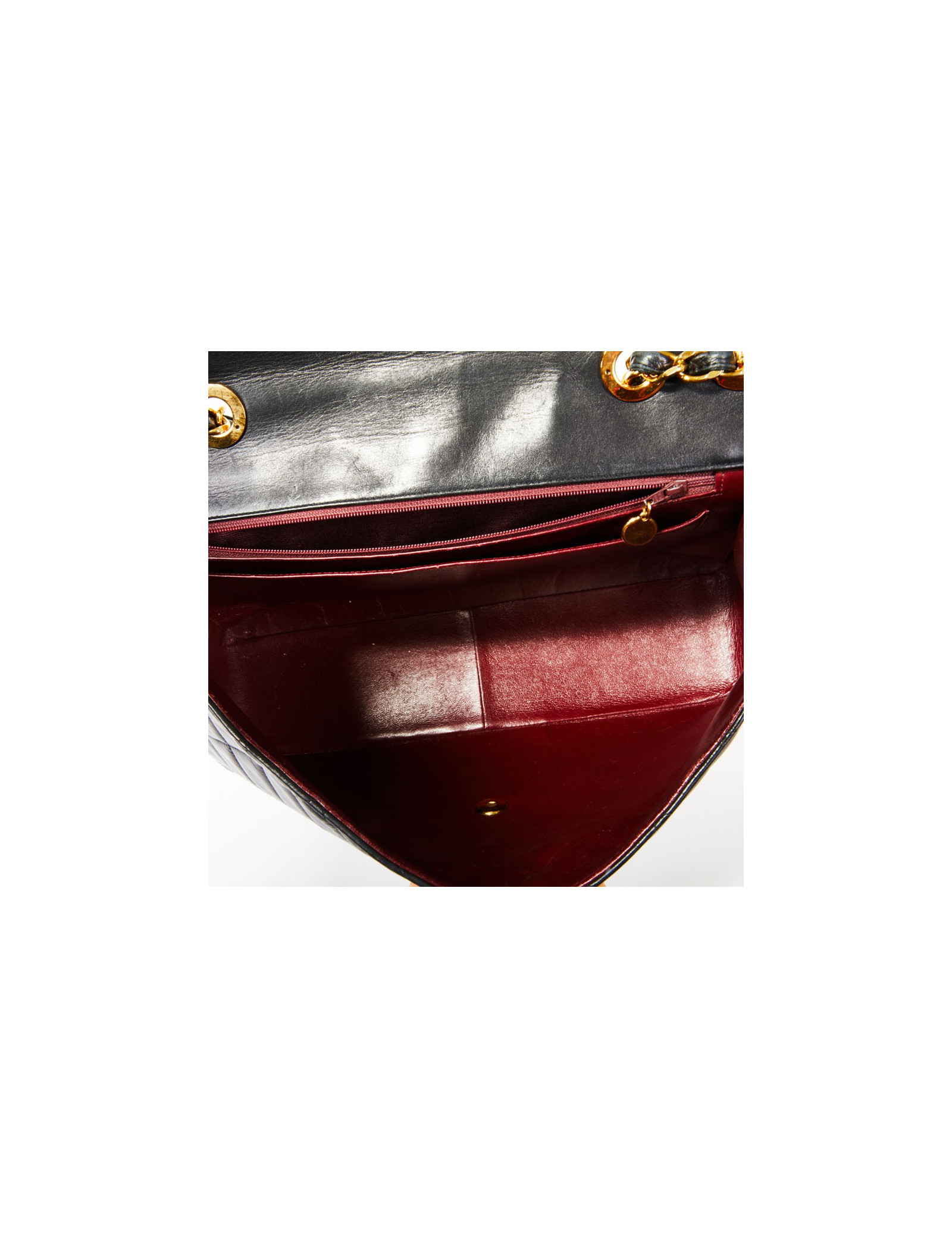 Pièce très recherchée ! Ce sac Maxi Jumbo vintage de la Maison CHANEL est en cuir lisse matelassé noir. L'accastillage est doré. Il porte le sigle CC de la même couleur que la bijouterie. L'intérieur est en cuir bordeaux avec deux poches plates dont une zippée avec inscription : Made in France. A l'arrière du sac, il y ai une poche plate.
