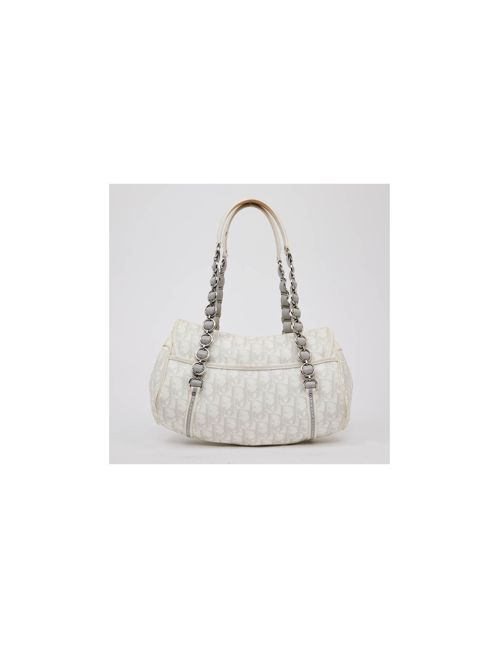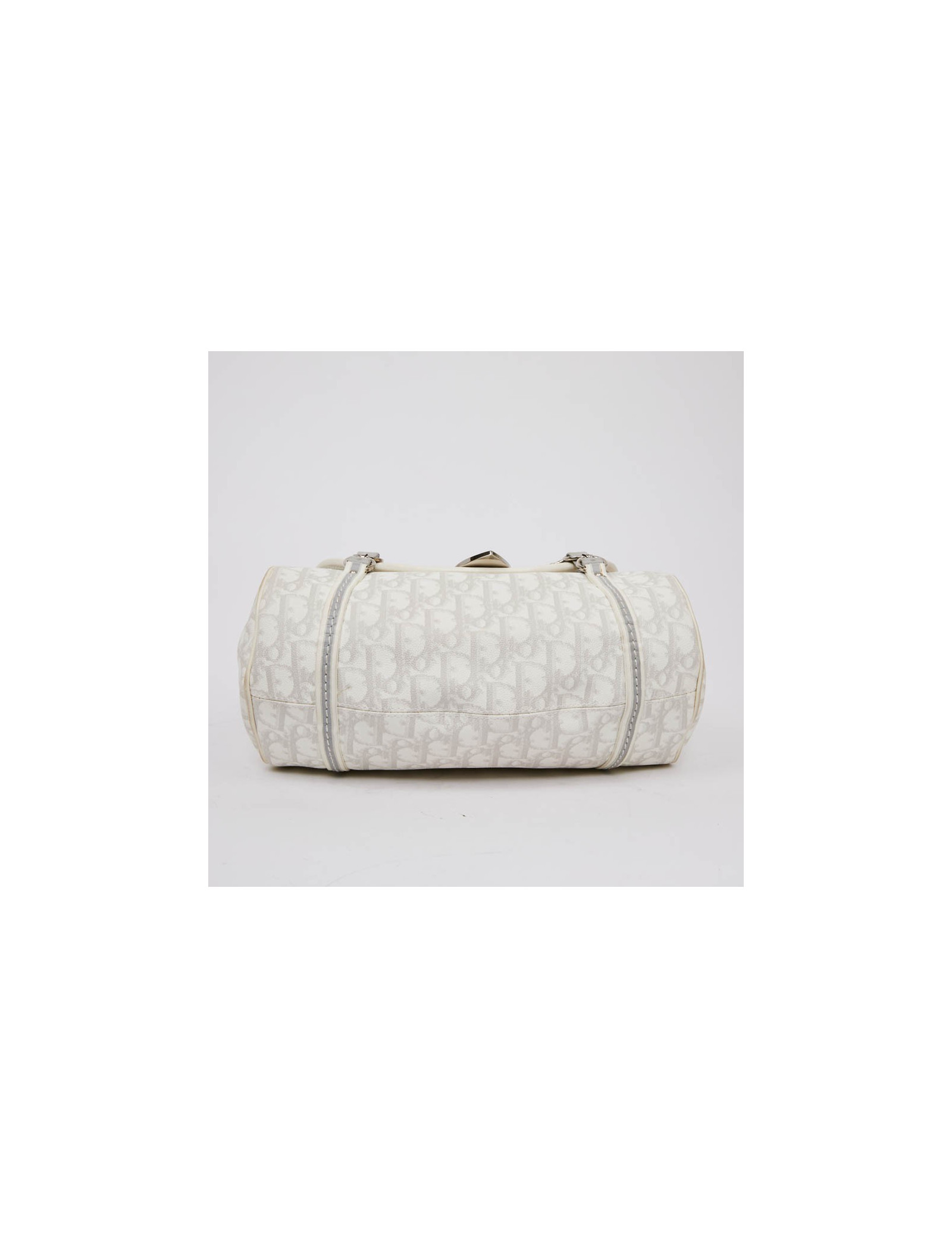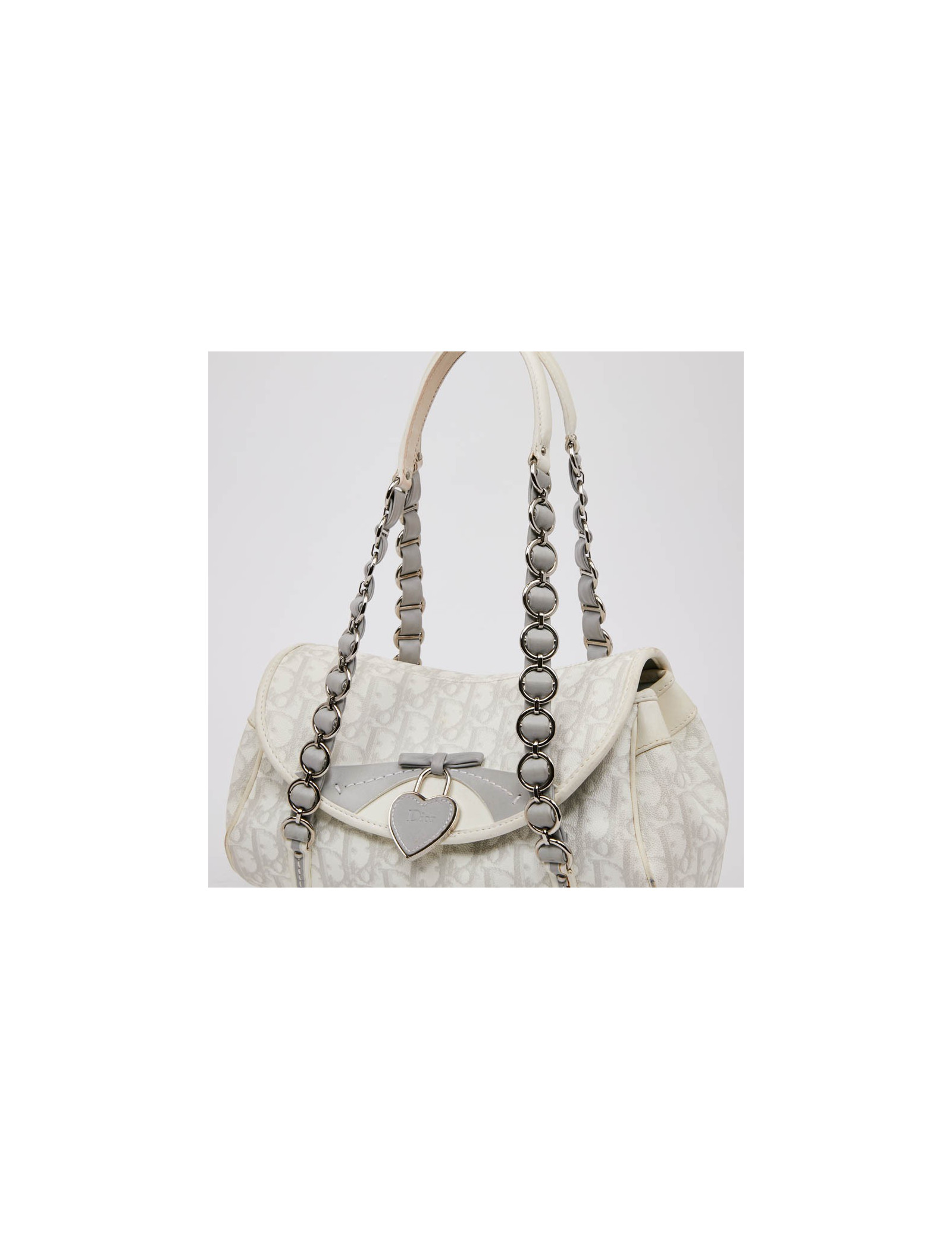 Ce petit sac DIOR, modèle Romantique est en toile blanc monogramme. L'accastillage est argent avec un fermoir en forme de coeur siglé "DIOR", en cuir gris. L'intérieur est doublé d'un tissu de satin avec une poche plate zippée. Il se porte à l'épaule. Ce sac de luxe d'occasion est en très bon état, quelques petites marques d'usure sur le passe-poil.