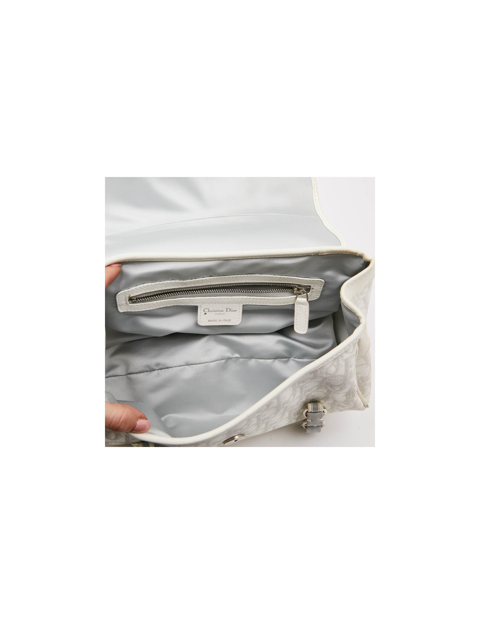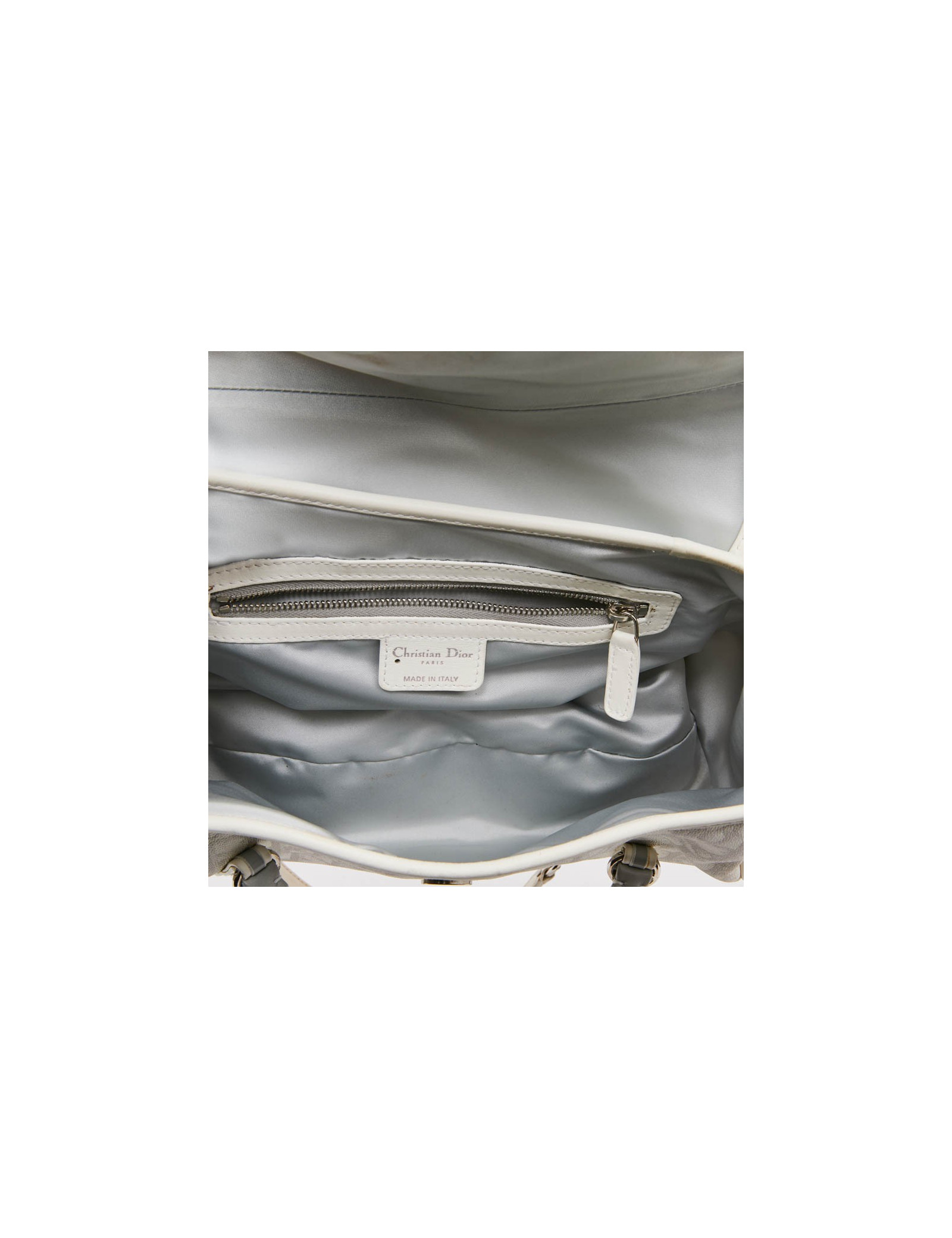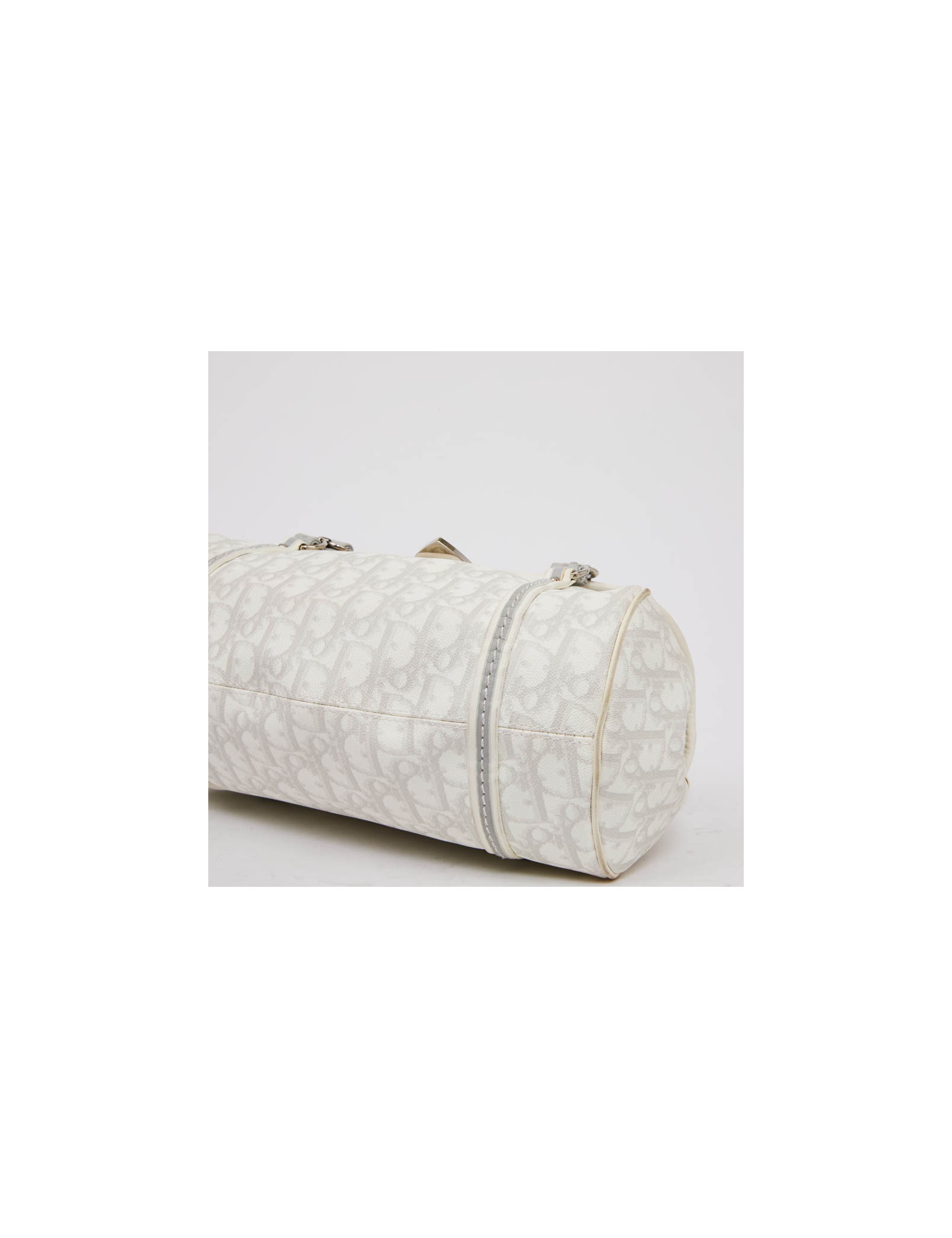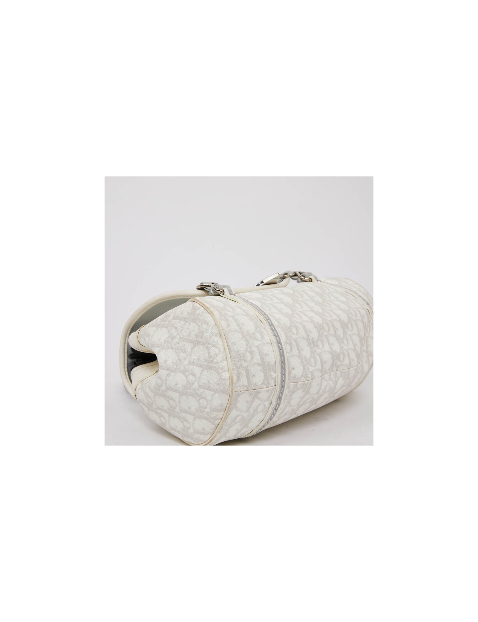 Ce petit sac DIOR, modèle Romantique est en toile blanc monogramme. L'accastillage est argent avec un fermoir en forme de coeur siglé "DIOR", en cuir gris. L'intérieur est doublé d'un tissu de satin avec une poche plate zippée. Il se porte à l'épaule. Ce sac de luxe d'occasion est en très bon état, quelques petites marques d'usure sur le passe-poil.