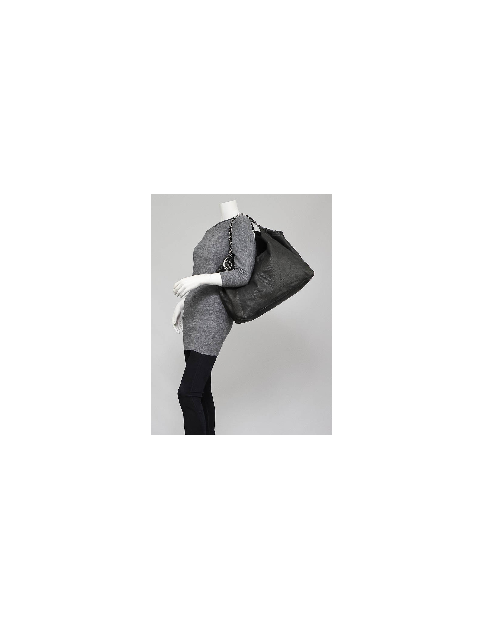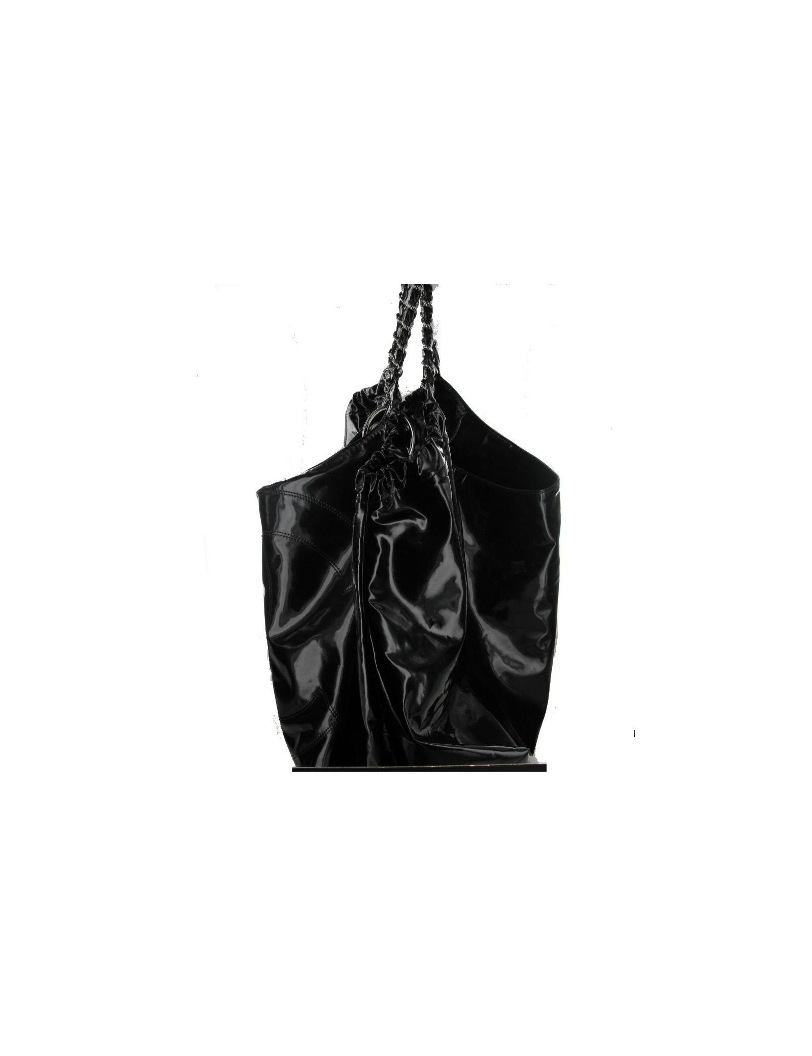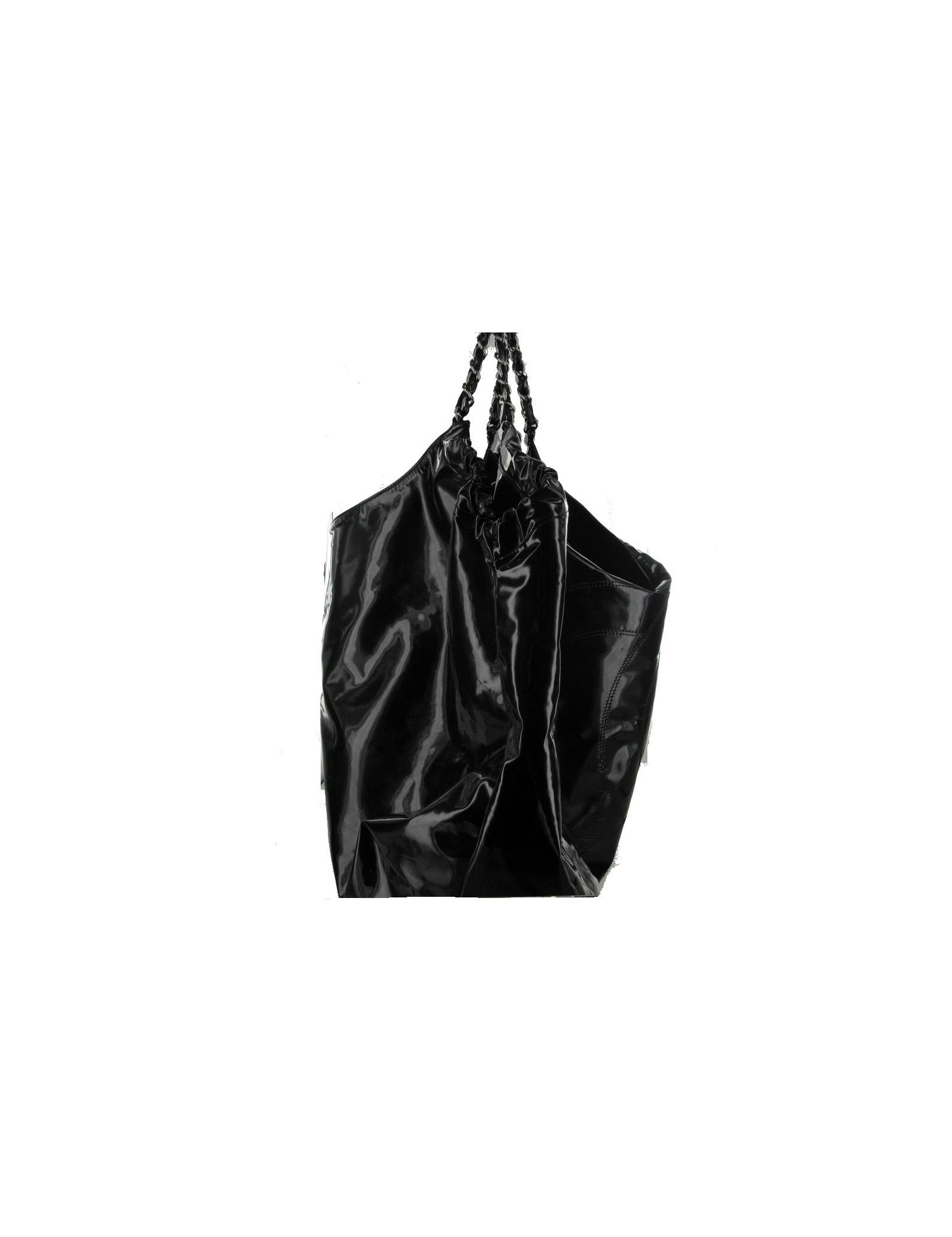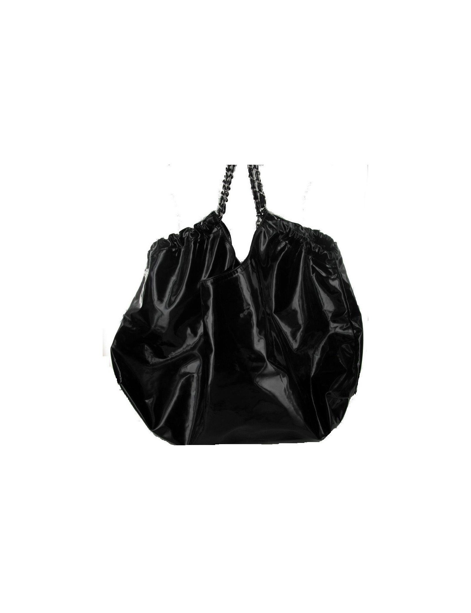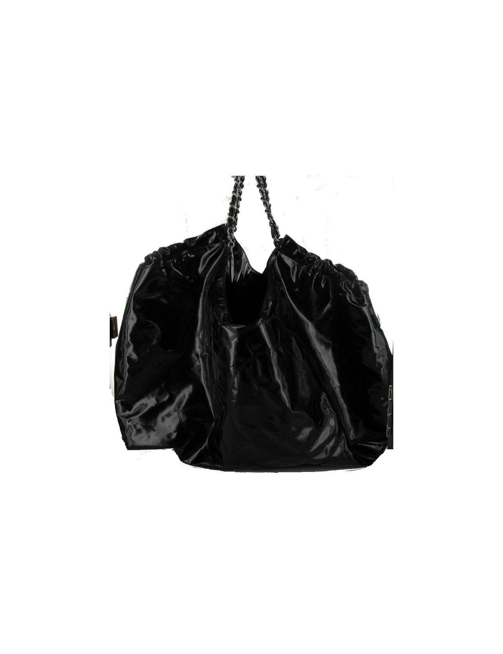 Sac CHANEL grand modèle en cuir vernis noir. Le sigle "CC" est brodé à l'avant du sac. Les anses s'entremêlent de cuir vernis et métal argenté brillant. Il se porte à l'épaule. Une chaînette, portant le sigle "CC" est accrochée à l'une des anses. L'intérieur est en tissu monogrammé "CHANEL", il y a 2 poches zippées dont une amovible. Il est en très bon état. Livré avec certificat d'authenticité.