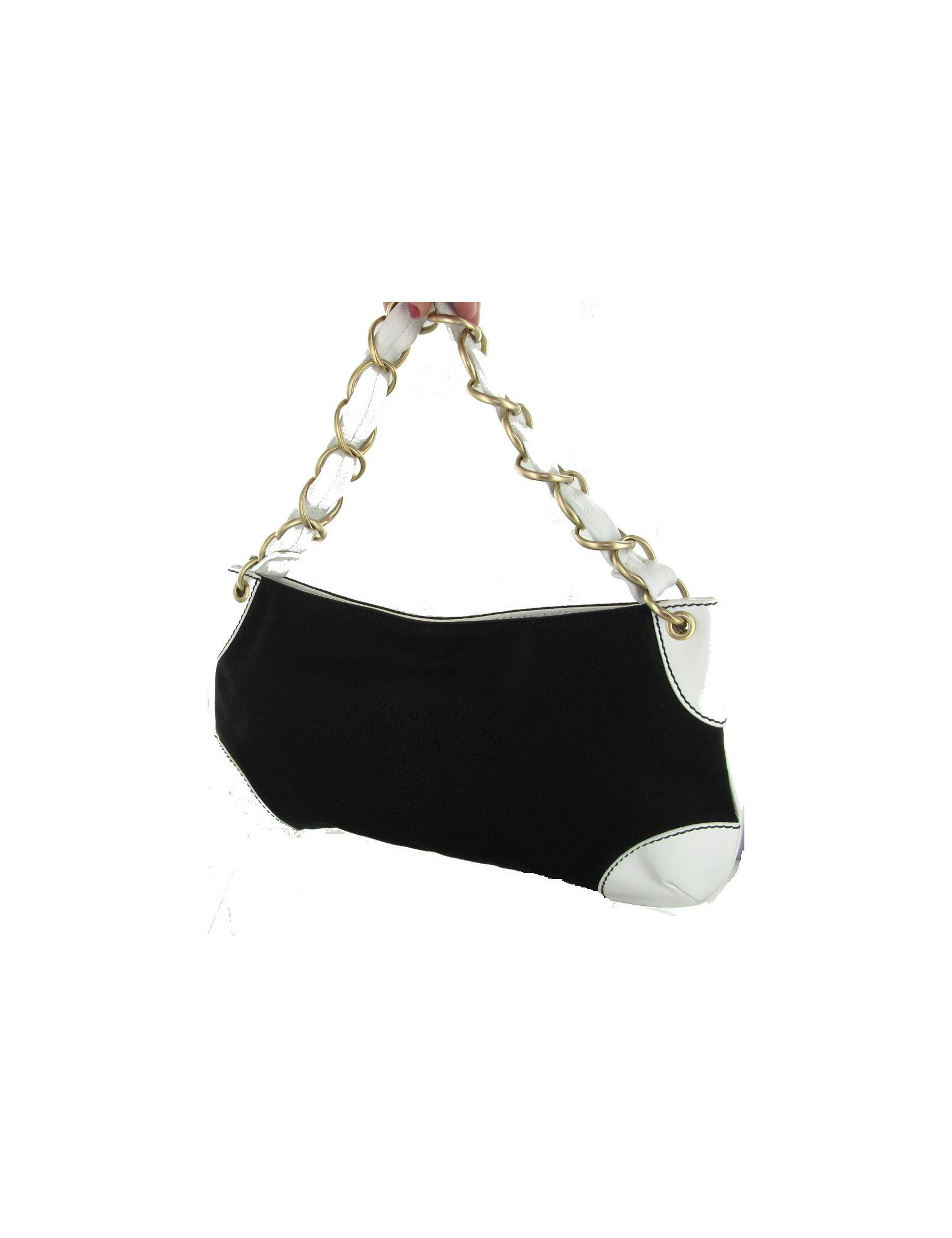 Ravissant sac pochette CHANEL, Collection "Croisière" en toile noir et cuir blanc. Il se porte à l'épaule. L'anse mêle cuir blanc et métal couleur or pâle.
