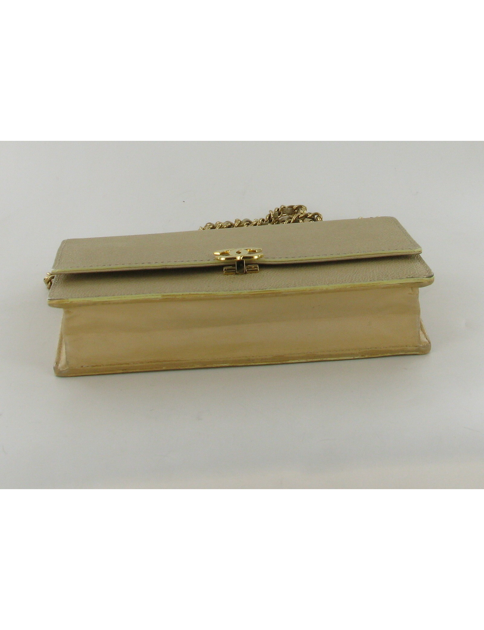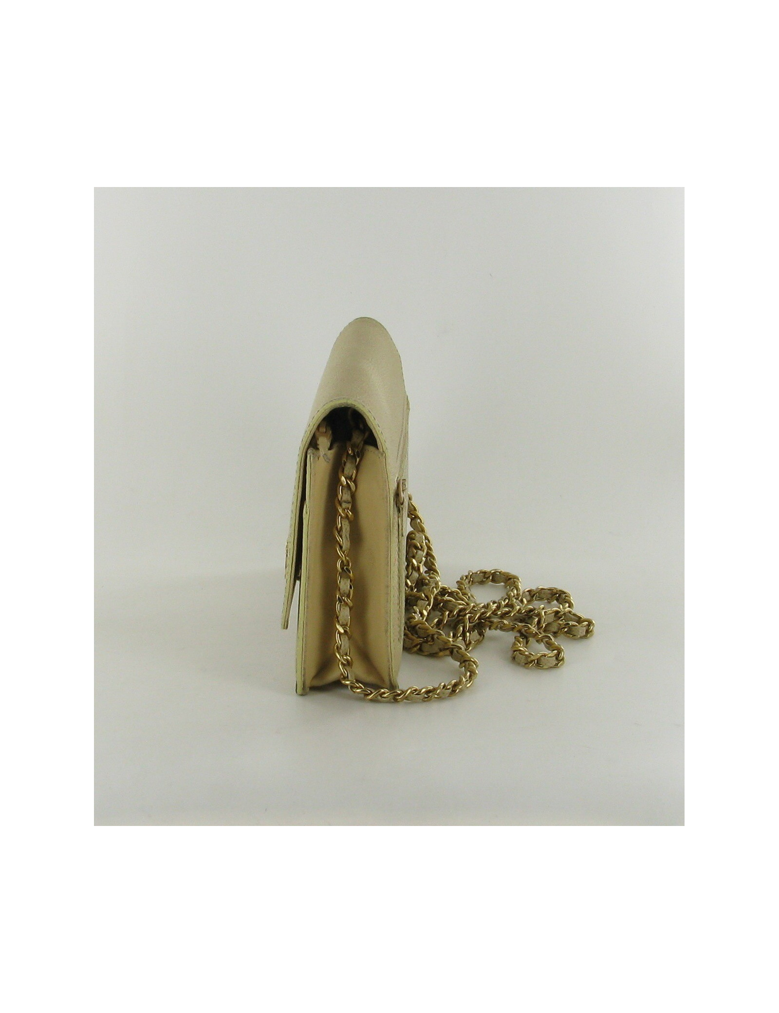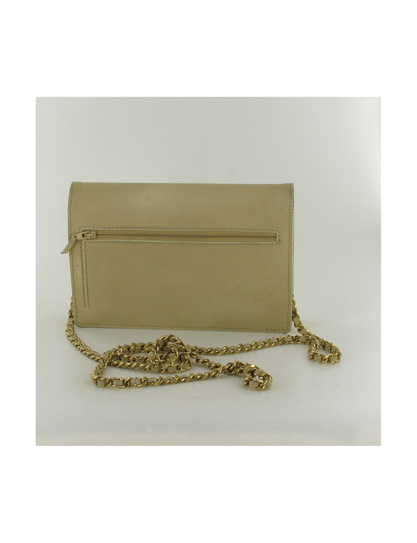 Allier l'utile et l'élégance avec ce petit sac-portefeuille CHANEL en cuir beige. Les garnitures sont en métal doré. Le fermoir représente le sigle "CC". Il se porte uniquement en bandoulière. 1 poche zippée à l'arrière du sac. L'intérieur en tissu beige a: 4 poches dont 2 zippées, 6 fentes pour les cartes. La couleur beige étant une couleur fragile, ce sac a de légères tâches. L'hologramme est 5617****. Livré dans sa boîte et son dustbag.