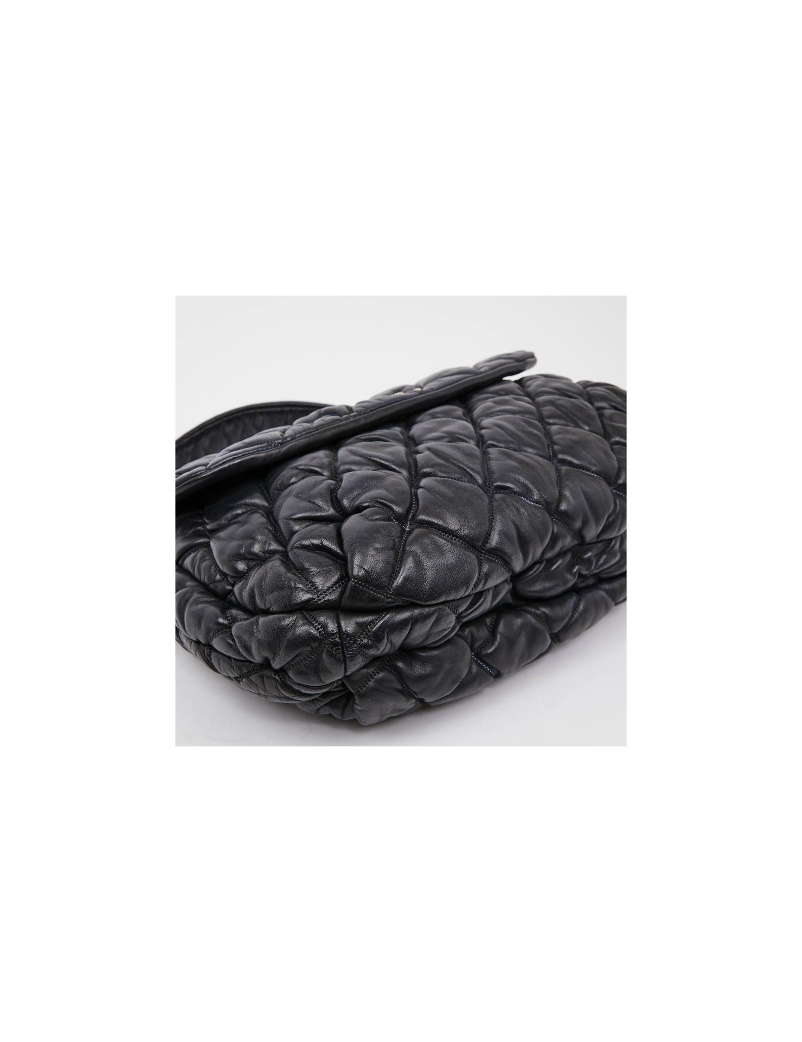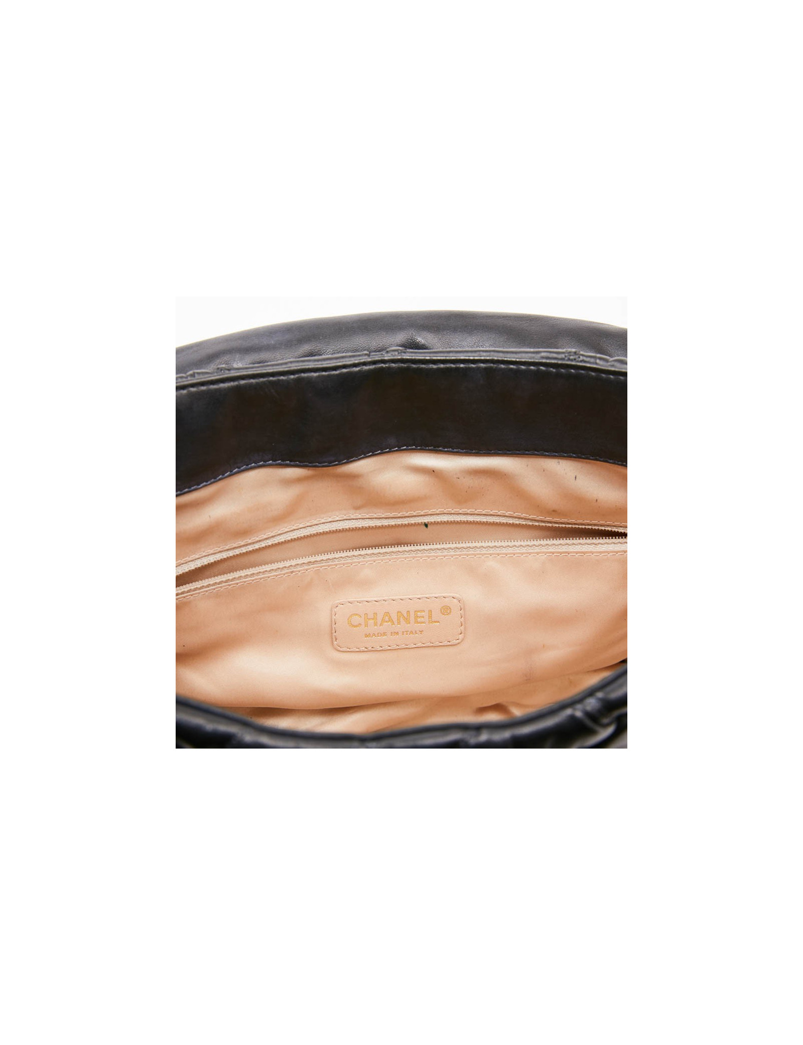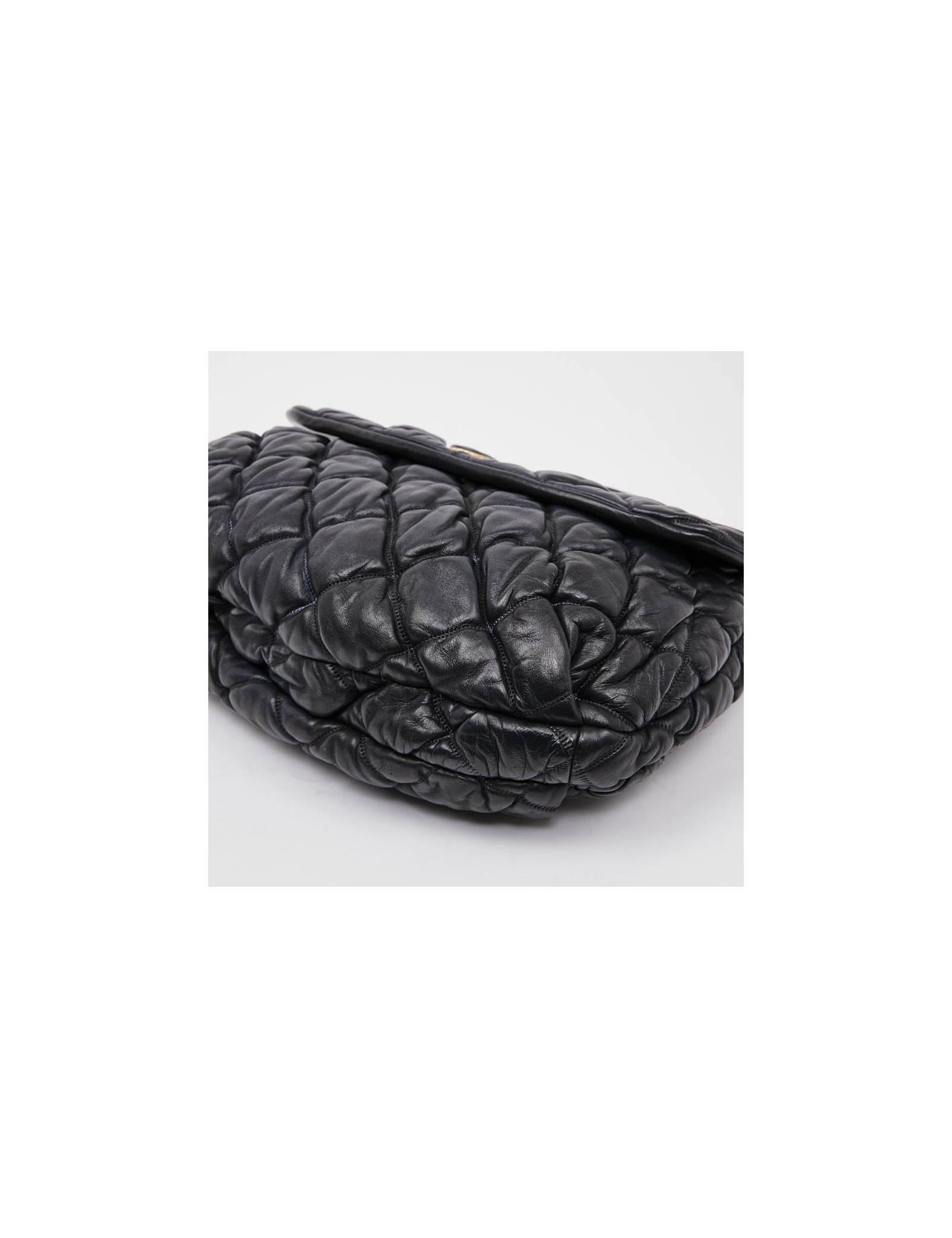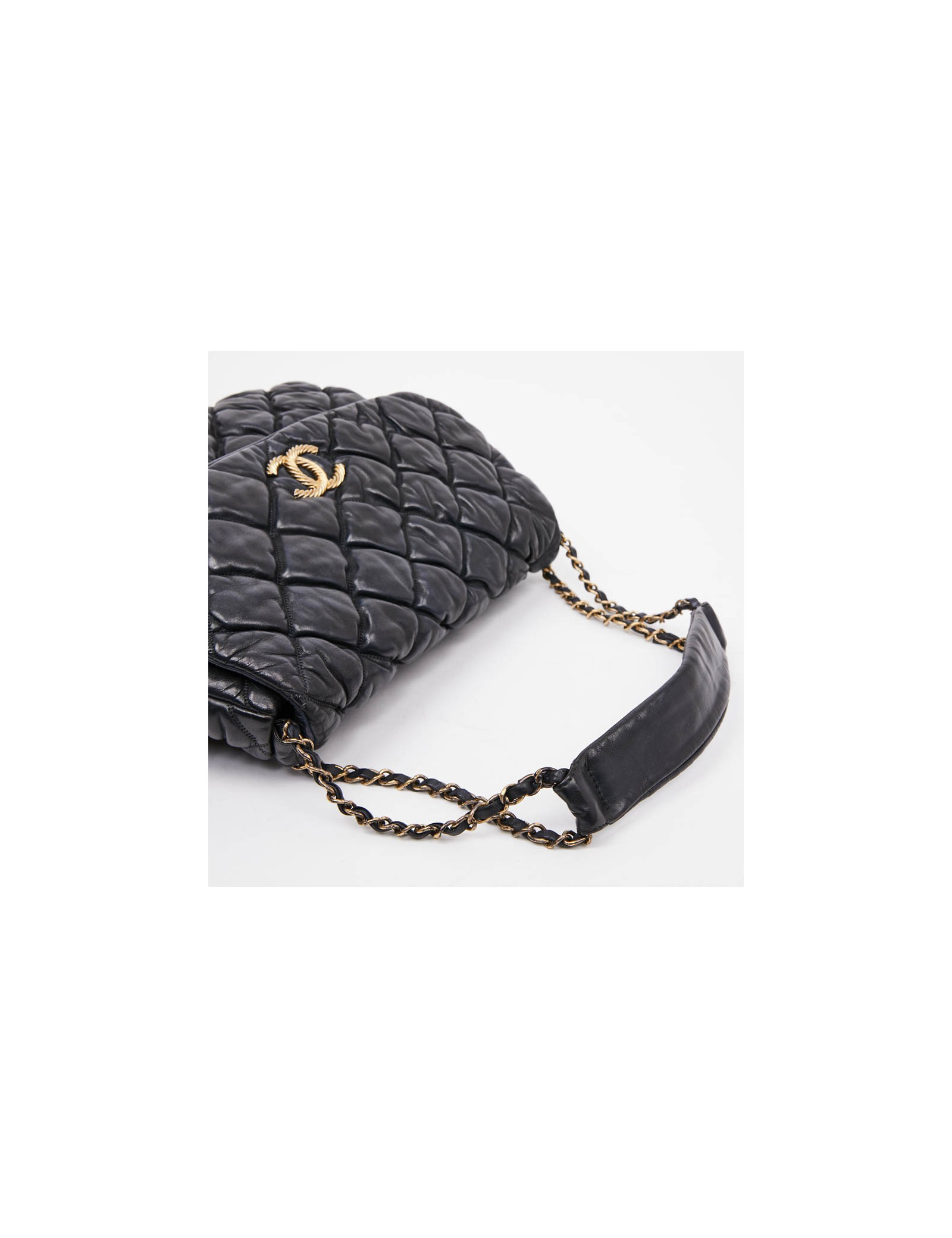 ICONIQUE. Sac d'occasion CHANEL en cuir d'agneau bleu nuit matelassé. Le sigle "CC" travaillé est en métal doré. Fermeture par bouton pression. La doublure est en satin avec 3 poches plates dont une grande zippée. Il se porte à l'épaule. Il est en très bon état aucune usure des coins mais sur la doublure on dénombre des nombreuses taches, voir photos.