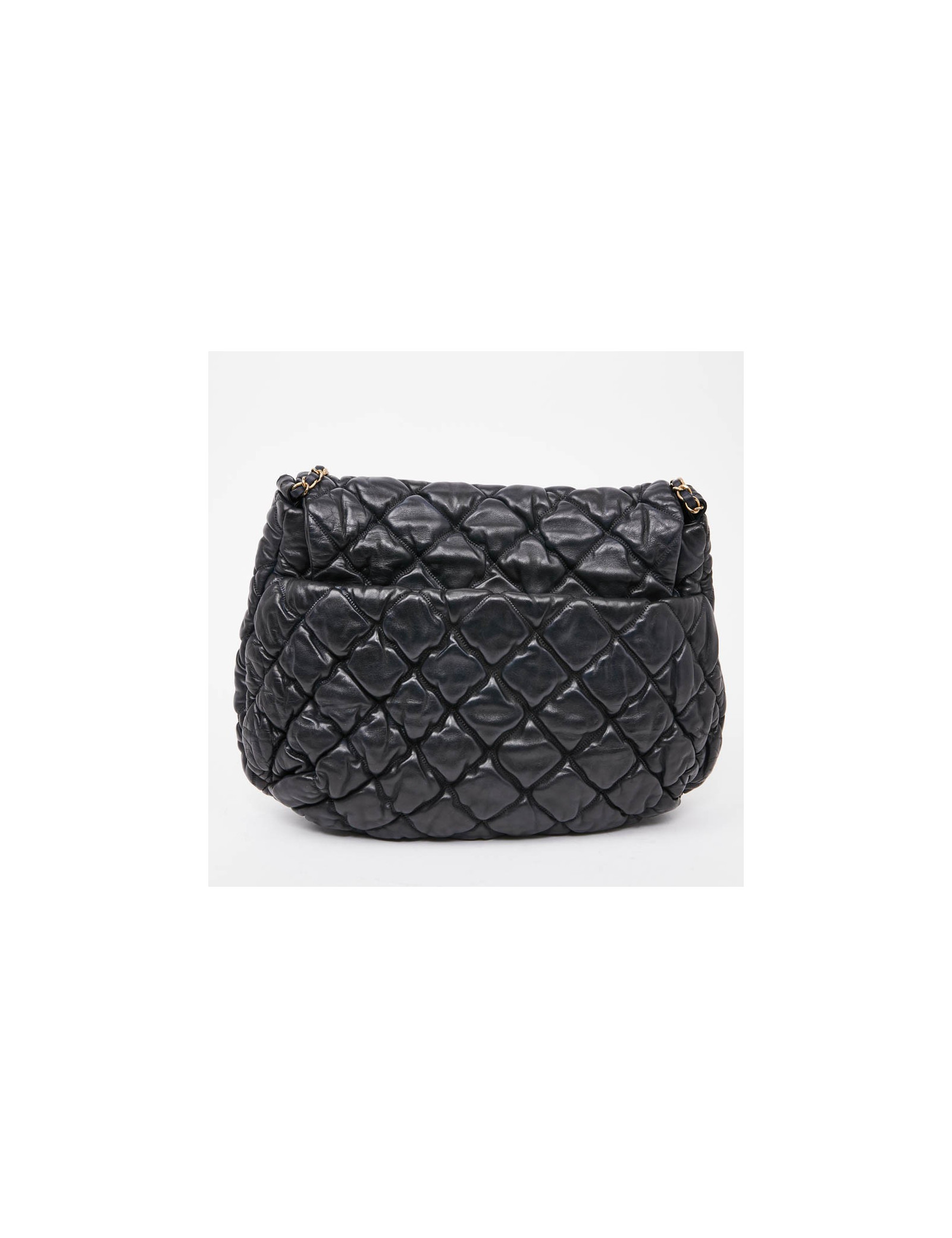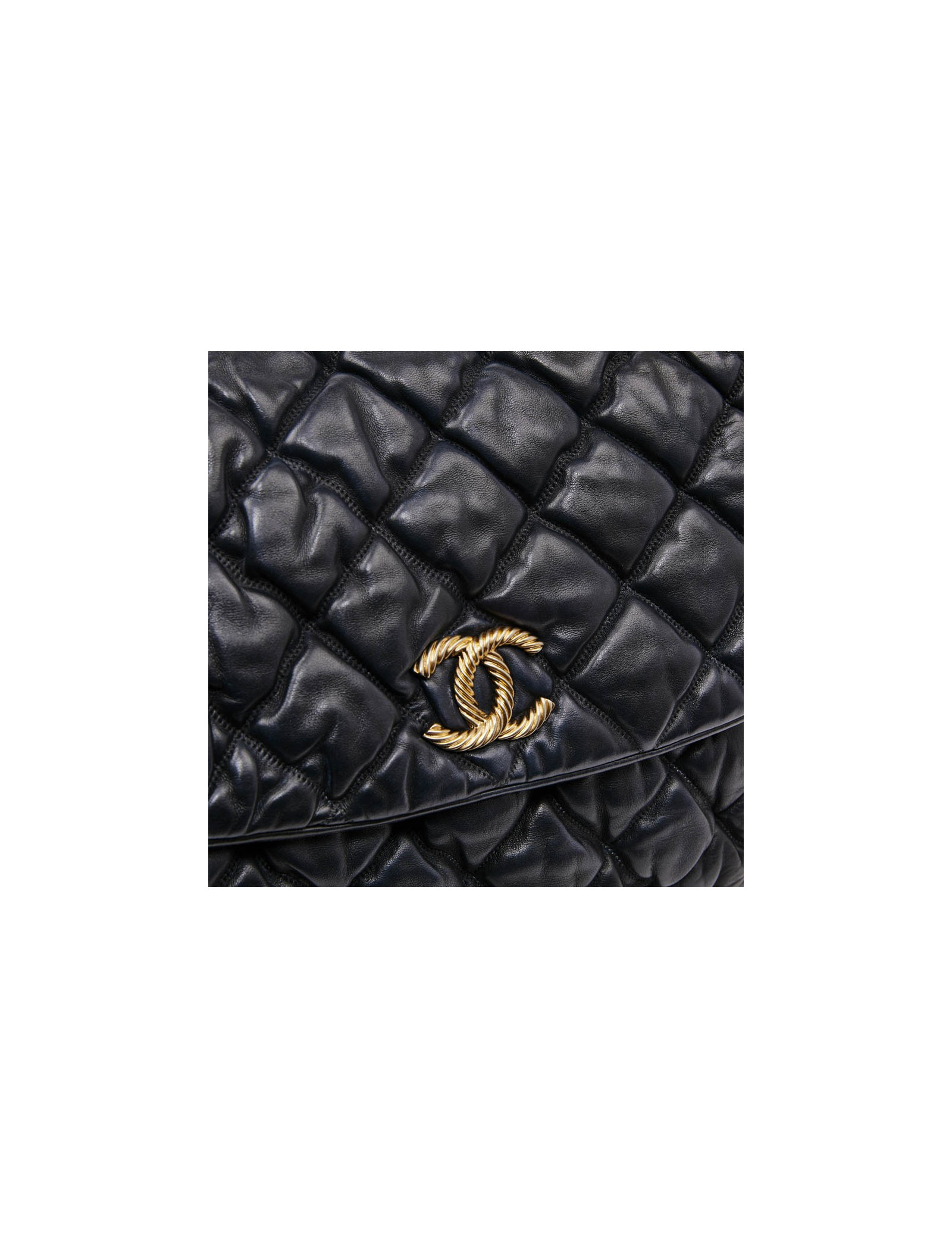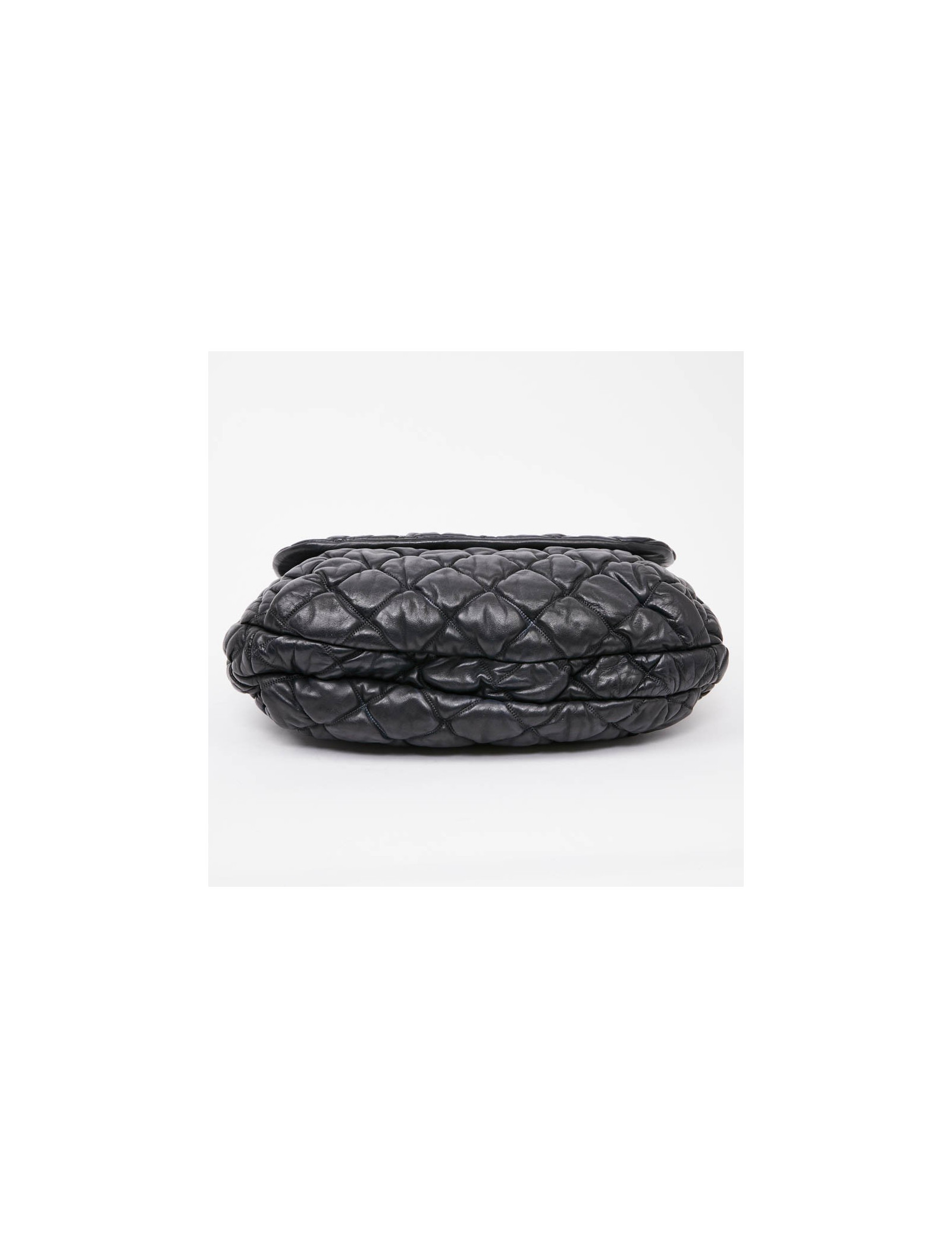 ICONIQUE. Sac d'occasion CHANEL en cuir d'agneau bleu nuit matelassé. Le sigle "CC" travaillé est en métal doré. Fermeture par bouton pression. La doublure est en satin avec 3 poches plates dont une grande zippée. Il se porte à l'épaule. Il est en très bon état aucune usure des coins mais sur la doublure on dénombre des nombreuses taches, voir photos.