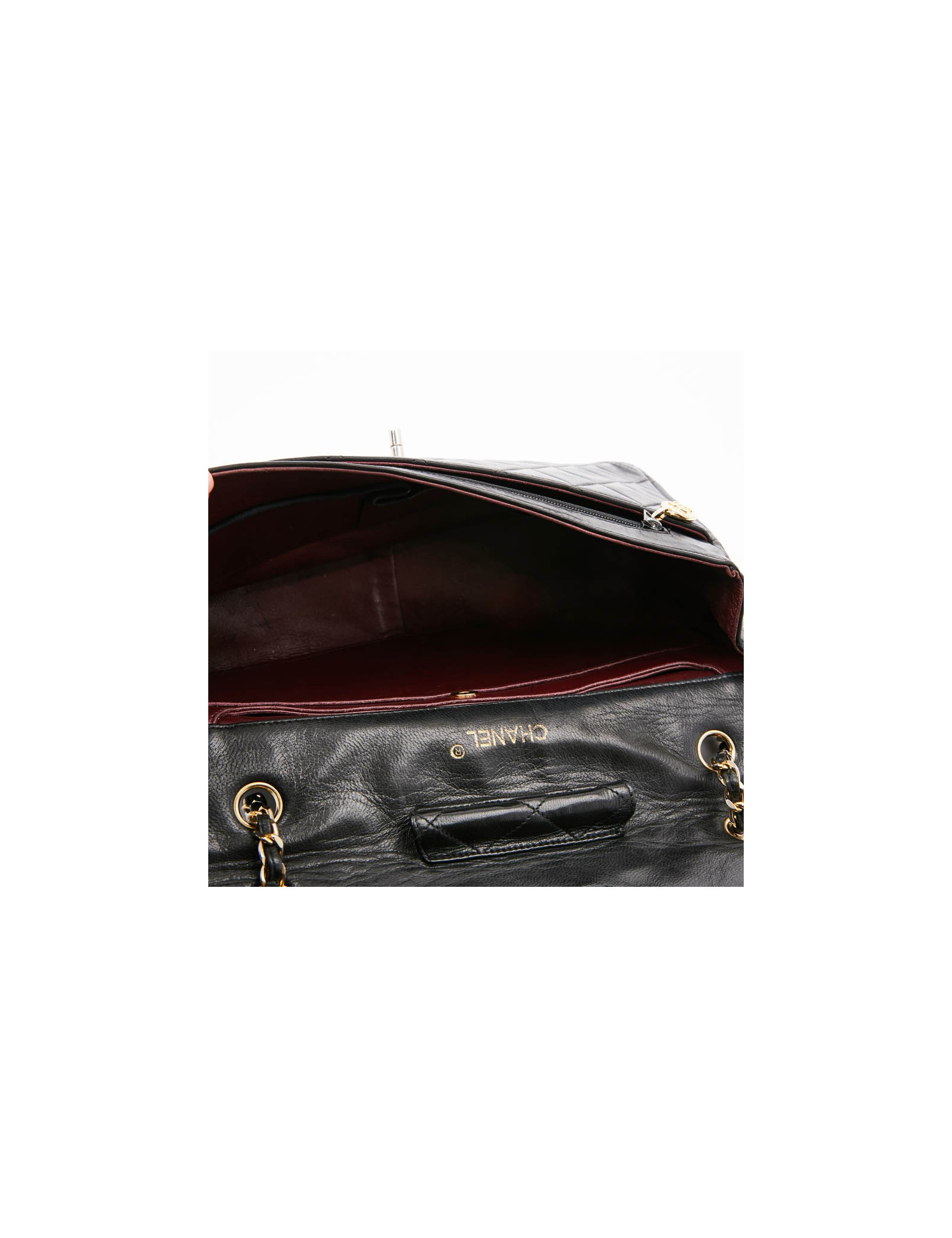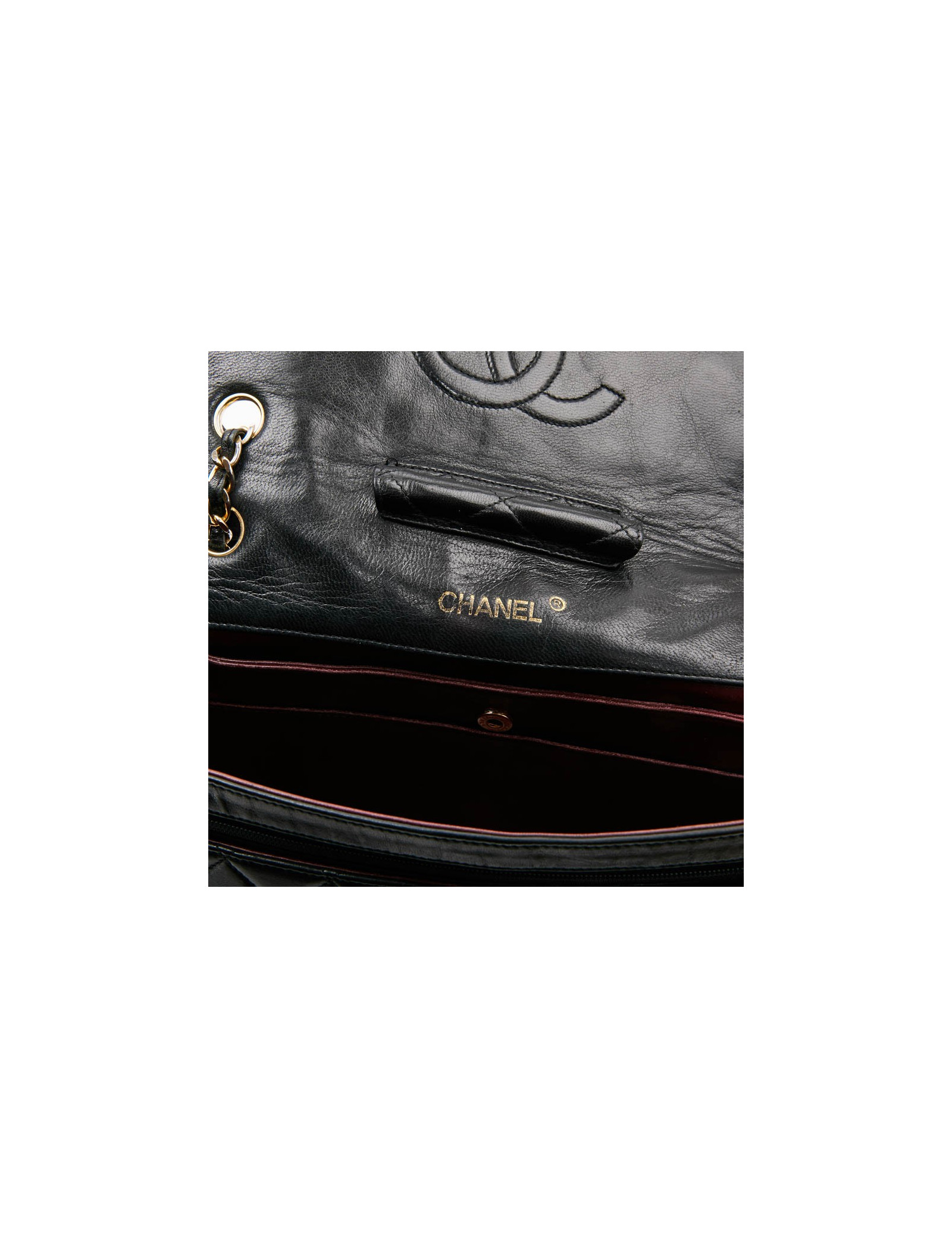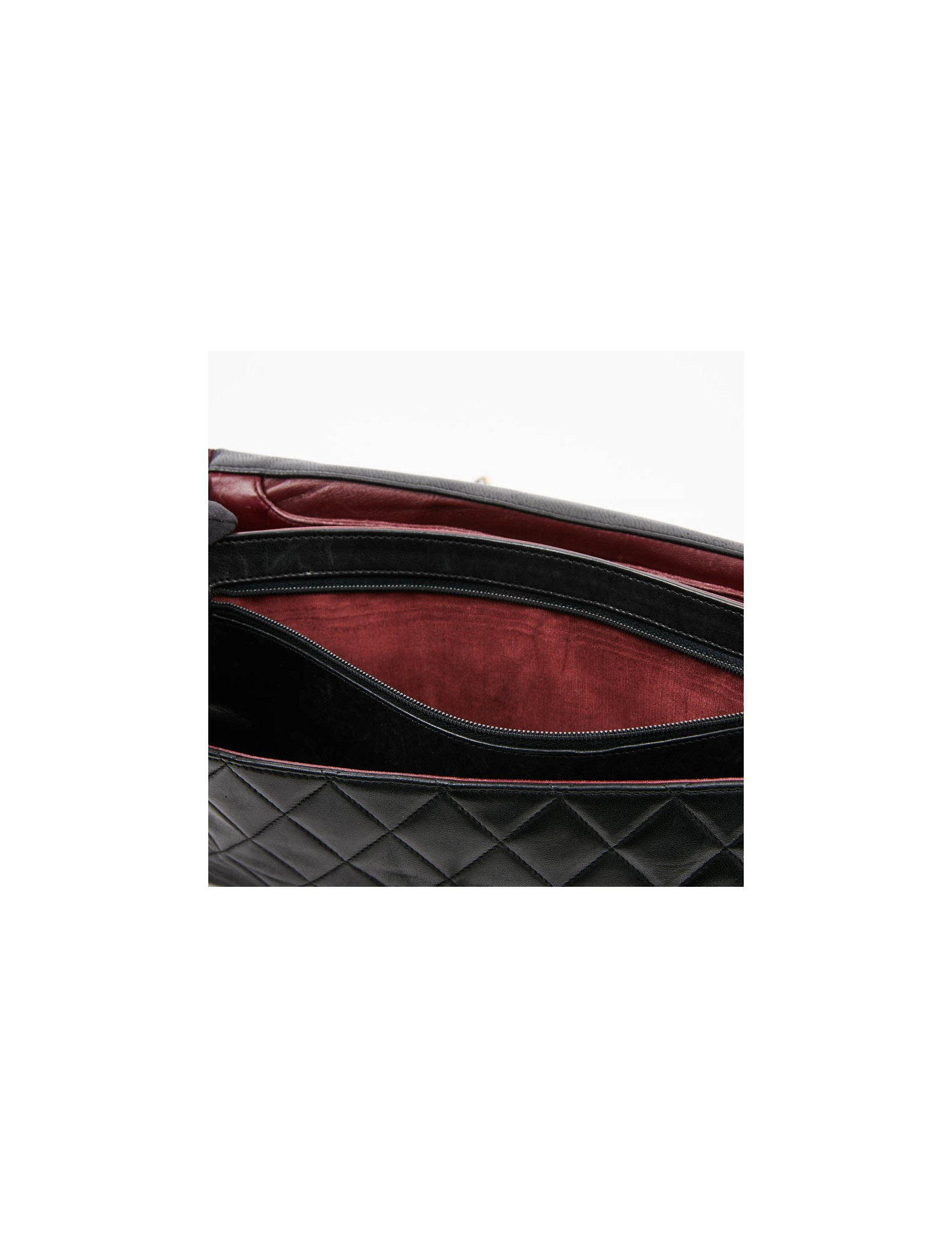 Ce Timeless en cuir d'agneau matelassé noir Chanel, Vintage a un seul rabat. Initialement il avait un porte-monnaie. La doublure est en cuir bordeaux avec plusieurs poches dont une avec fermeture éclair. Se porte à l'épaule ou crossover. Il est en très bon état d'usage.