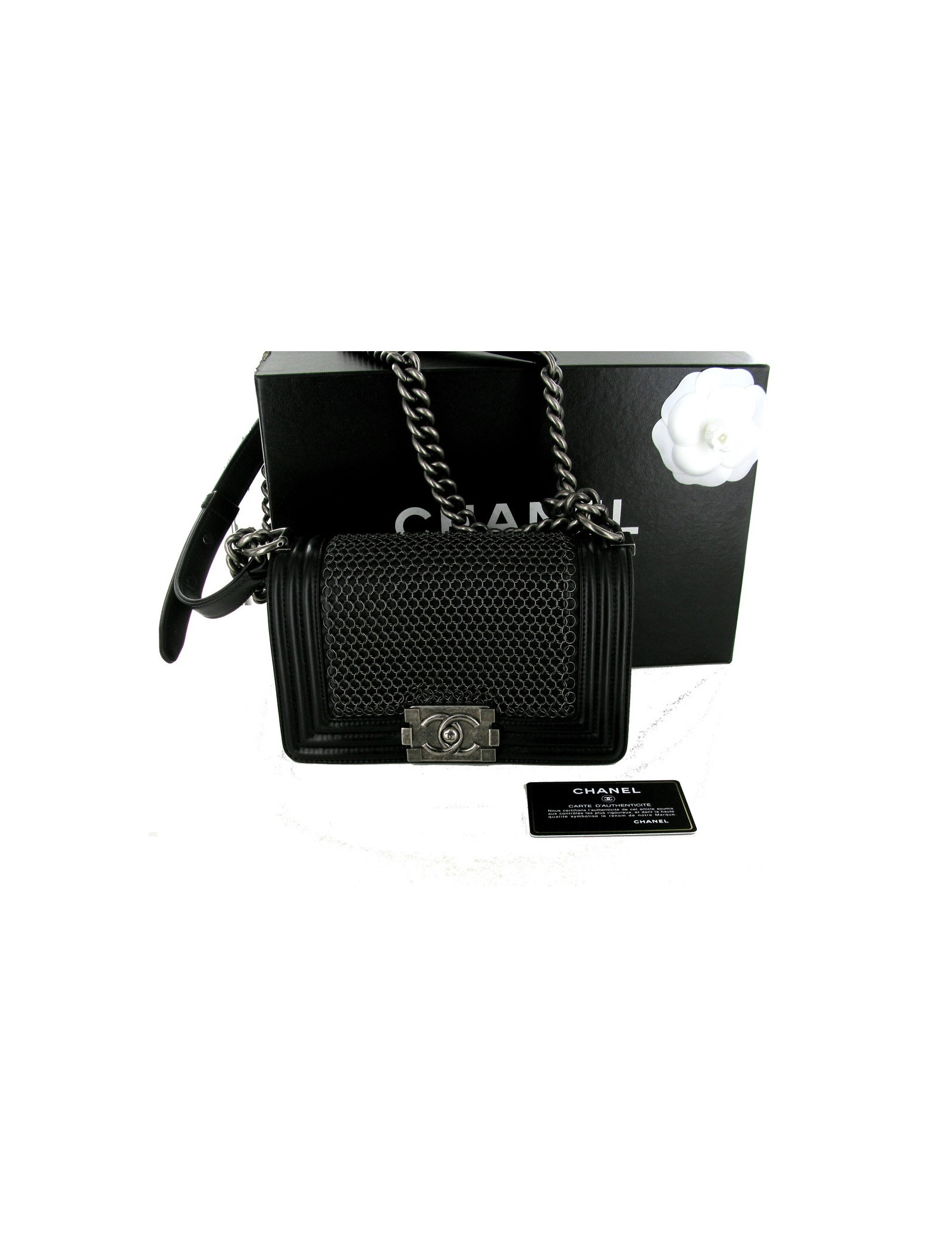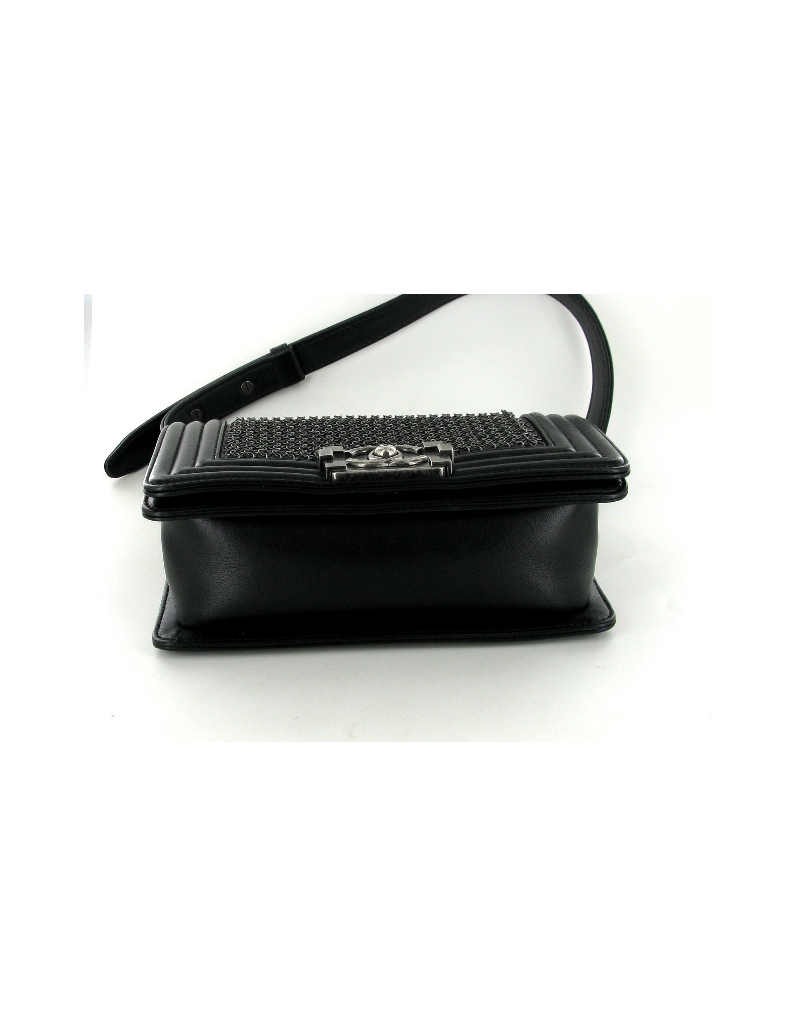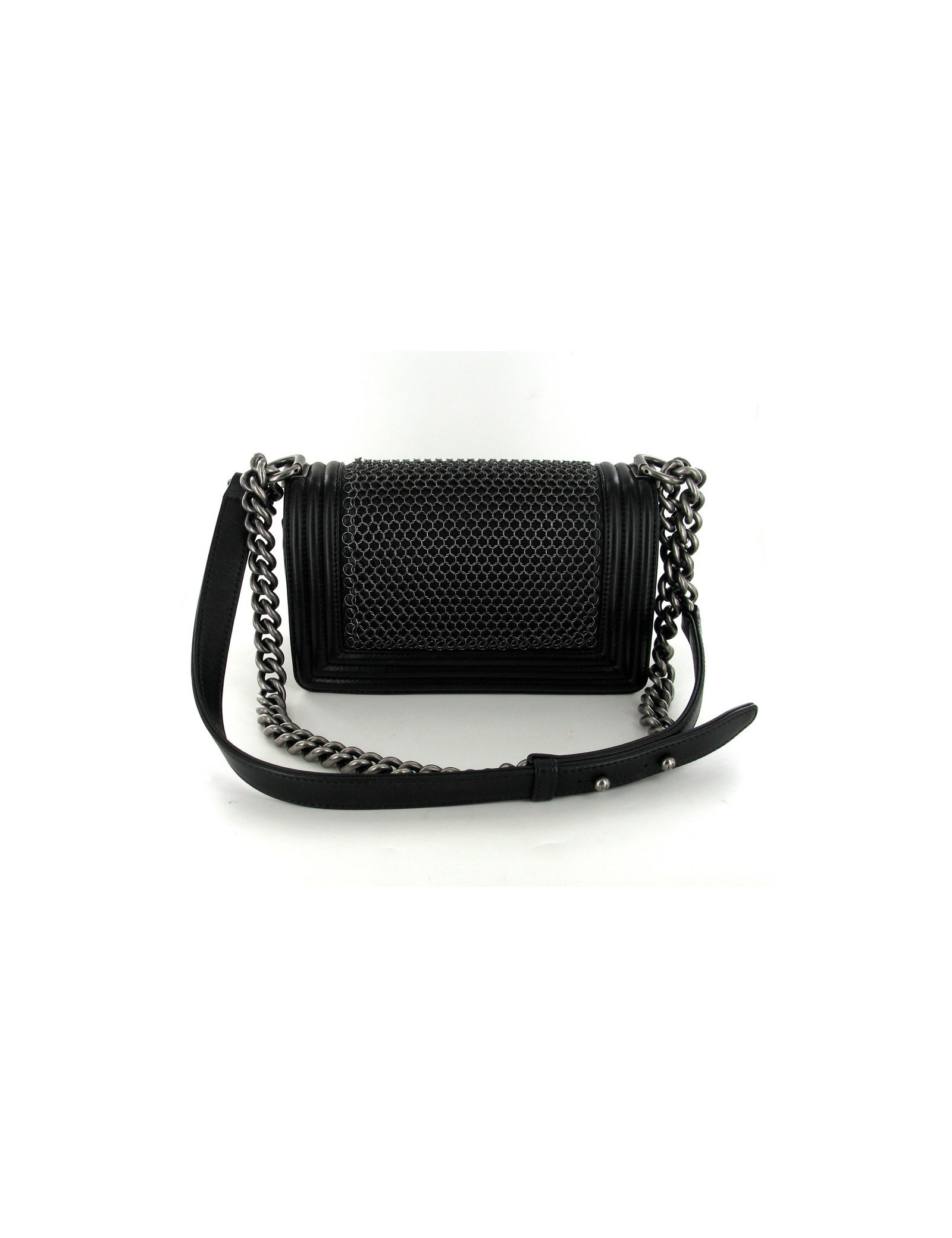 Boy CHANEL en cuir noir cotte de mailles