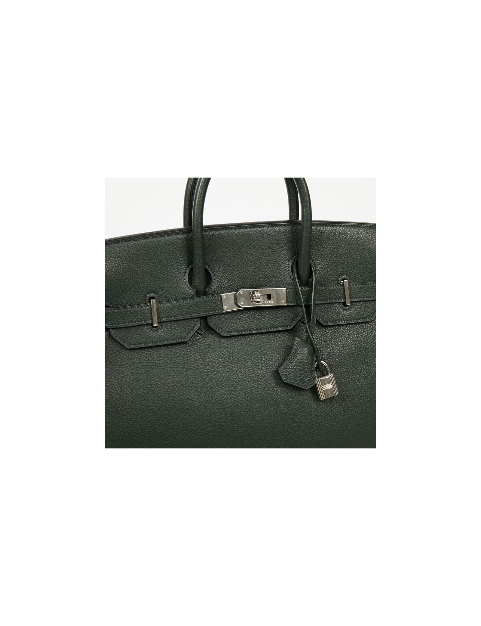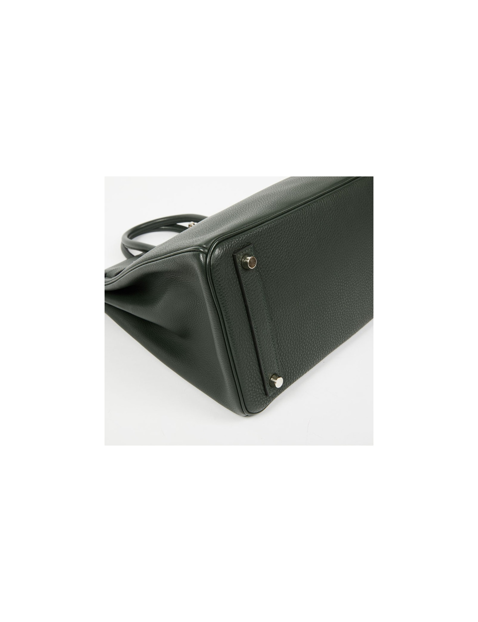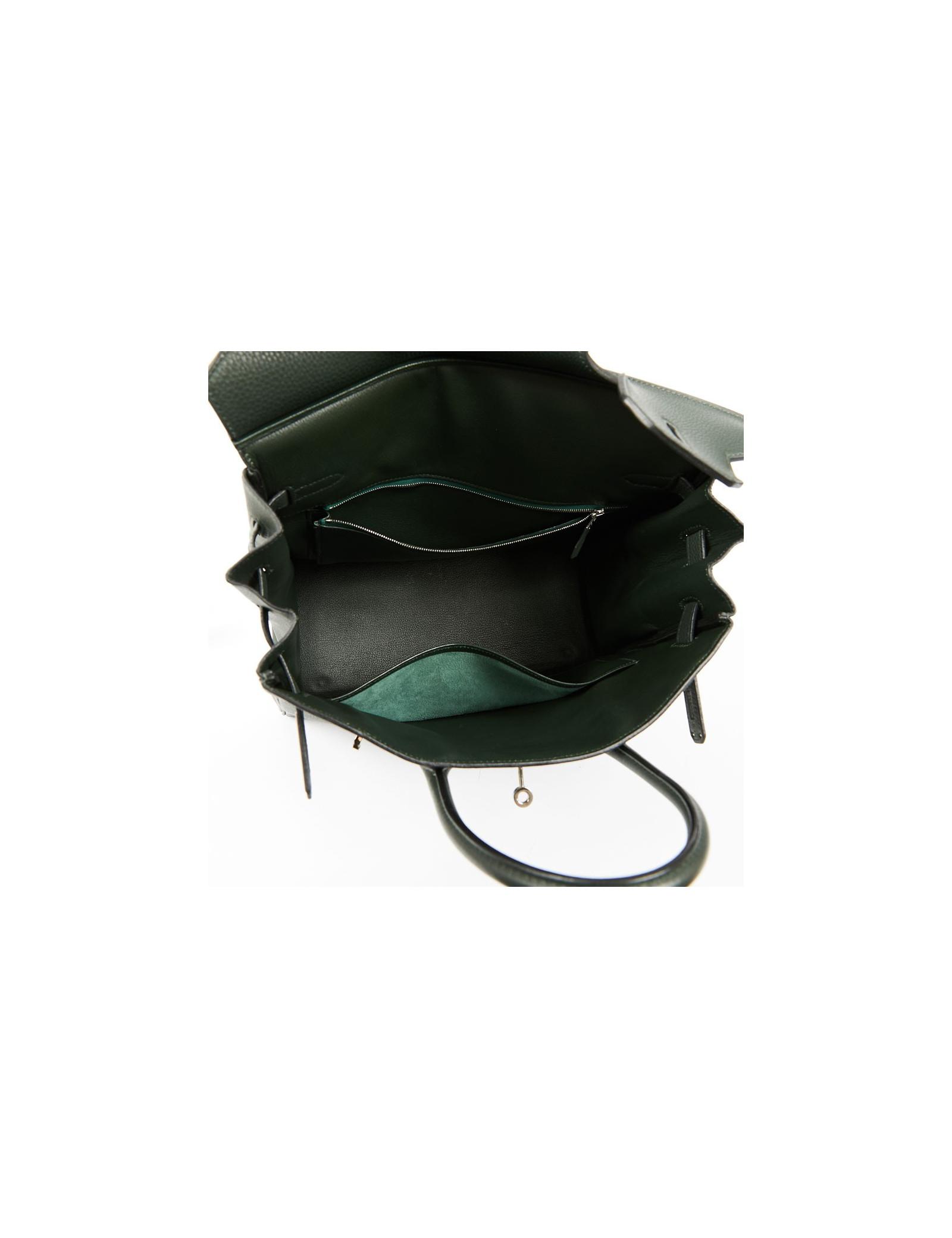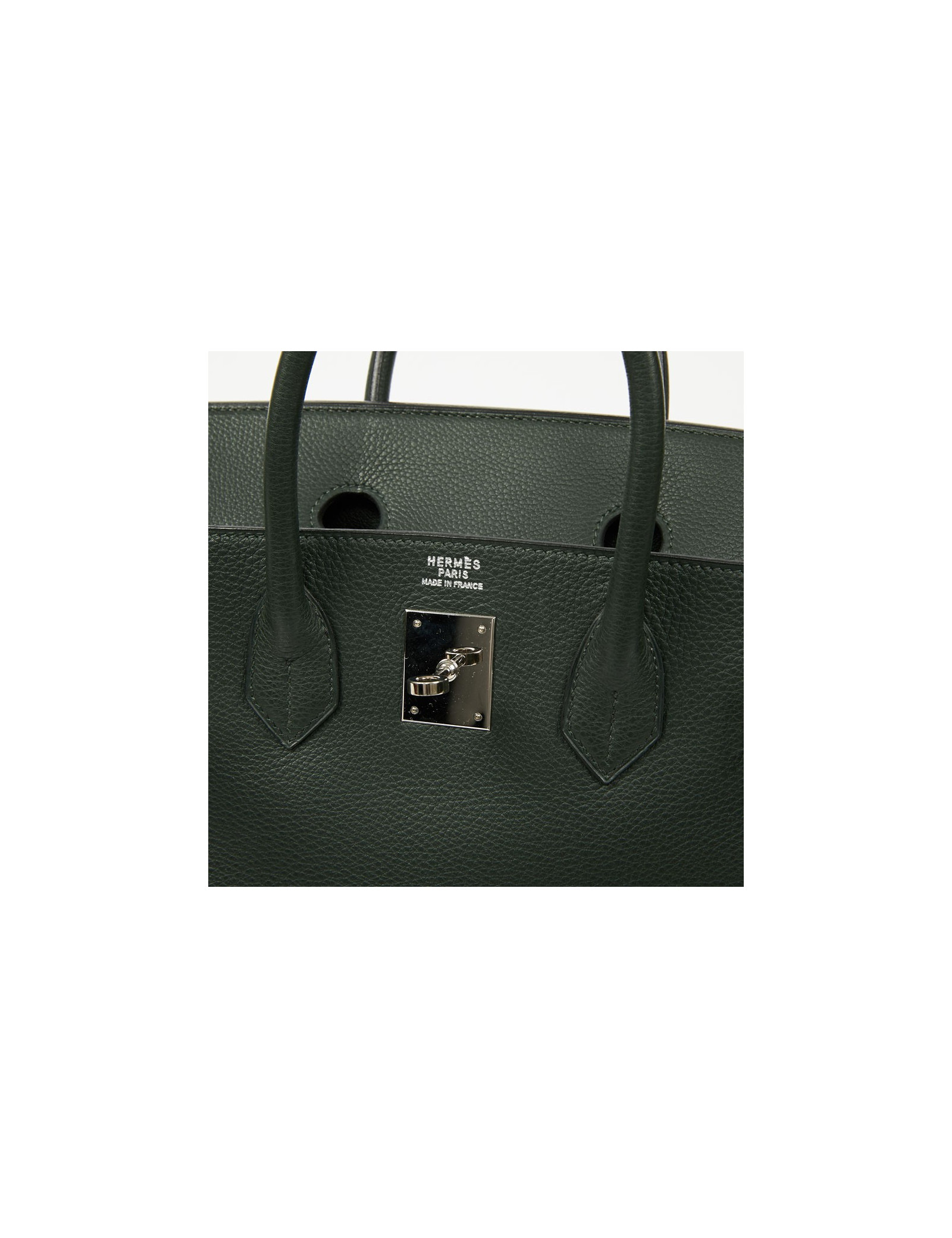 Pièce très recherchée par les amateurs de la Maison HERMES, ce magnifique sac H A C, Haut à Courroies taille 32 est en cuir de veau Togo vert olive. Sa garniture est en métal argent palladié. Il a sa tirette, sa clochette, son cadenas et ses clefs. L'intérieur est en cuir vert olive avec une poche plate et une poche zippée. Il se porte à la main par une double poignée. Porté seulement une fois, il est en parfait état.
