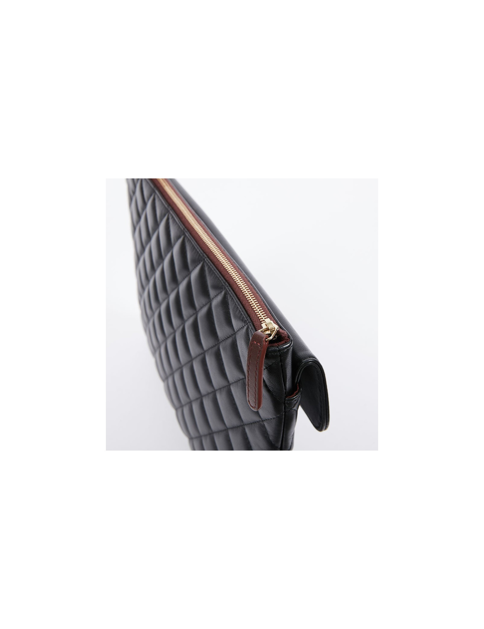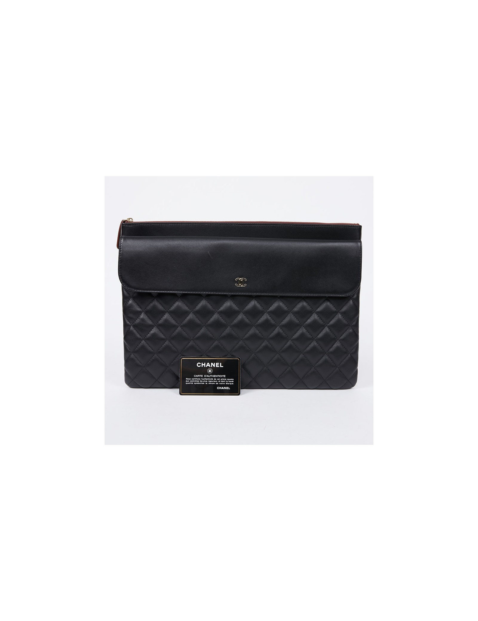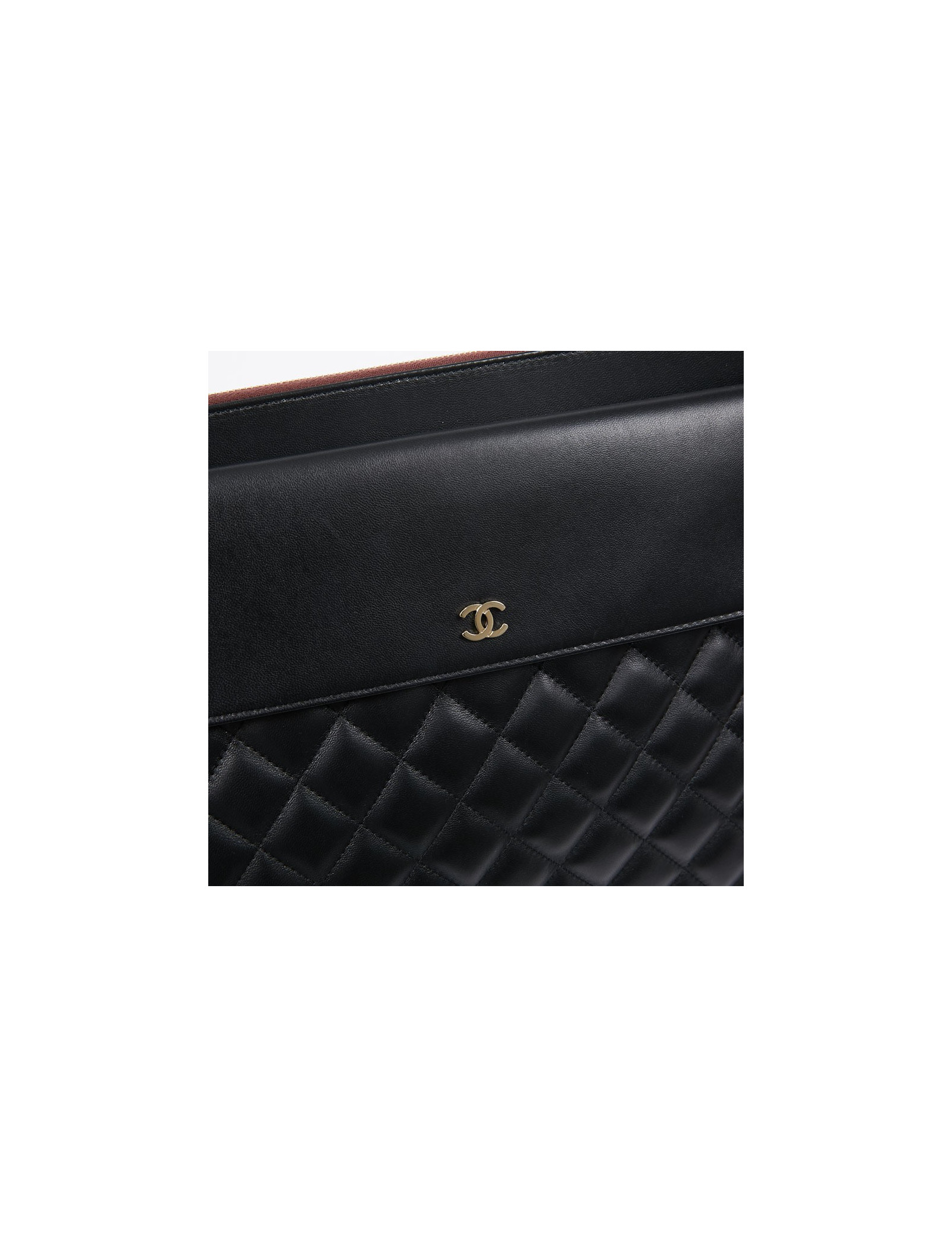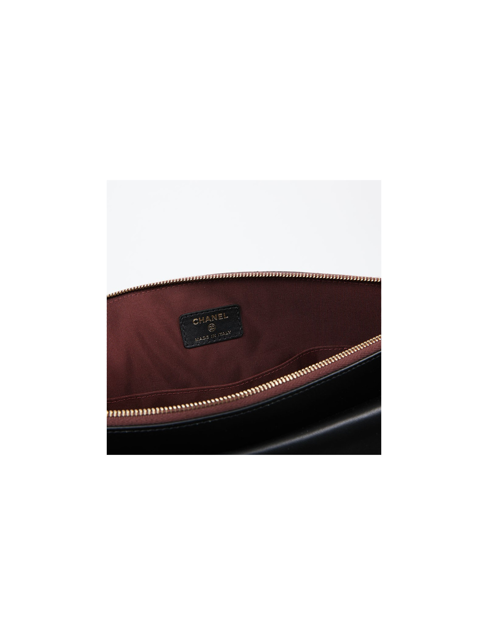 Superbe occasion ! Cette pochette CHANEL est en cuir d'agneau lisse noir. La surpiqure noire lui donne un relief matelassé. Elle est doublé en tissu bordeaux (les deux couleurs phares de la marque). La pochette a différents compartiments de rangement. La principale a une fermeture éclair et la seconde a un aimant agrémenté d'un "CC". Entre les deux une poche plaquée. La bijouterie est dorée. Elle n'a jamais été portée.