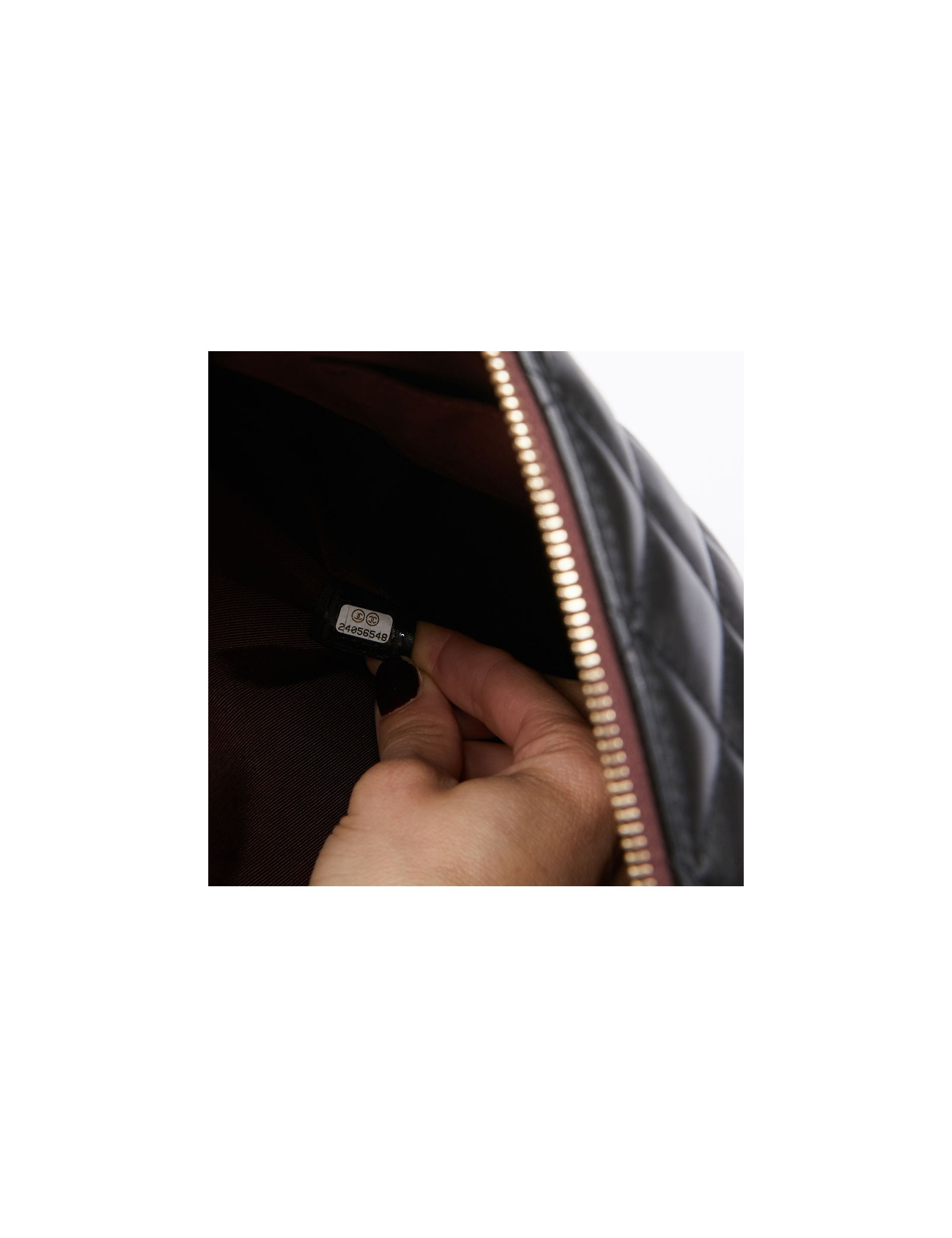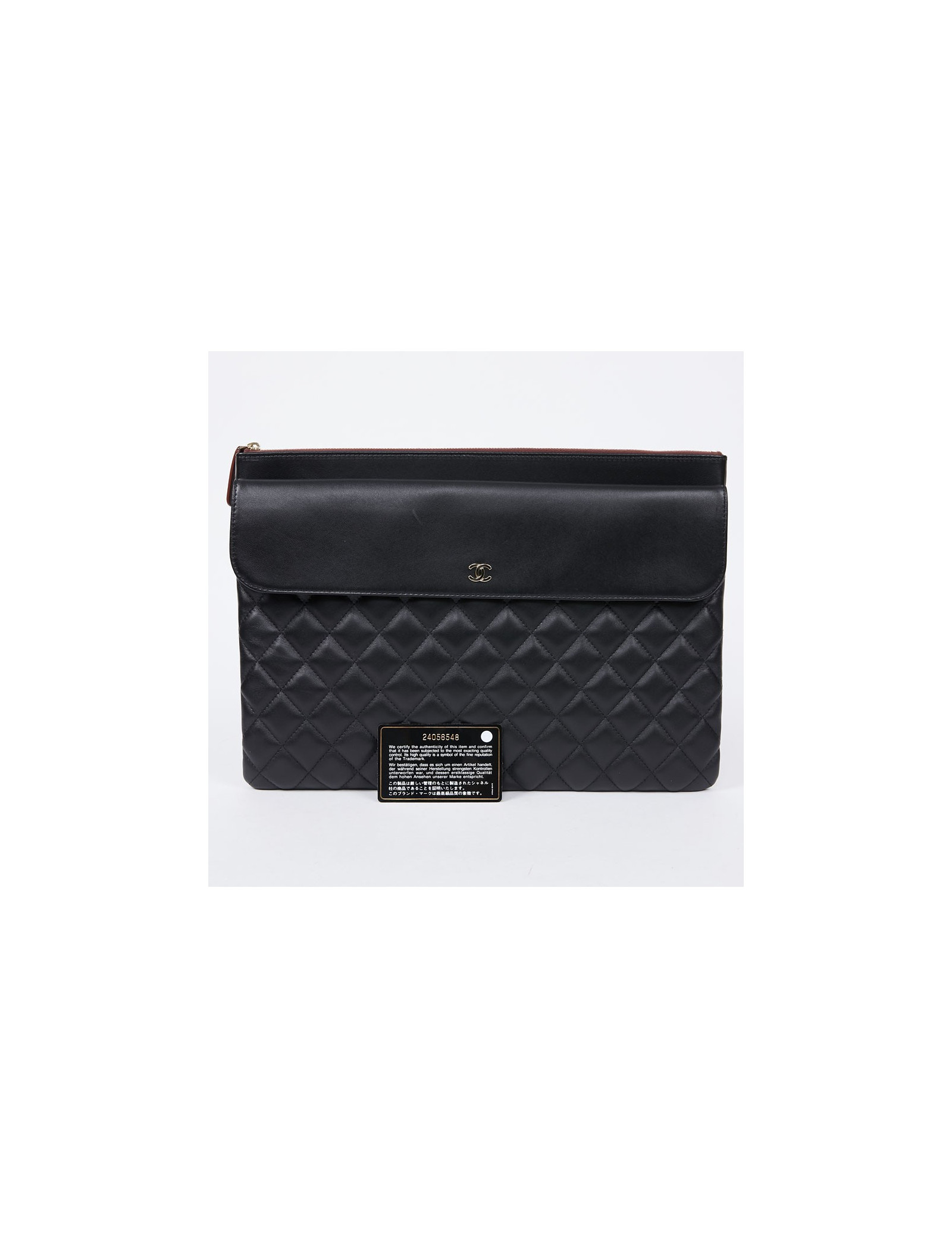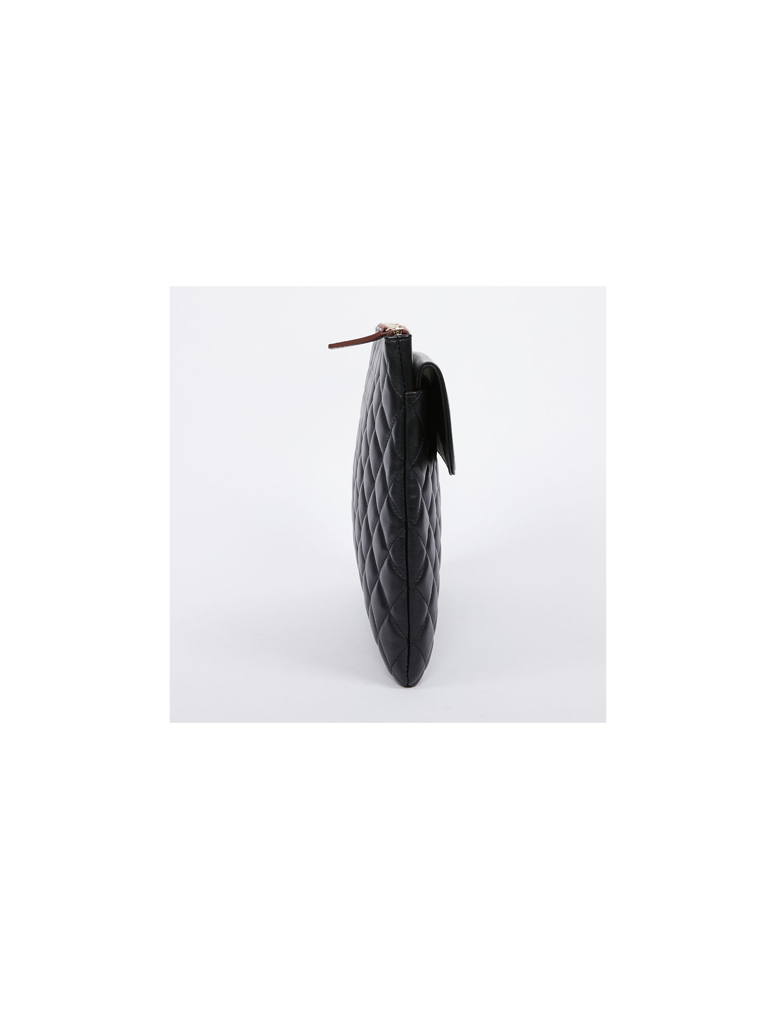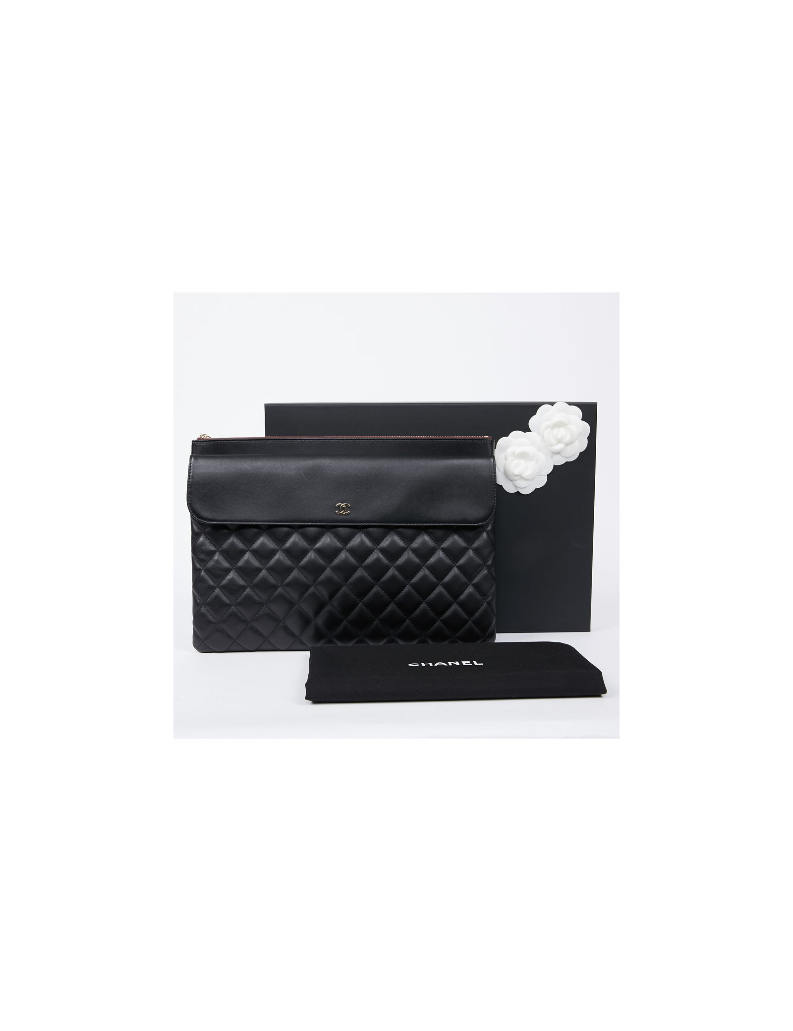 Superbe occasion ! Cette pochette CHANEL est en cuir d'agneau lisse noir. La surpiqure noire lui donne un relief matelassé. Elle est doublé en tissu bordeaux (les deux couleurs phares de la marque). La pochette a différents compartiments de rangement. La principale a une fermeture éclair et la seconde a un aimant agrémenté d'un "CC". Entre les deux une poche plaquée. La bijouterie est dorée. Elle n'a jamais été portée.