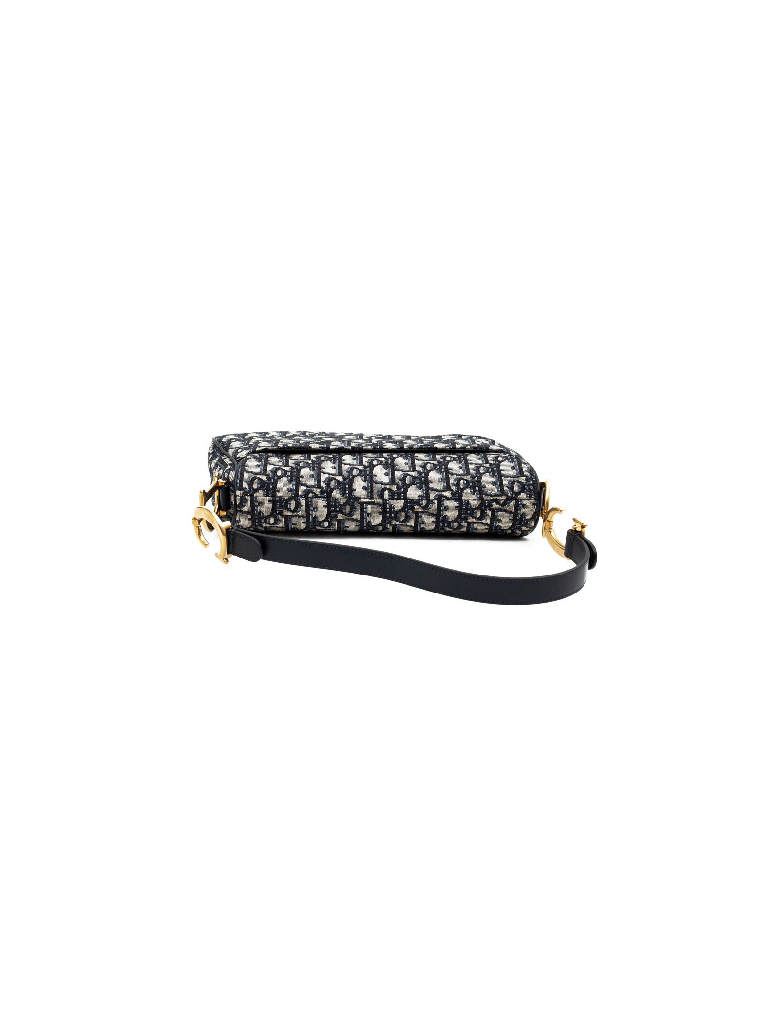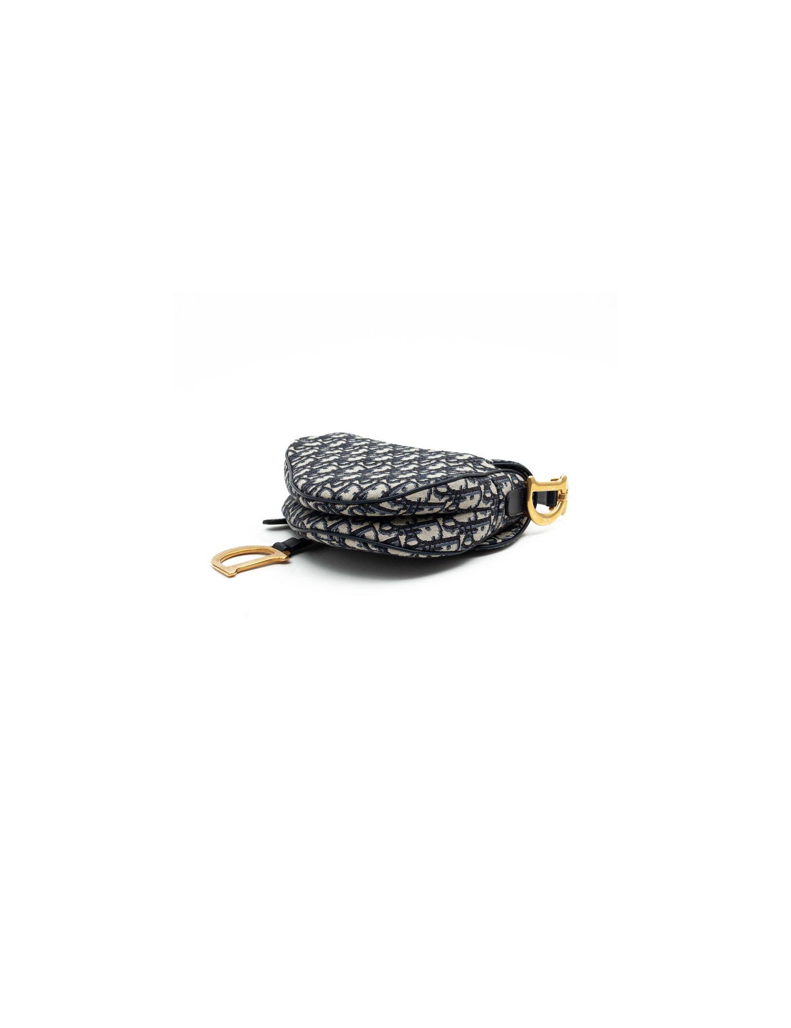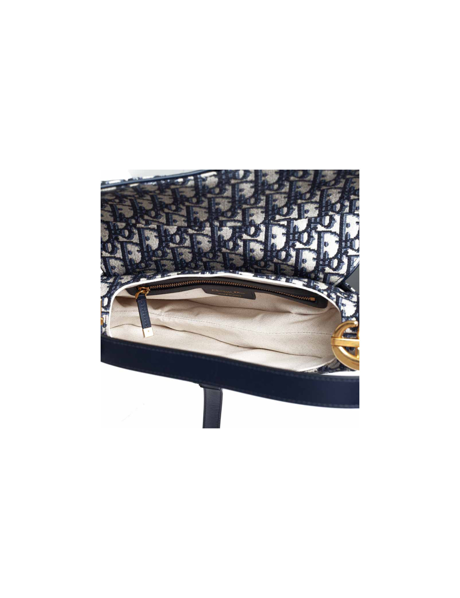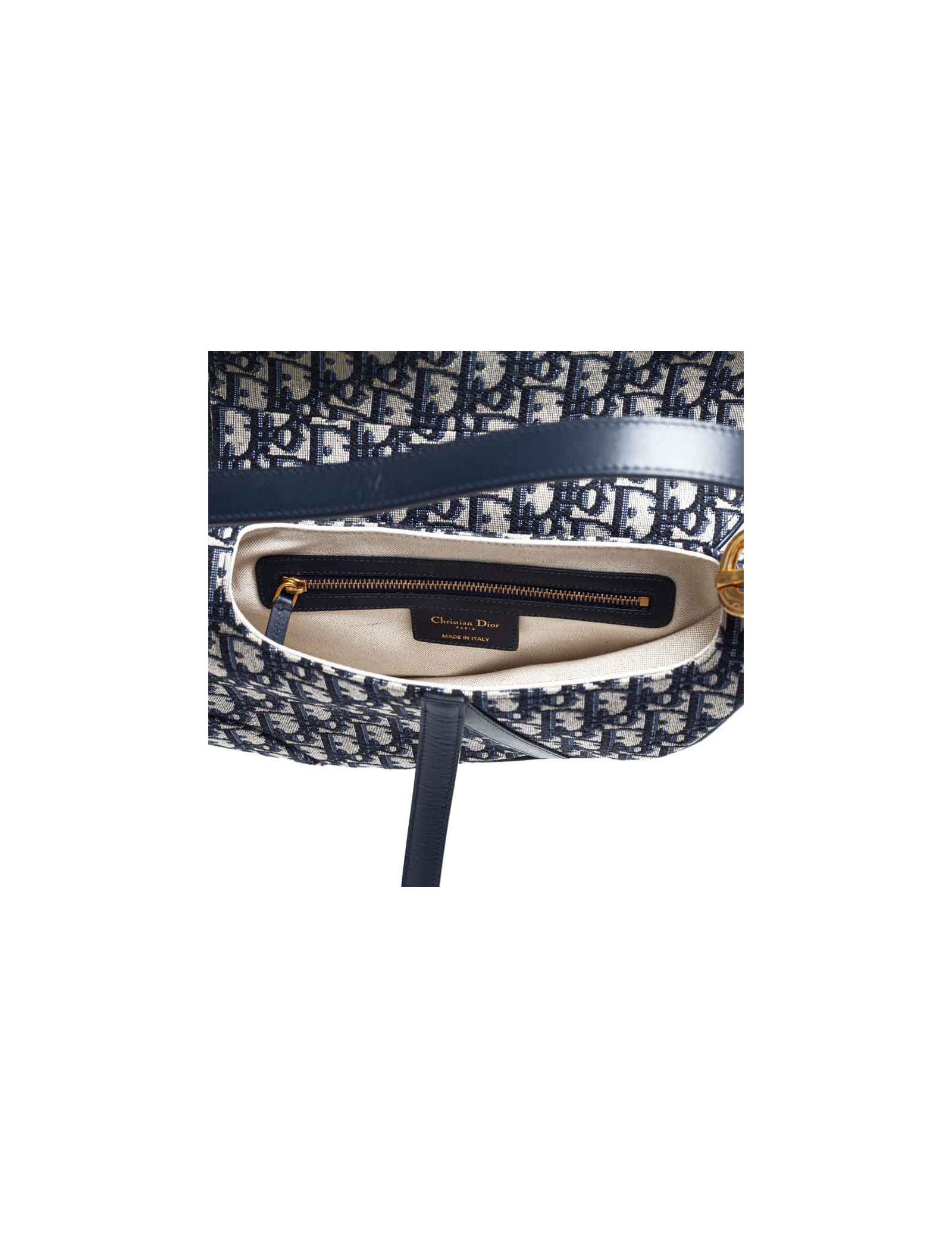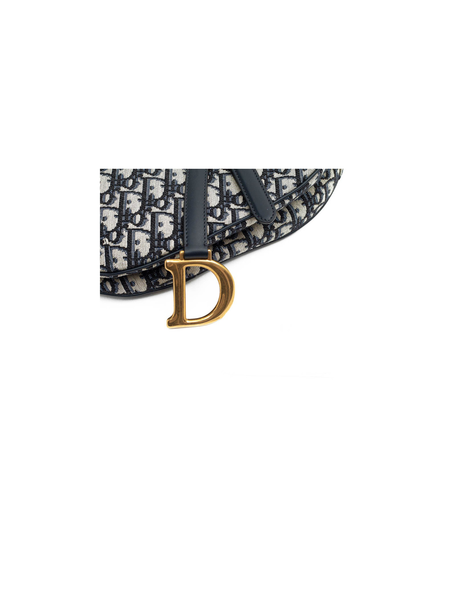 Sac Saddle de la Maison Dior en toile Oblique bleue avec des finitions en cuir. La bijouterie est dorée. Fermeture par rabat aimantée et se porte main ou épaule. Il est doublé de toile beige, une poche fermée. Sac apparu au début des années 2000 et imaginé par J. Galliano, la directrice artistique de DIOR Maria Grazia Chiuri l'a revisité pour en faire un it-bag dont on ne peut se passer.
