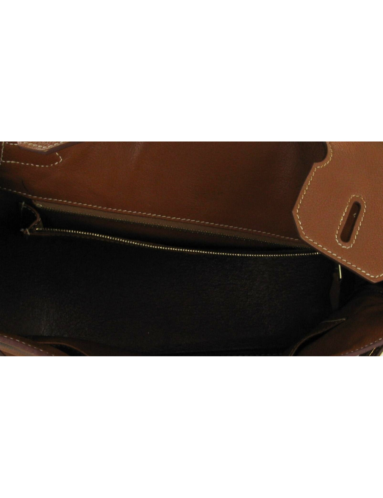 Imaginé par l'actrice et chanteuse Jane Birkin suite à sa rencontre avec Jean-Louis Dumas lors d'un vol Paris-Londres, ce sac est aujourd'hui le sac Hermès le plus vendu en France et le compagnon préféré de nombreuses célébrités. Ce classique et intemporel Birkin est en très bon état général. Datant de l'année F (2001), ce sac a été bien conservé, malgré quelques très légères tracs d'usure sur les coins et au niveau des coutures. Fermoi gold. Deux poches intérieures dont une avec zip siglé HERMES. Traces d'usure dans le fond intérieur du sac. Surpiqûres blanches.