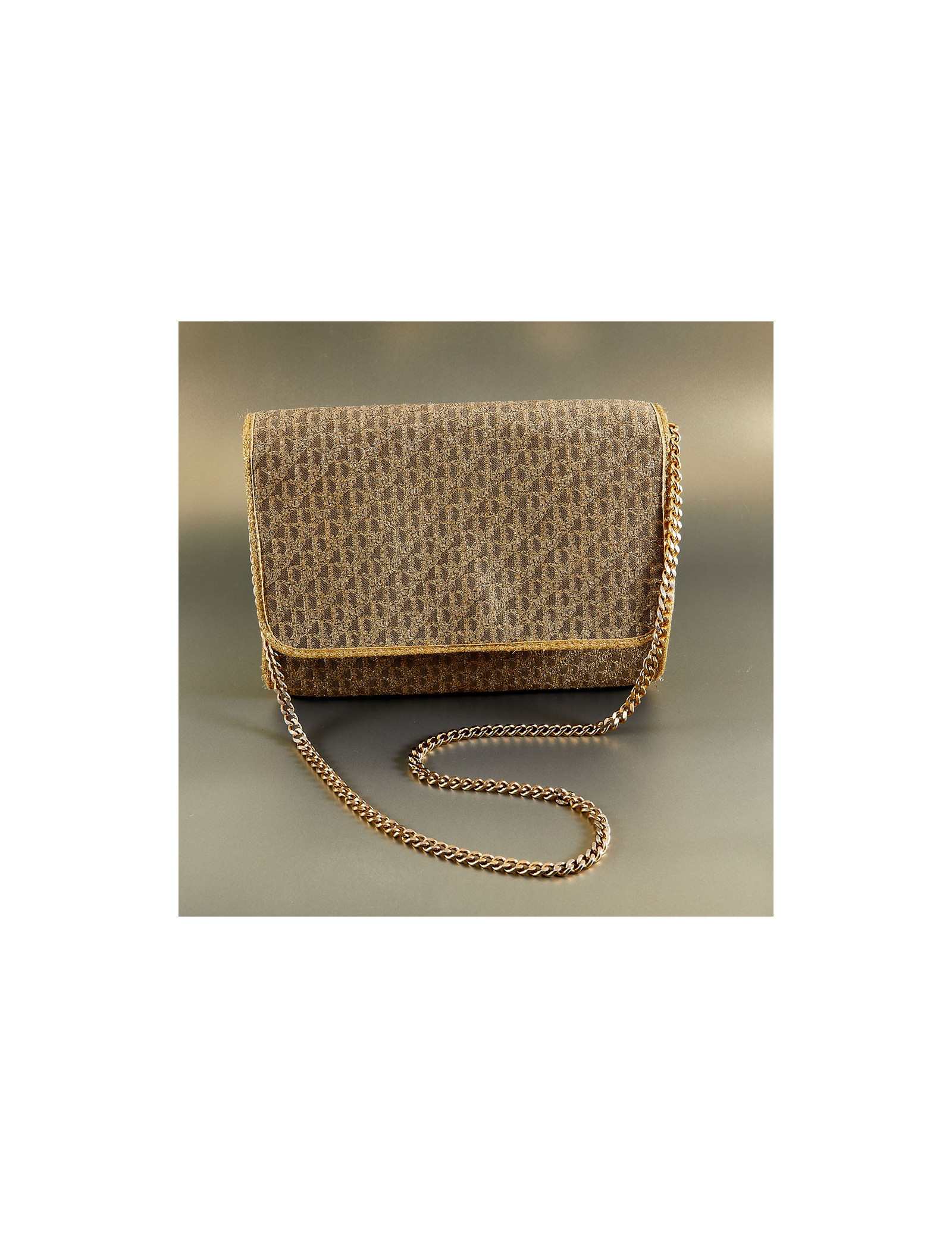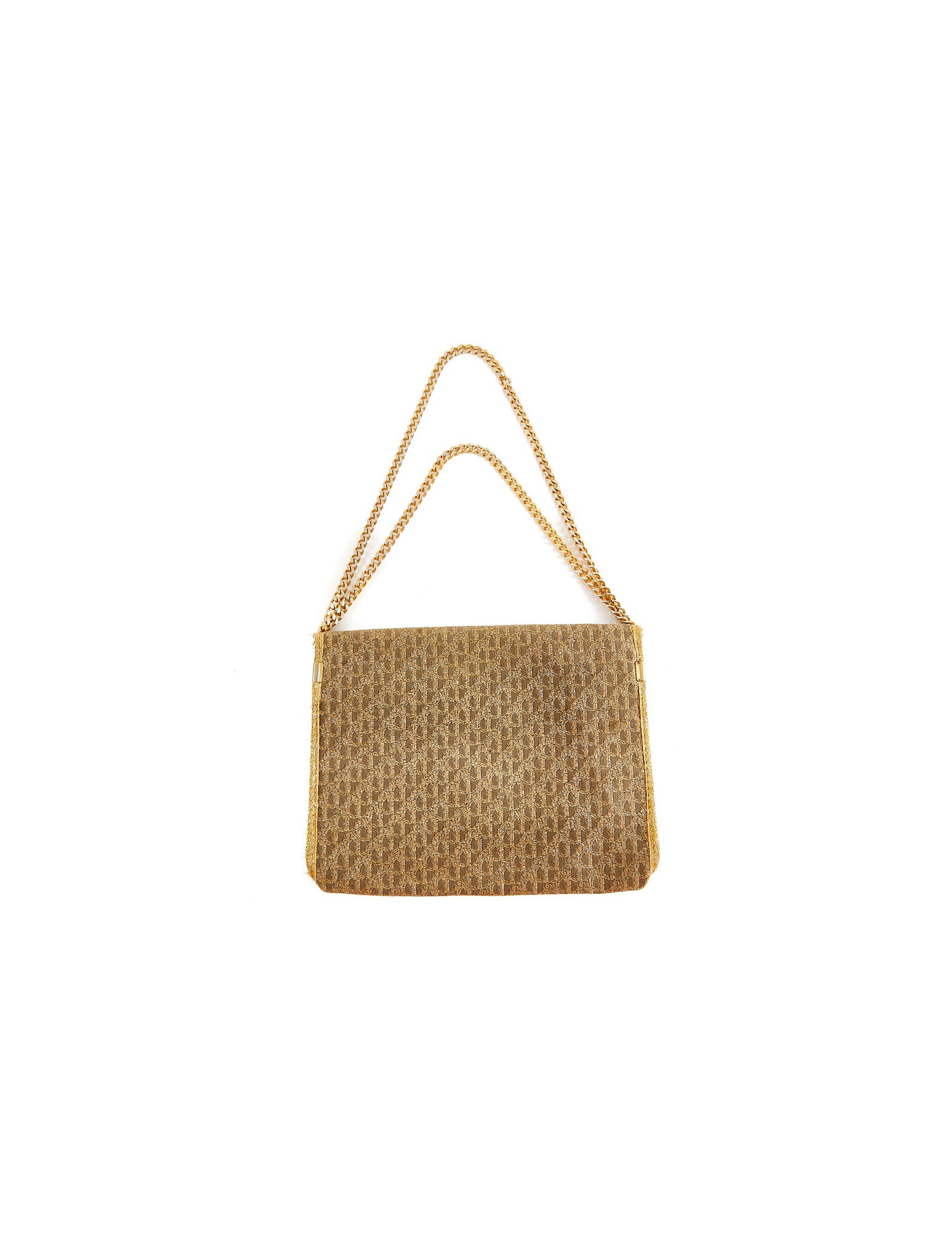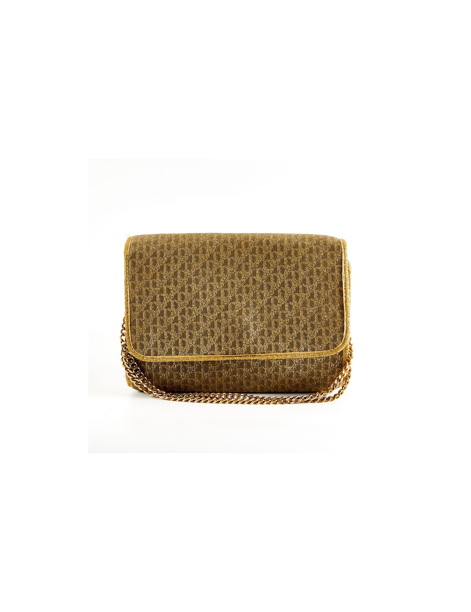 Petit sac pochette, pouvant se porter également en bandoulière par une chaine dorée (manque dorure par endroits). fermeture par bouton pression.