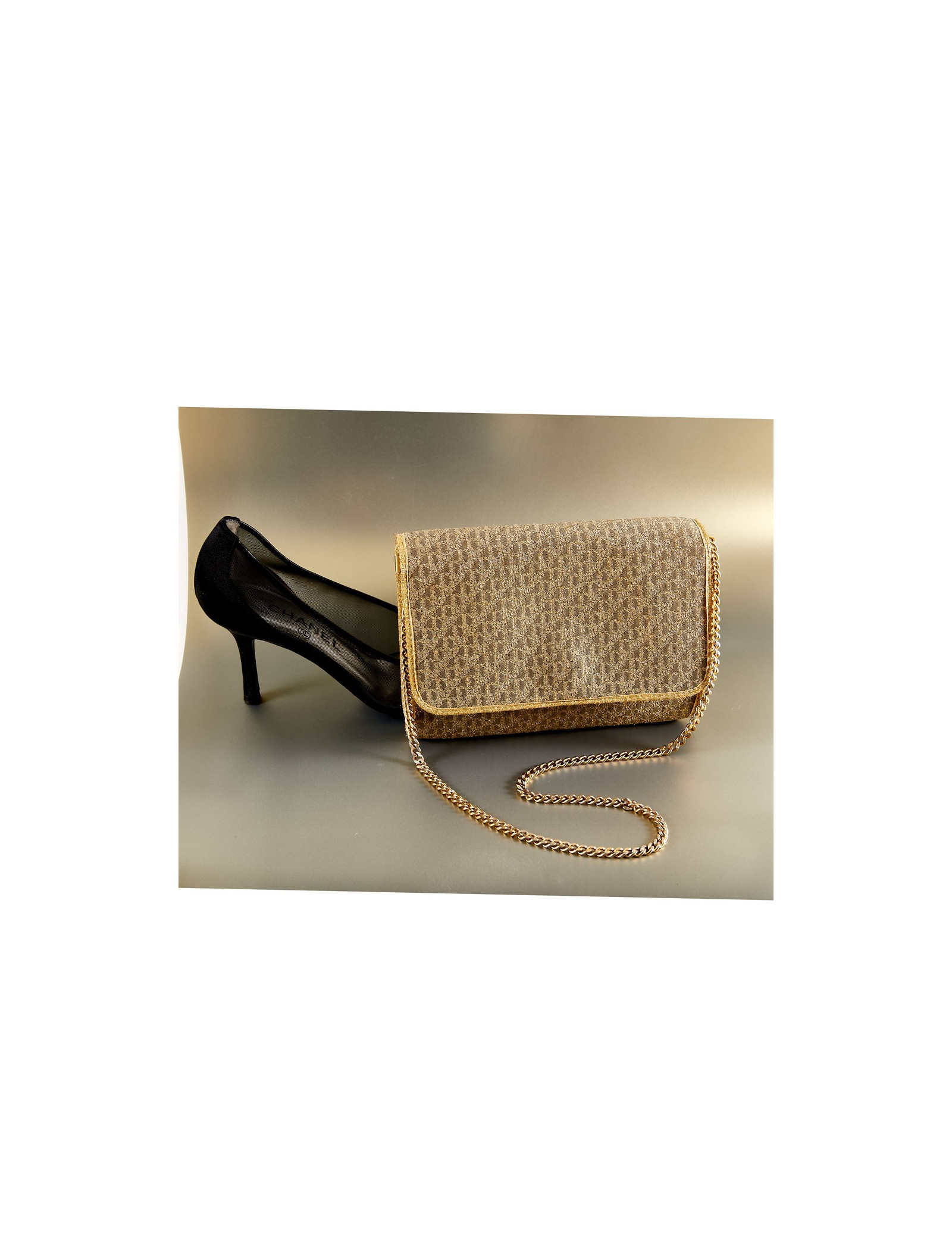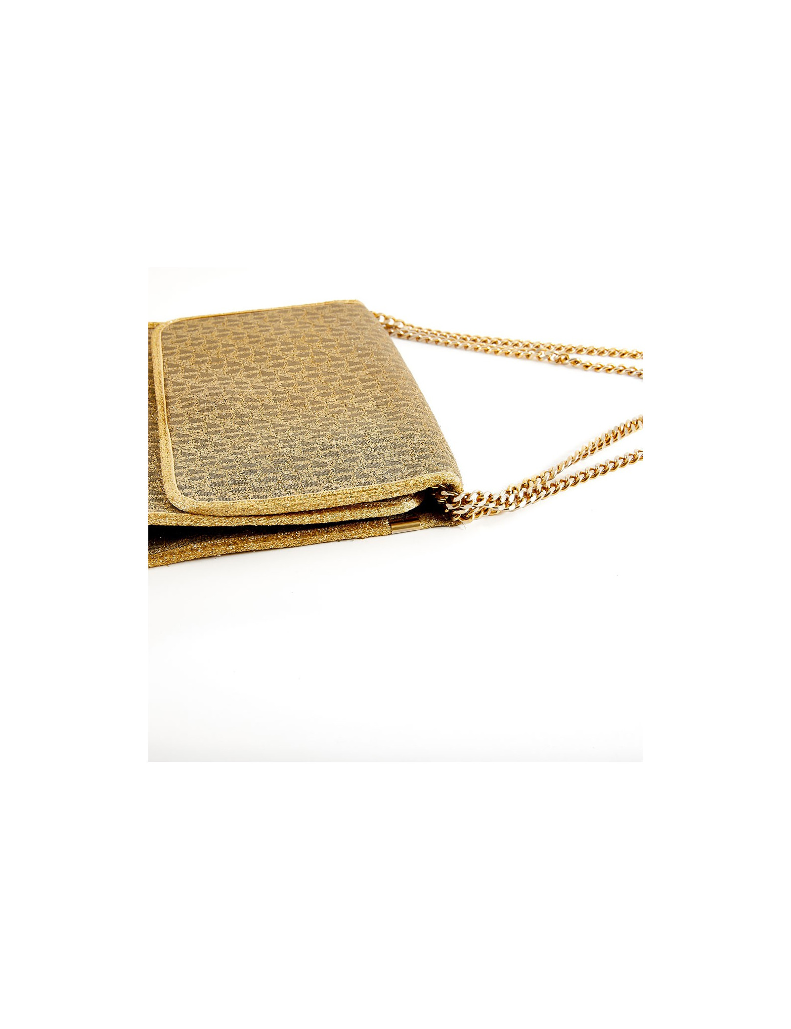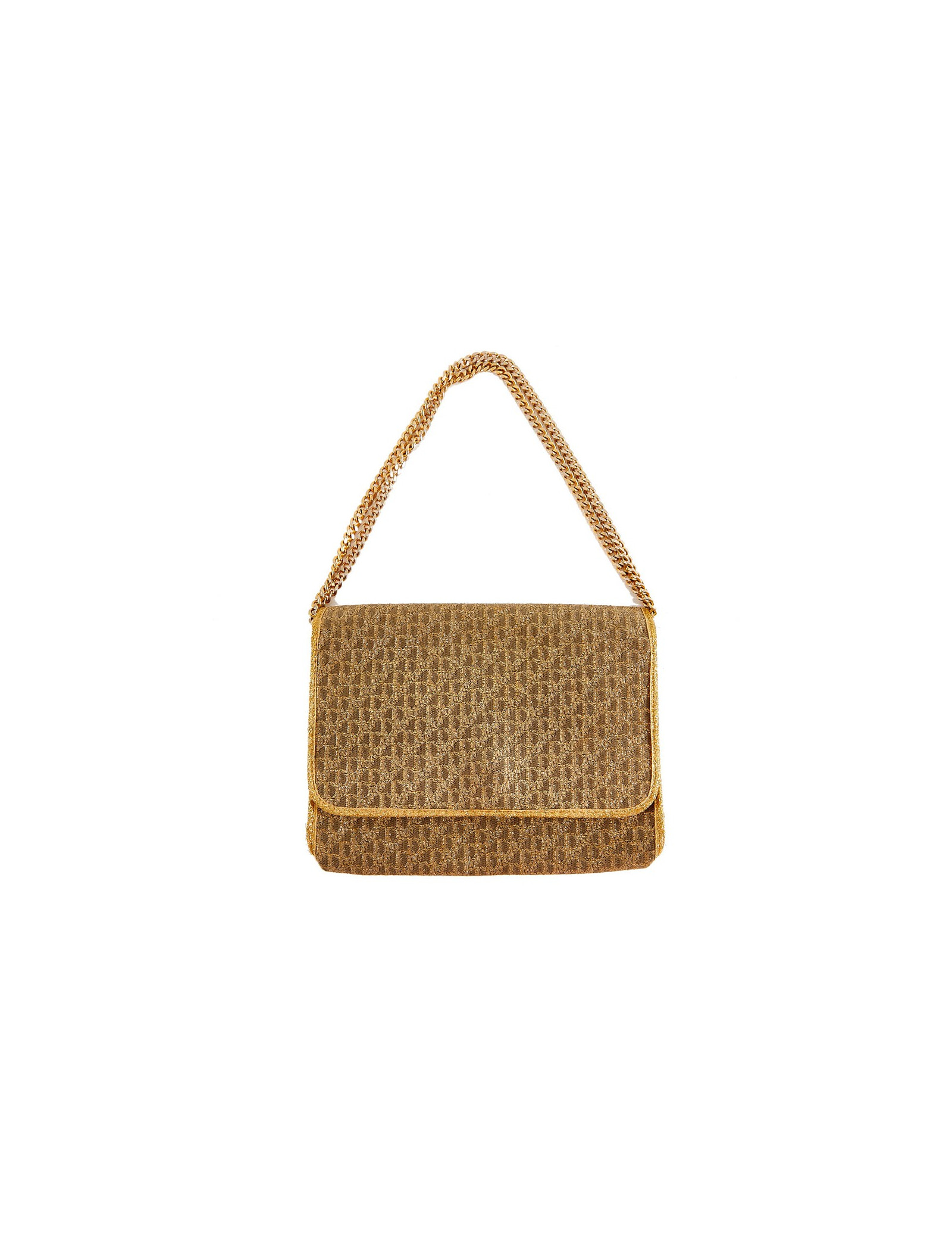Petit sac pochette, pouvant se porter également en bandoulière par une chaine dorée (manque dorure par endroits). fermeture par bouton pression.