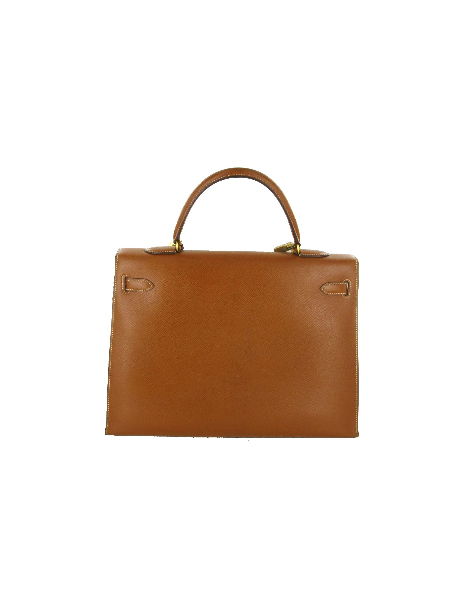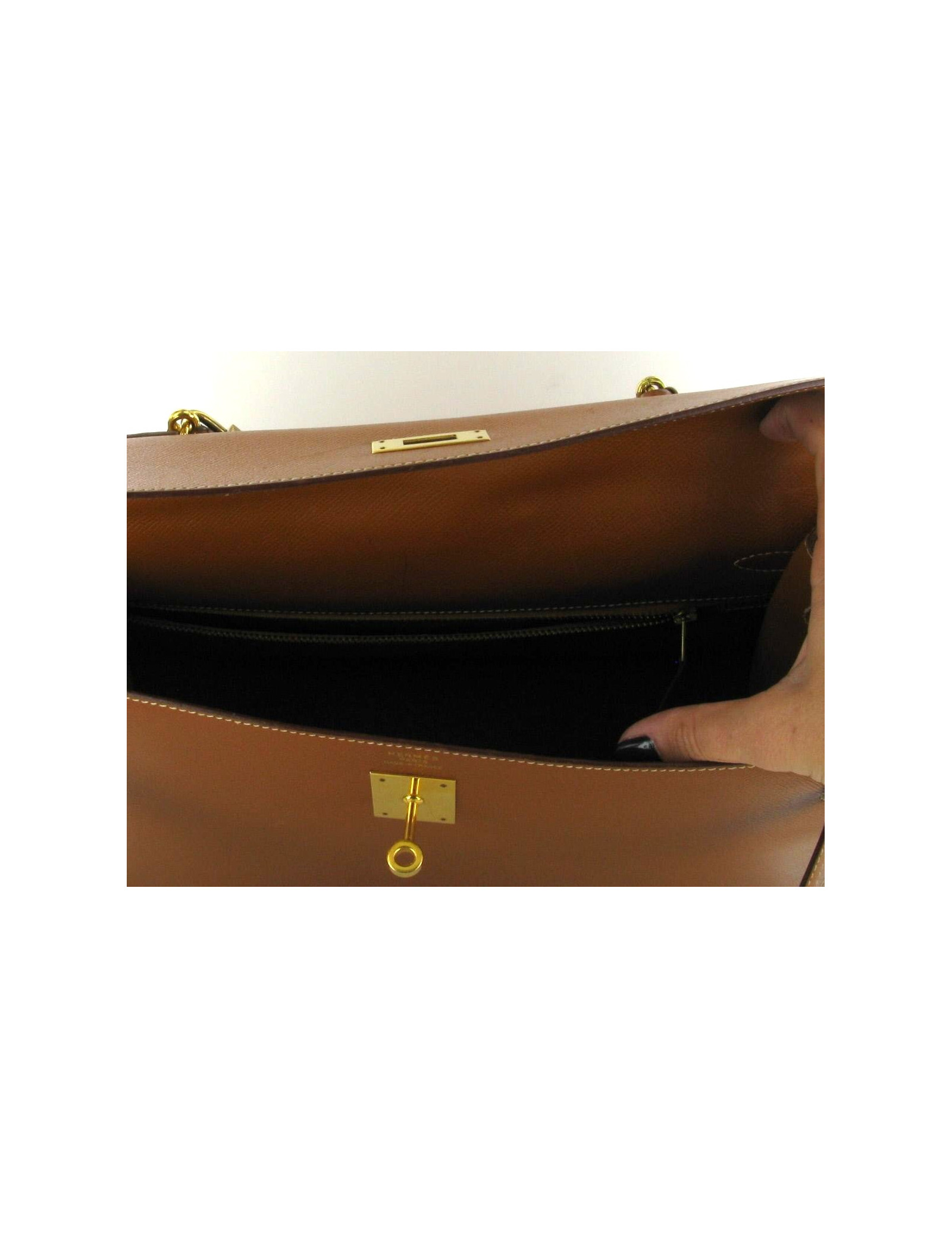 KELLY T 35, HERMES, cuir Courchevel gold, piqûres Sellier, acastillage en métal doré. Lettre S entourée, année 1989. Cette pièce, en parfait état, a traversé les années sans prendre une ride. La Maison Hermès ayant stoppé la fabrication du sac Kelly dans le cuir très noble qu'est le cuir Courchevel, ce sac est devenue une pièce extrêmement rare. De plus, les coutures Sellier demandaient aux artisants Hermès une rigueur particulière et un savoir-faire spécifique. Cadenas et clés sous clochette, longue anse amovible. Petite trace de stylo sur le fond du sac. A l'intérieur quelques légères griffures et traces de stylo. Il vous sera livré dans son dustbag.