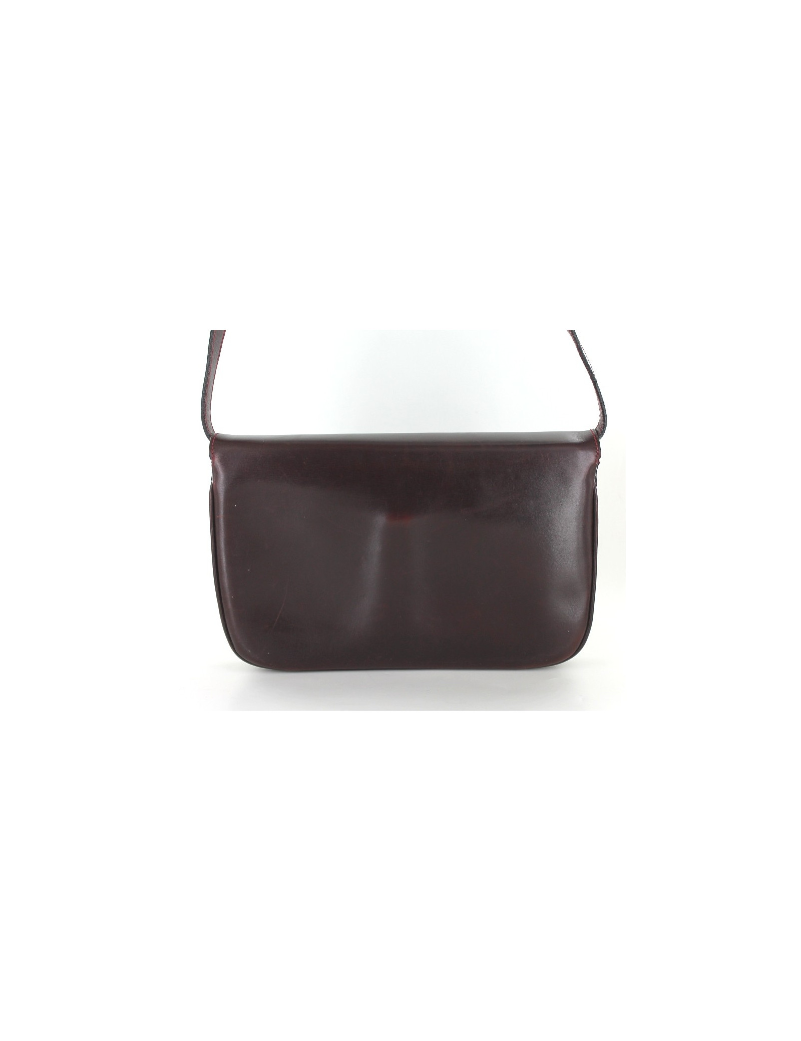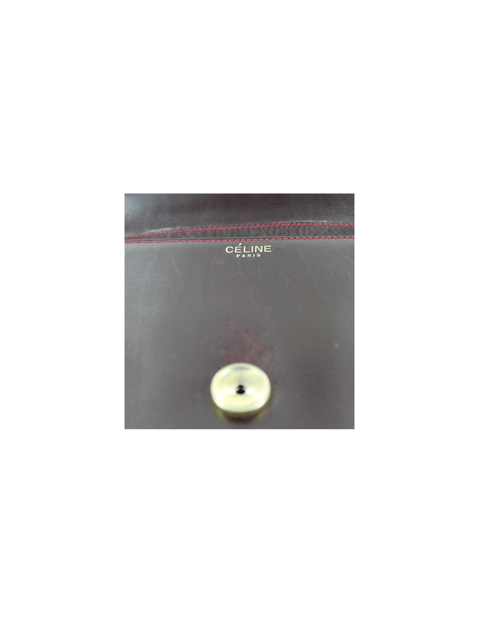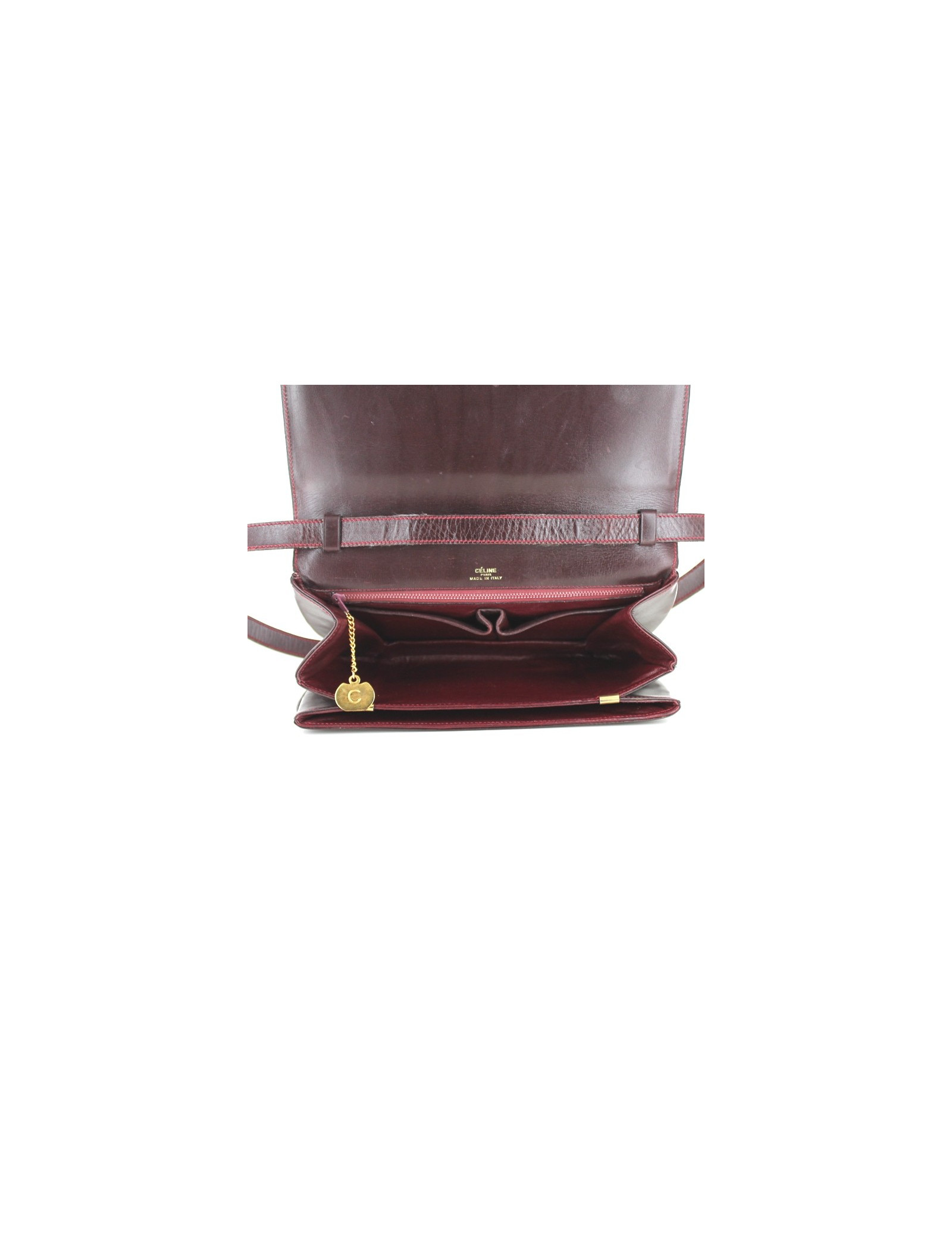 Pochette CELINE vintage en cuir box bordeaux, forme besace, porté épaule. Deux grandes poches intérieures, ainsi qu'une poche plate zippée et deux emplacements pour téléphones portable. Doublure en cuir rouge en bon état. Cinq longueurs d'ajustement de l'anse.