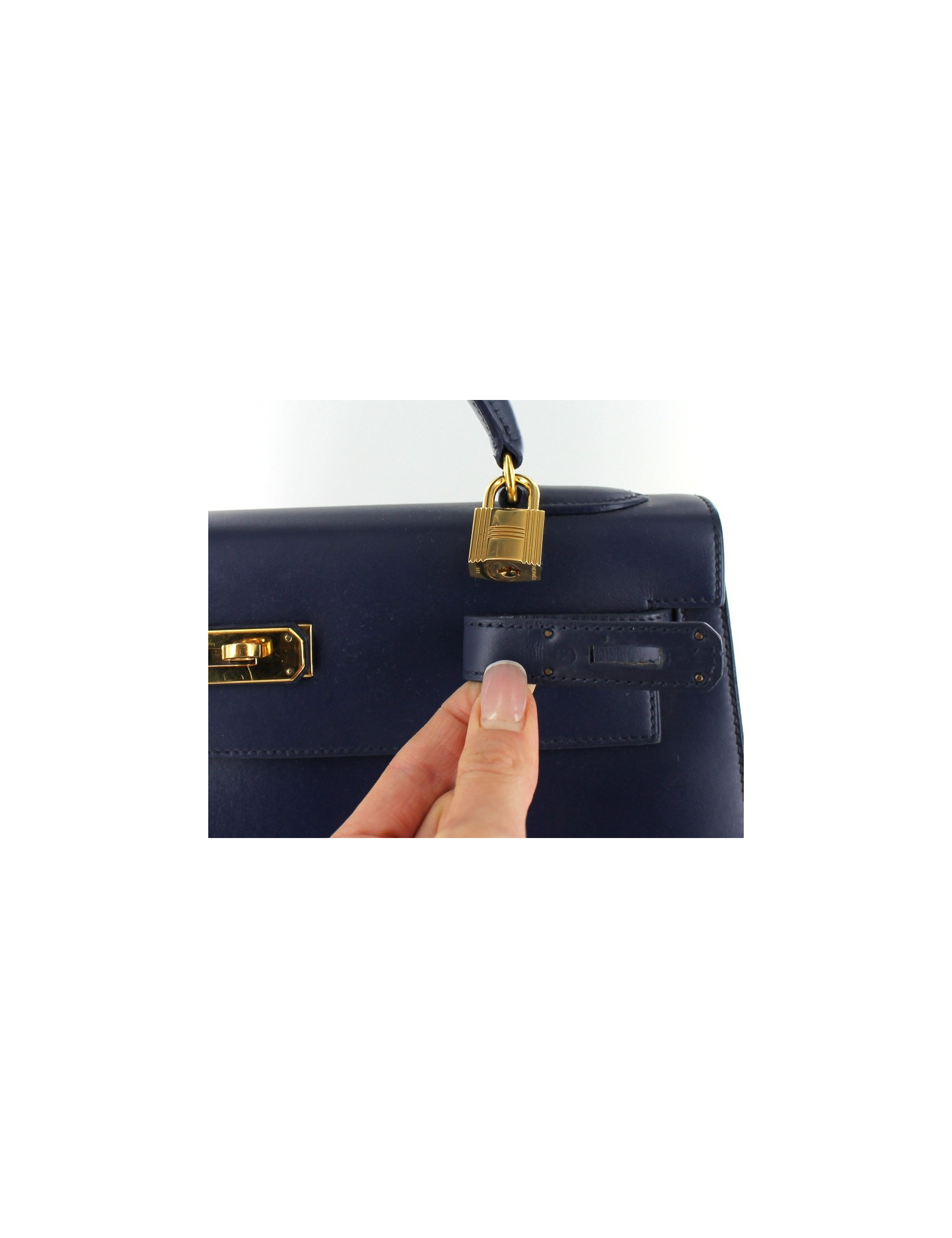 KELLY 32 HERMES en cuir box bleu marine et coutures Sellier. Pièce exceptionnelle en très bon état. Vendu avec sa bijouterie : cadenas en métal doré et clé sous housse en cuir. Micro-rayures sur la bijouterie. Il vous sera fourni sa bandoulière pour le porter à l'épaule. Doublure intérieure en cuir avec poche plate zippée et deux poches plates ouvertes. Quatre picots en métal sous le sac. Lettre X entourée. Vendu avec son dustbag. Made in France.