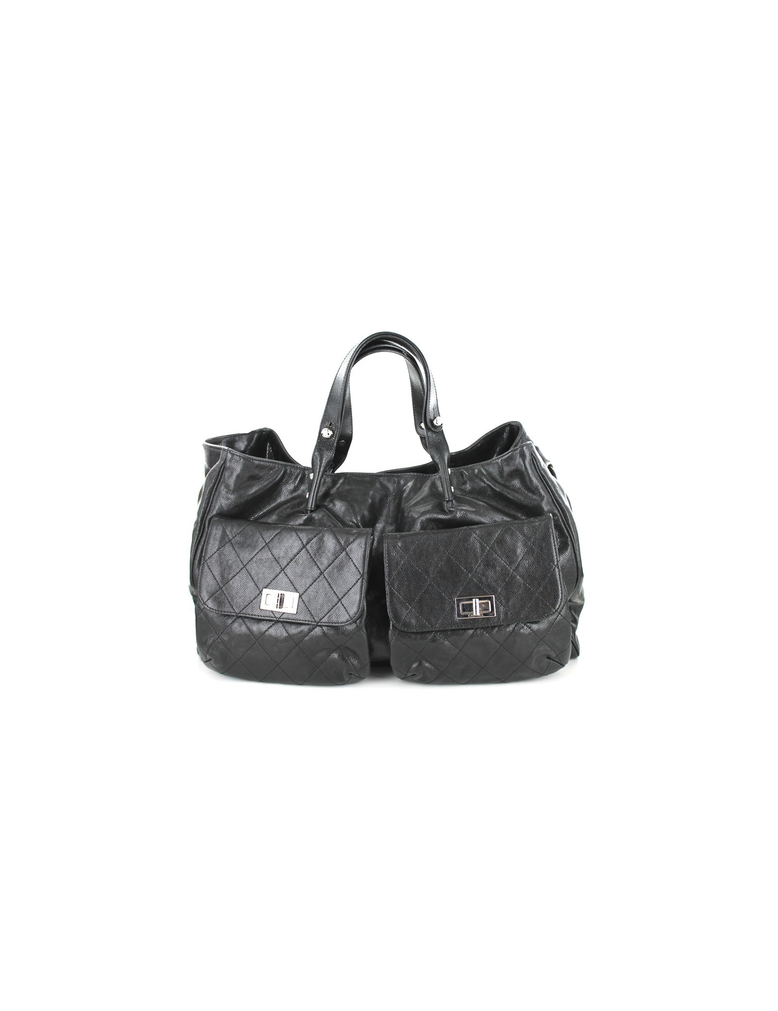 Grand sac CHANEL cabas à double-poches en cuir grainé noir brillant et métal argenté. Les deux grandes poches à l'avant du sac son en cuir matelassé et disposent des mythiques fermoirs 2.55 en métal argenté. Ce sac s'ouvre et se ferme à l'aide d'un bouton pression aimanté. La doublure intéreirue du sac est en satin gris, très raffiné. A l'intérieur, une anse en cuir assortie d'un mousqueton vous permettra d'y accrocher vos clés ou votre porte-monnaie. Très jolis boutons en argent siglés CC sur les anses. Marques d'usure sur les coutures des anses. Hologramme 12..., année 2008-09. Made in Italy. Ce sac est vendu avec son dustbag d'origine.