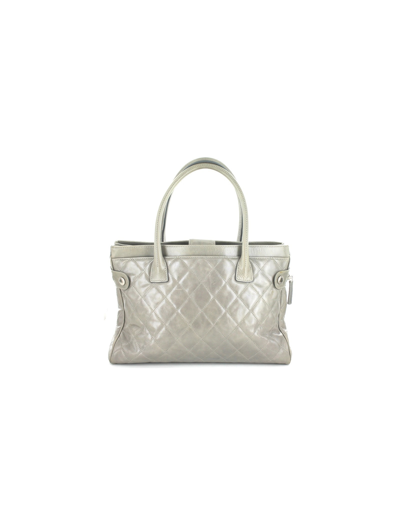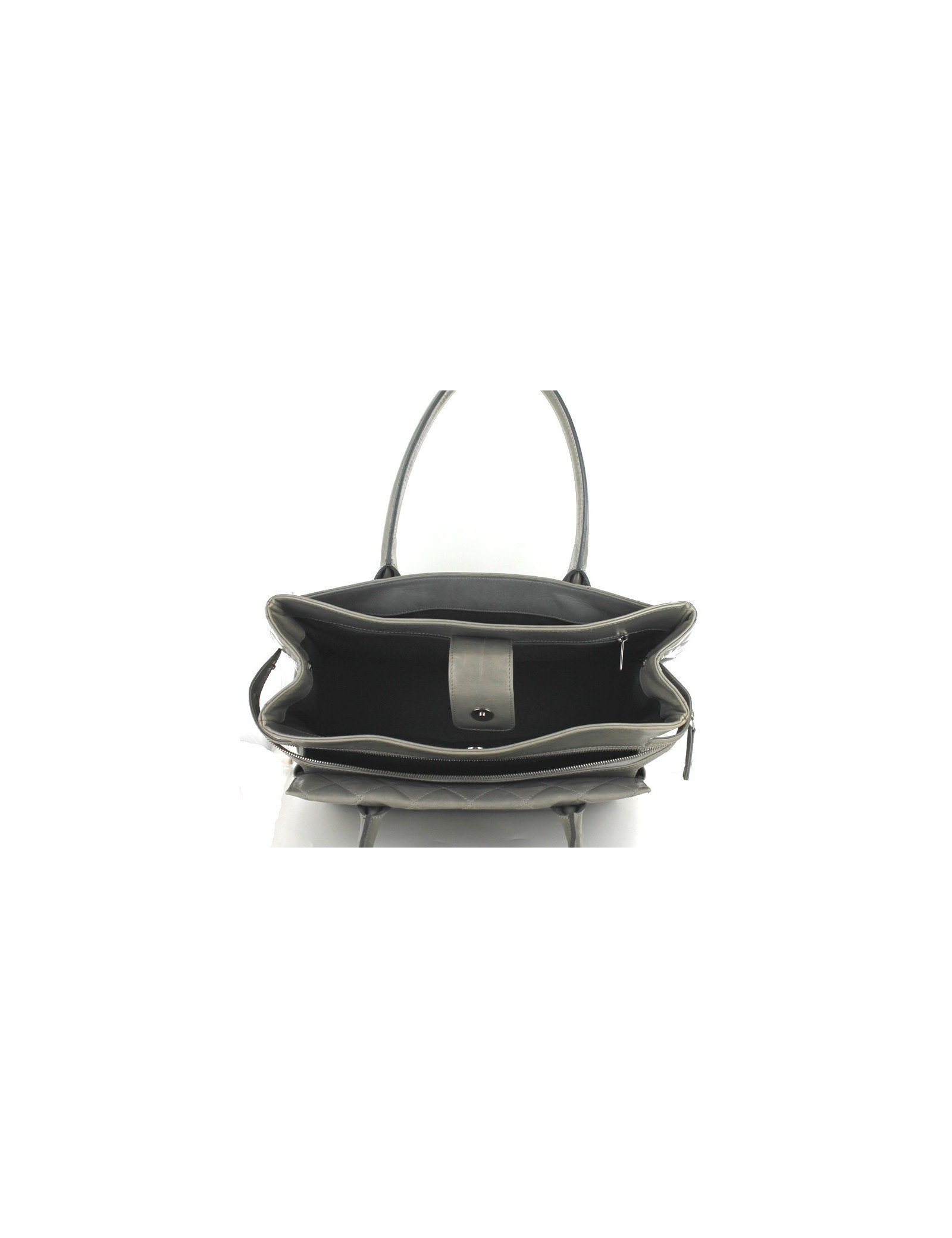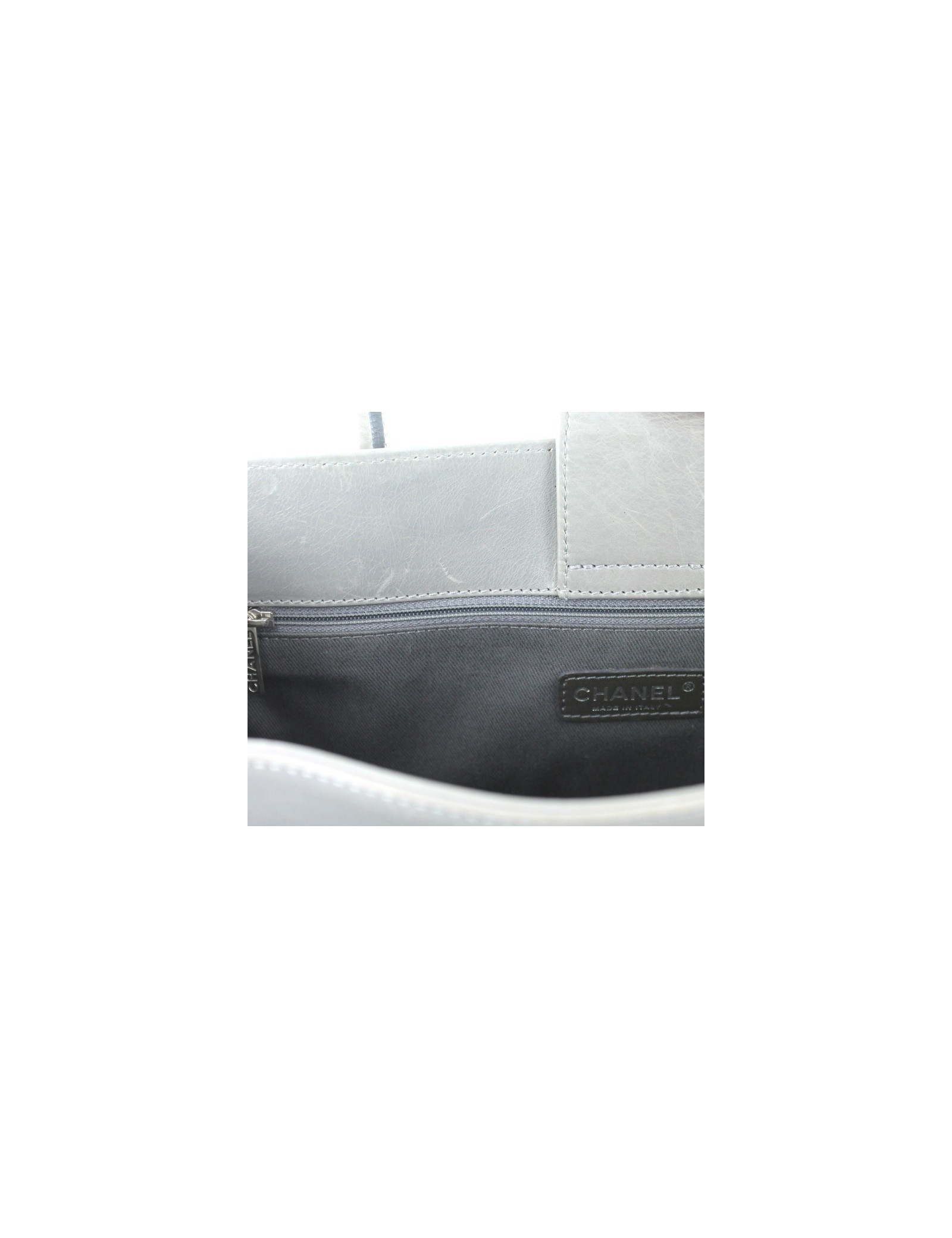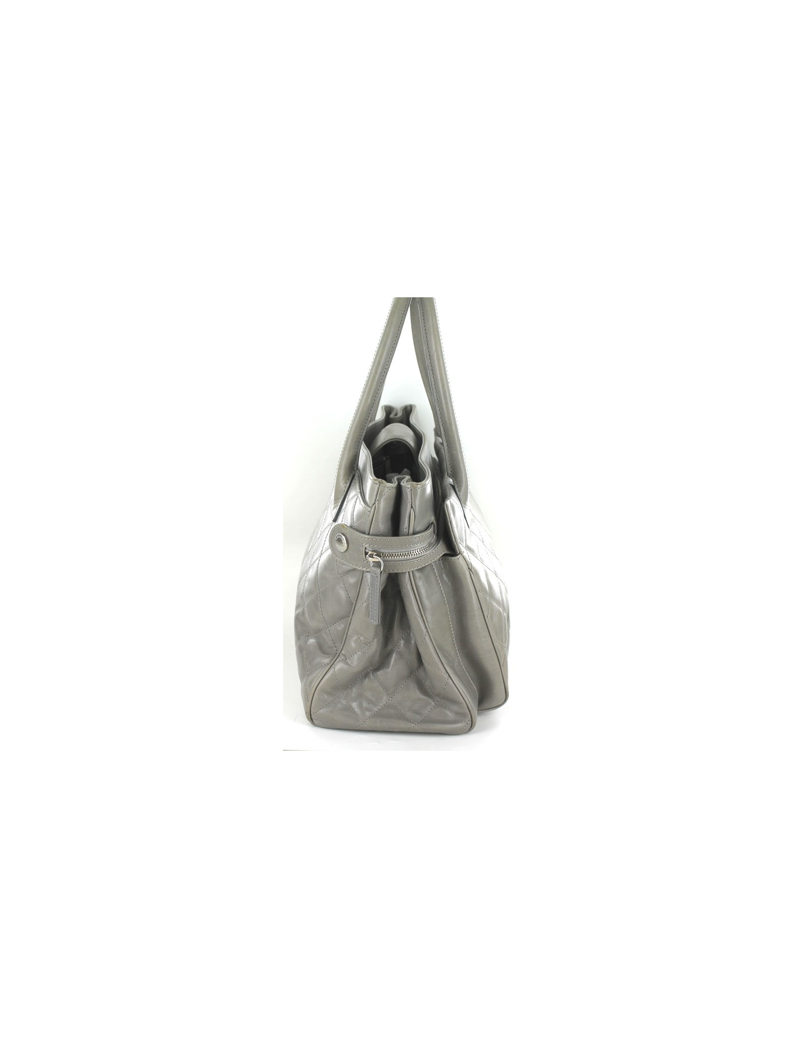 Grand sac CHANEL en cuir d'agneau lisse gris, en très bon état général. Il a été créé dans un cuir gris très rare. Très fonctionnel, le sac dispose de nombreux rangements : une grande poche centrale fermée par une bride avec un bouton pression aimanté, une grande poche plate à l'arrière, une grande poche à l'avant dotée d'une fermeture éclair qui s'attache le long de chaque côté du sac. Doublure intérieure en tissu gris. Ce sac est vendu avec son dustbag d'origine, ainsi que sa carte d'authenticité. Hologramme 12.., année 2008-09. Quelques griffures et traces d'usure sur le fond et angles du sac. Made in Italy.