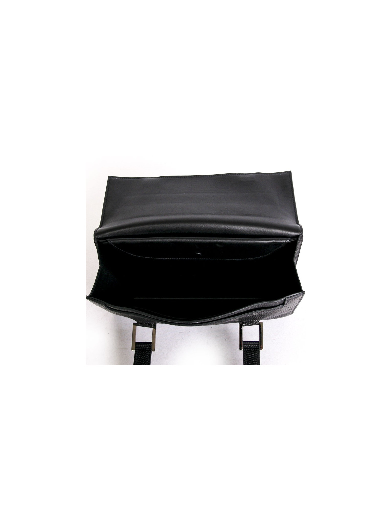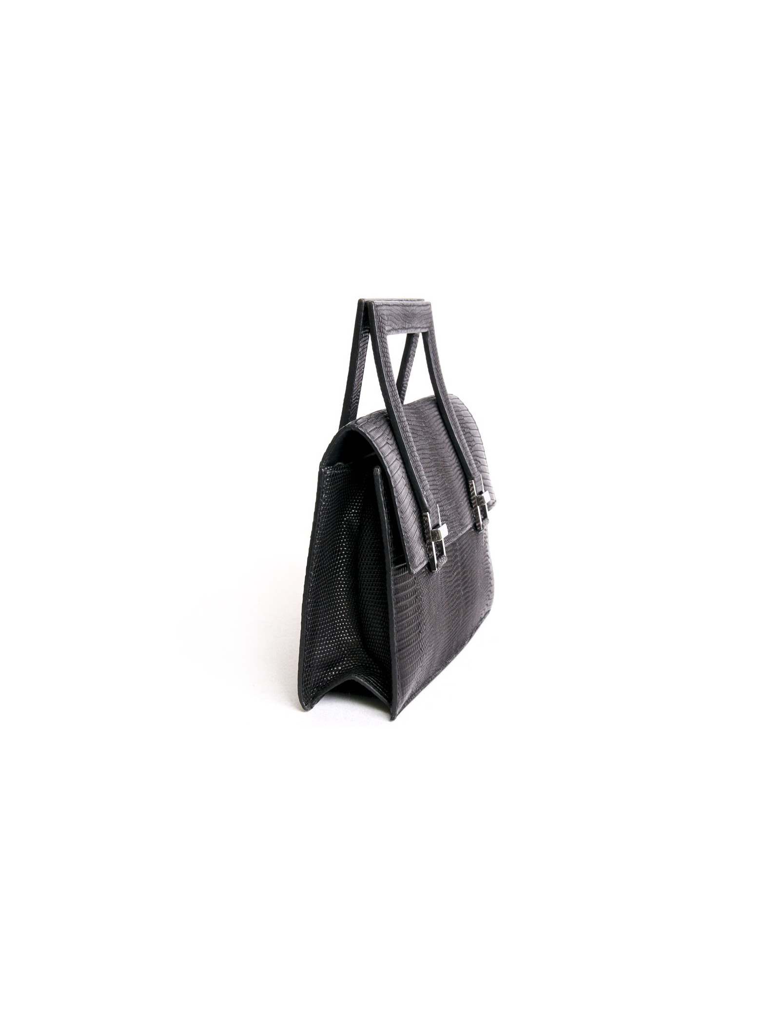 Sac HERMES vintage en lézard noir, boucle en palladium. Ce sac se ferme comme une enveloppe droite. Les anses carrées donnent un look très rétro à ce sac à main. Ce sac a très bien été conservé. Doublure intérieure en cuir d'agneau lisse. Très fonctionnel, ce sac dispose de multiples poches (poche plate, poche à fermeture pression et deux petites poches pour téléphones portable). Made in France.