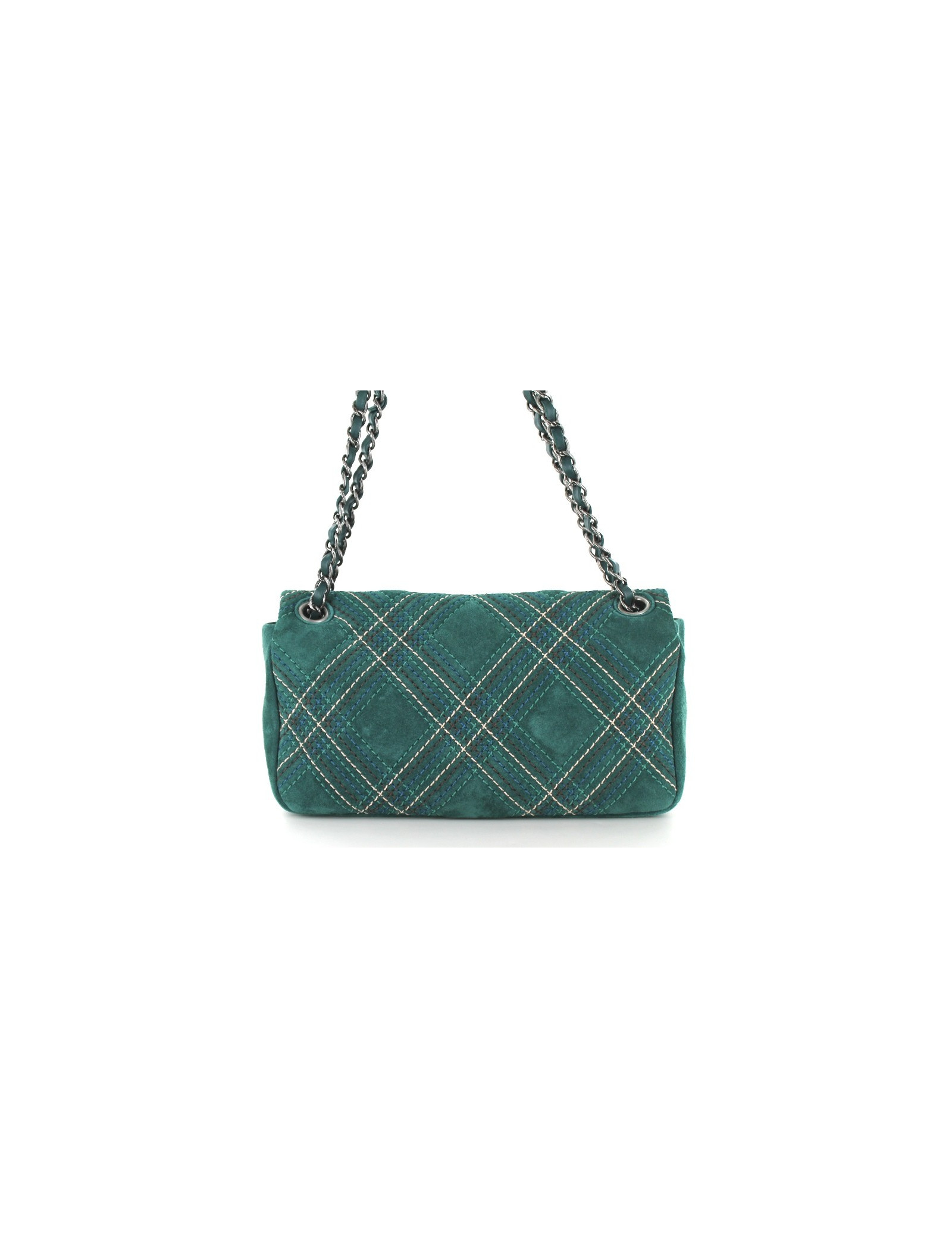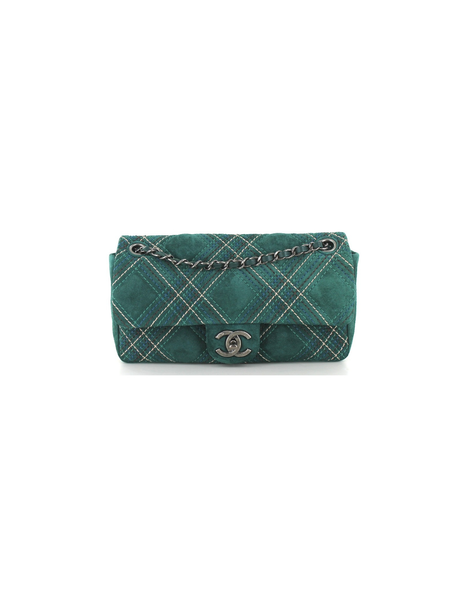 Sac CHANEL timeless en veau velours vert et surpiqûres beiges, marrons et bleues. Doublure intérieure en tissu camel. Carte d'authenticité. Hologramme 18..., année 2013. Ce sac est neuf. Made in Italy. Vendu avec son dustbag et dans sa boîte CHANEL.