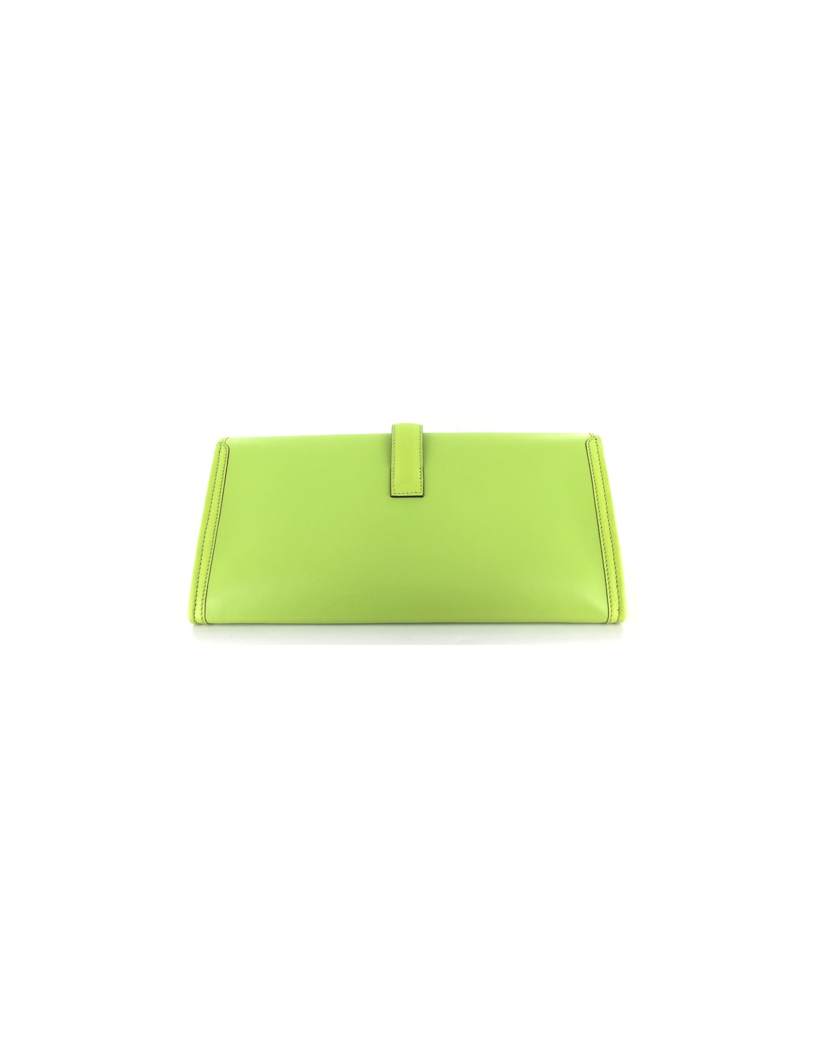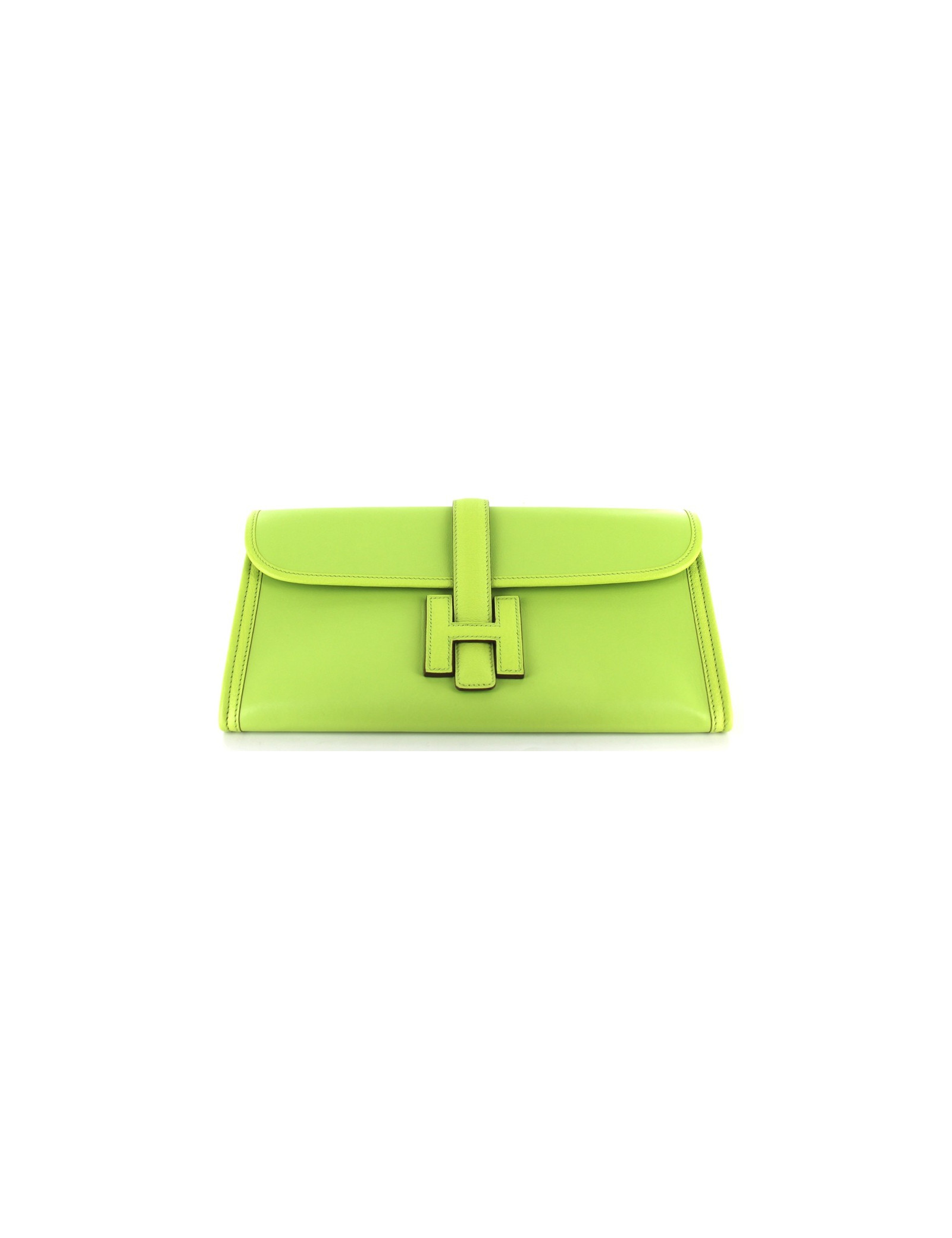 Pochette JIGE ELAN HERMES en cuir d'agneau couleur Lime (vert pomme acidulée). Fermeture coulissante. Cette pochette est neuve. Lettre P, année 2012. Vendu avec son dustbag d'origine. Made in France.