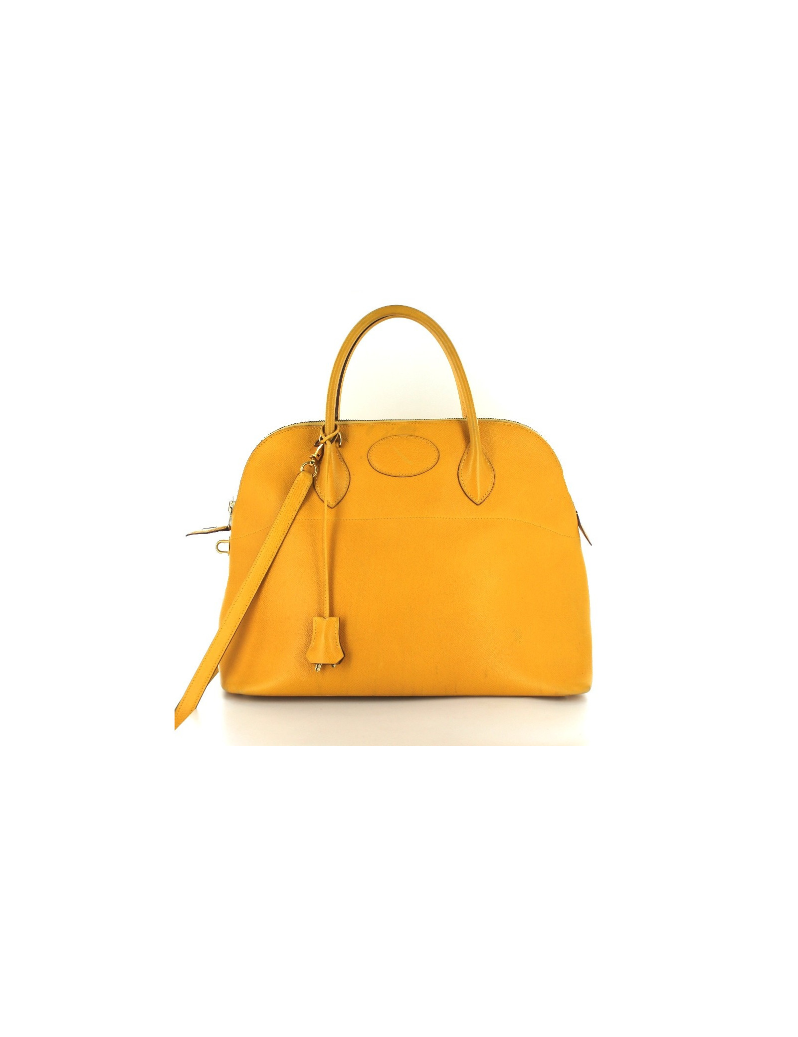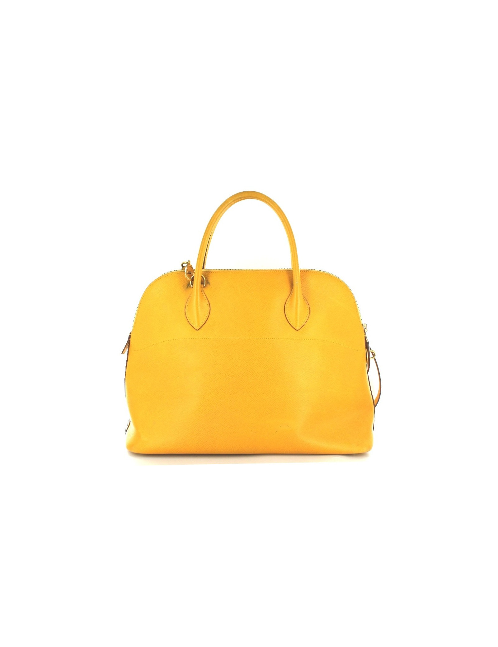 BOLIDE HERMES en cuir jaune orangé et bijouterie dorée. Traces et marques d'usure. Trace de stylo en bas du sac, et tâches à l'intérieur du sac. Lettre M entourée, année 1983. Vendu avec ses clés, sa clochette et sa bandoulière. Made in France.