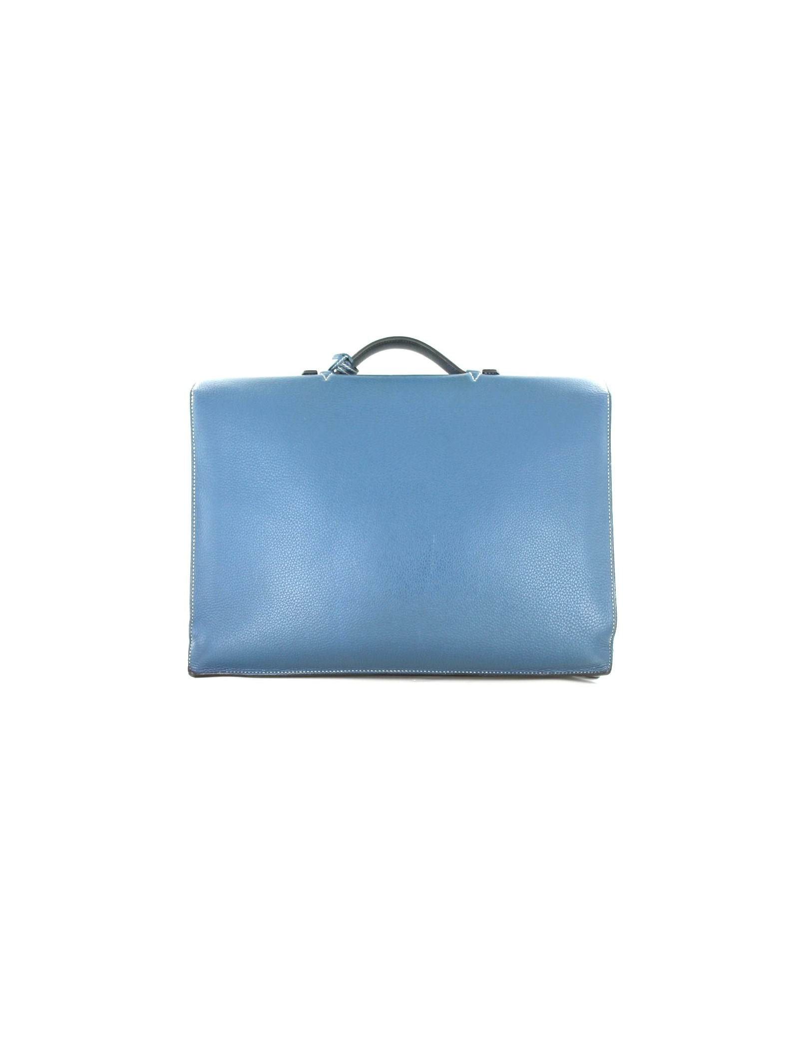 Sac à dépêches HERMES en cuir bleu. Surpiqûres couleur crème. Fermeture languette sur cadenas en palladium (fermeture à loquet basculant). Clés sous clochette. Signature "HERMES PARIS" gravée sur le cadenas. Intérieur à deux grands soufflets, et une grande poche plate. Poignée.