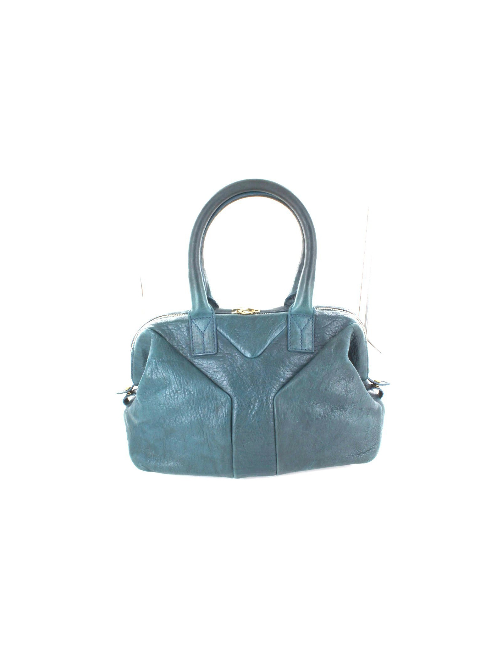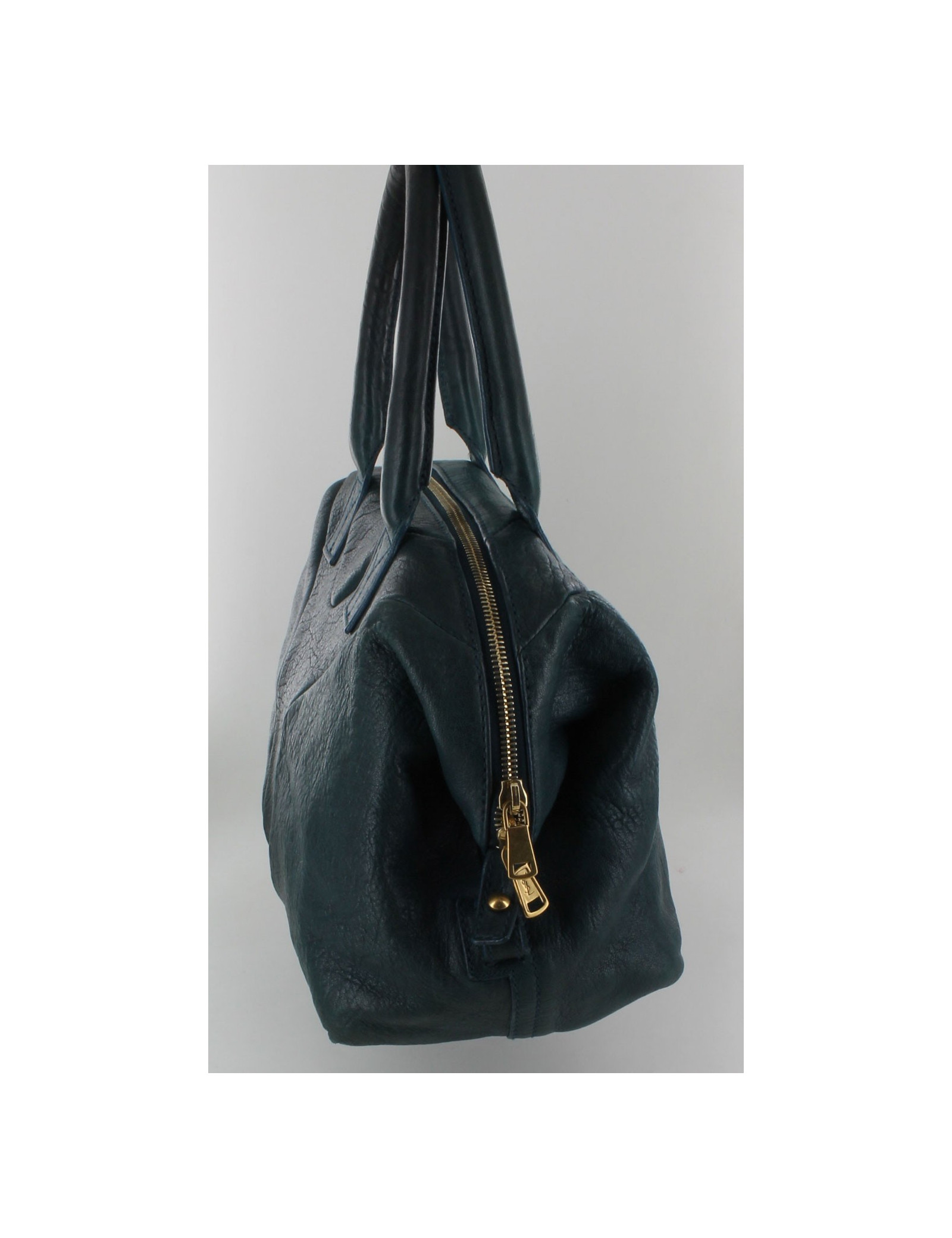 Couleur bleu canard en cuir lisse façon vieilli. Les anses sont plus foncées.