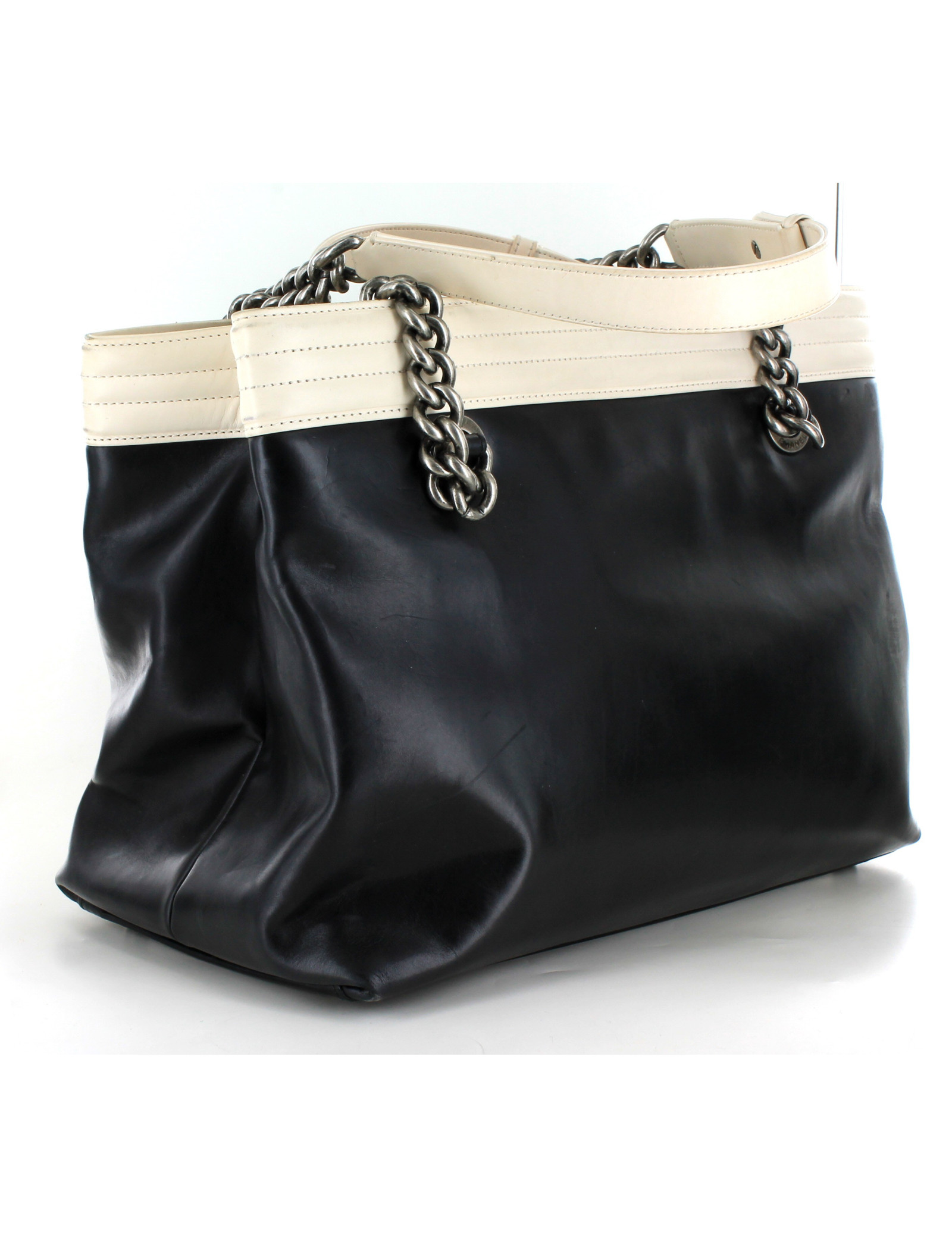 Sac Chanel, fermoir Boy, collection récente, en cuir noir et blanc. les ferrures sont en argent vieilli.