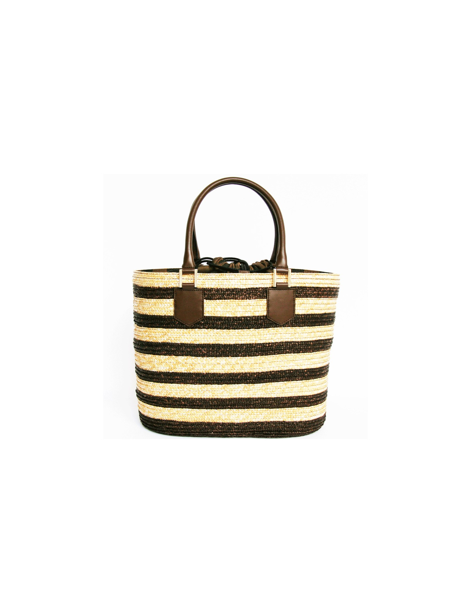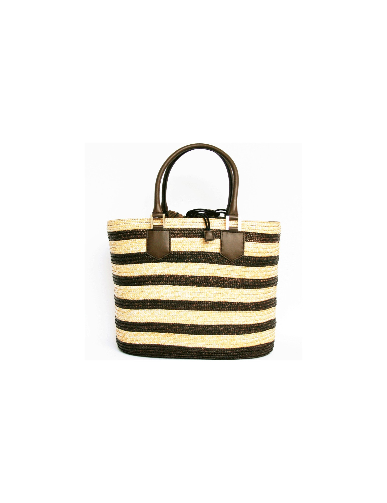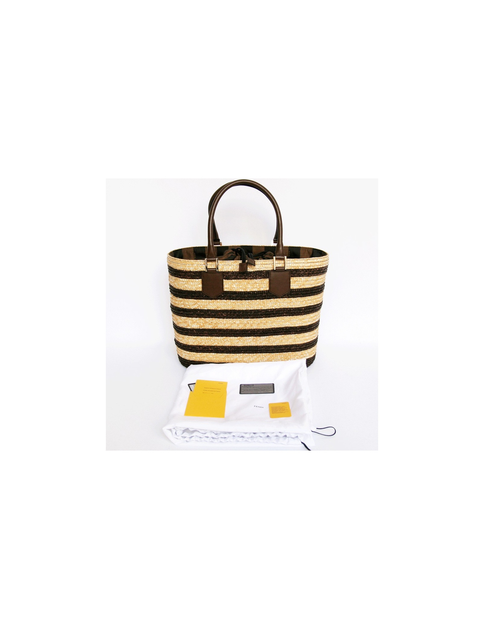 Cabas de plage FENDI en rafia couleur paille et marron motif rayures horizontales , anses en cuir marron de 45 cm porté epaule et main , interieur en toile a rayure Fendi , fermoire en corde coulissante ,