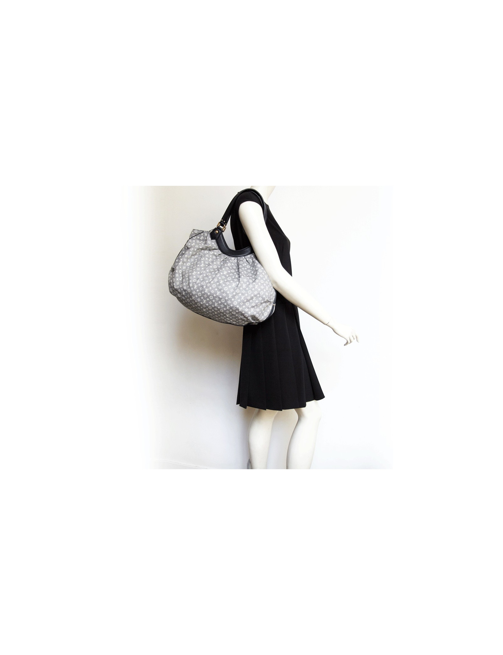 La couleur de toile est grise et les monogrammes blancs faisant référence au légendaire monogram Idylle. Les anses sont en cuir de veau bleu marine garnies de pièces métalliques en laiton doré pour plus d 'élégance. Il se porte à l'épaule ou à la main selon vos envies.