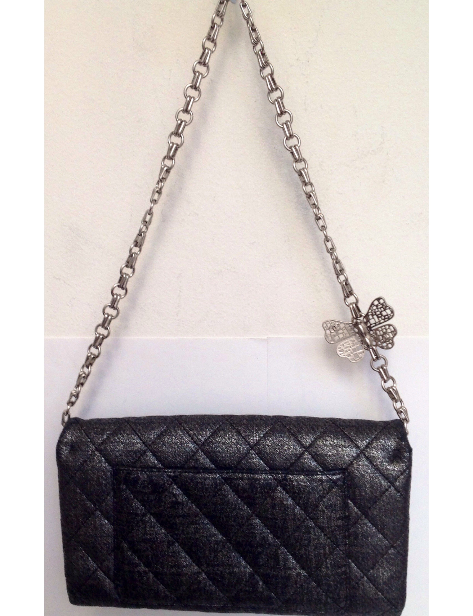 se porte à la main, et à l'épaule par une chaine argentée, travaillée sur laquelle est accroché un papillon. La longeur de la chaine est :56 cm - les mesures du sac : 20 cm x 12 cm
