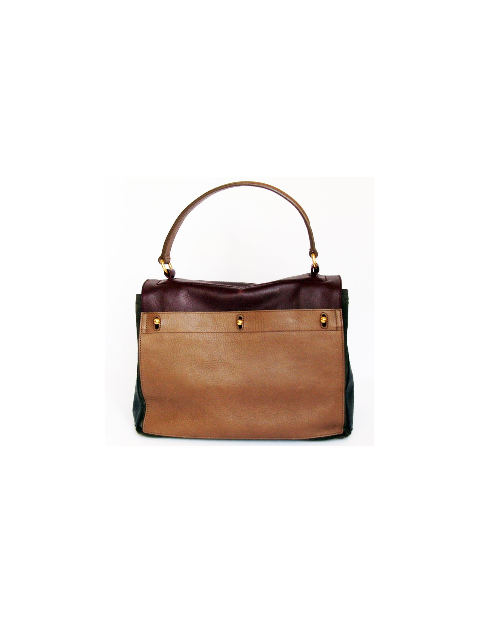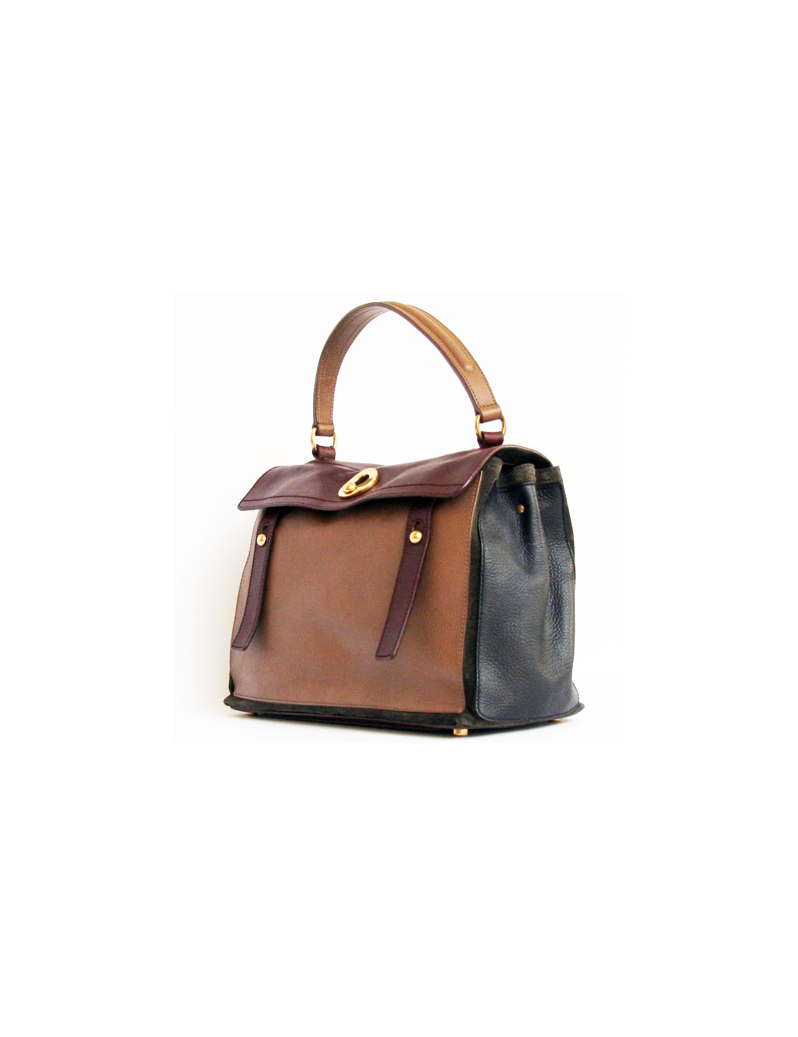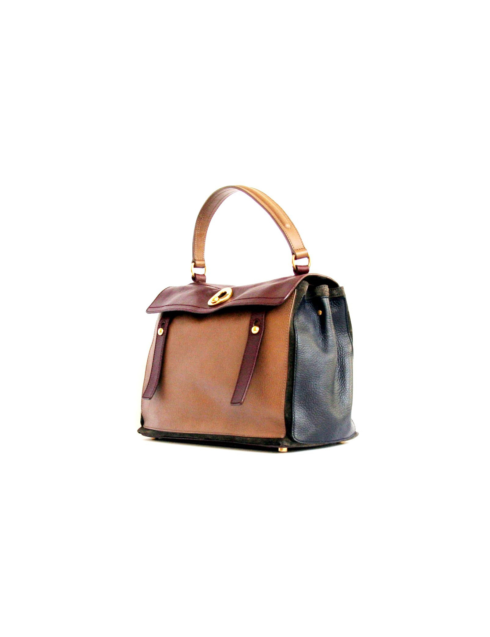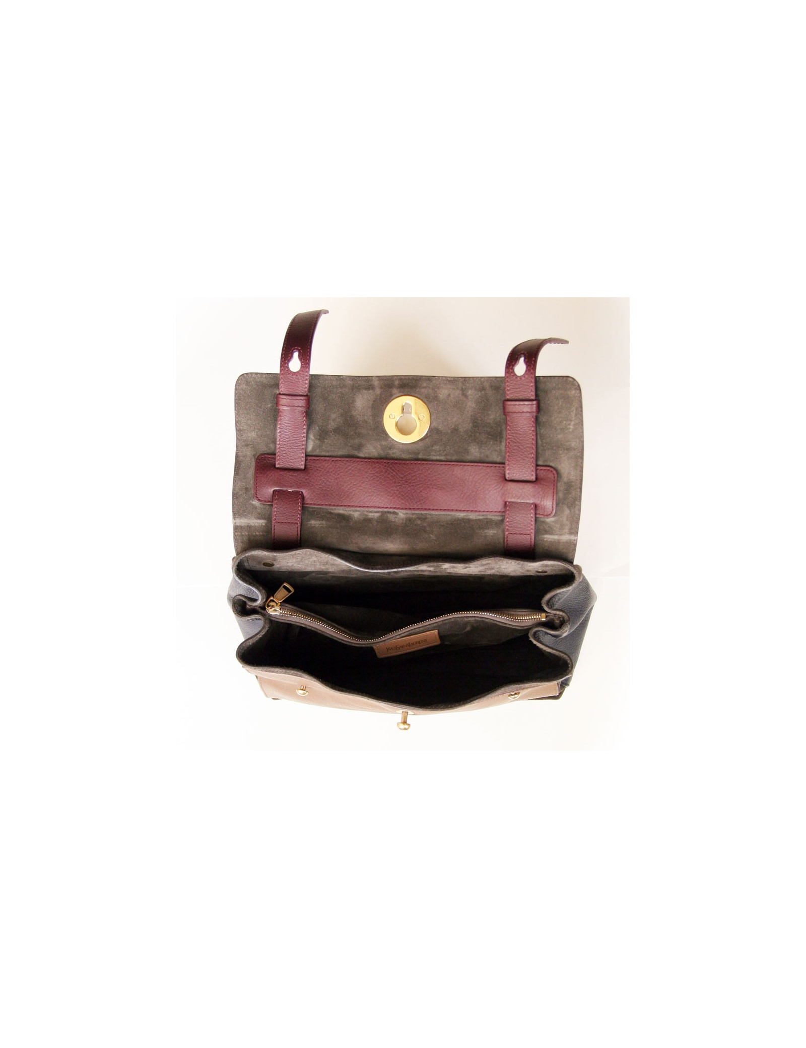 Célèbre sac Muse 2 de la Maison SAINT LAURENT, en cuir veau grainé tricolore: prune, bleu marine et étoupe.