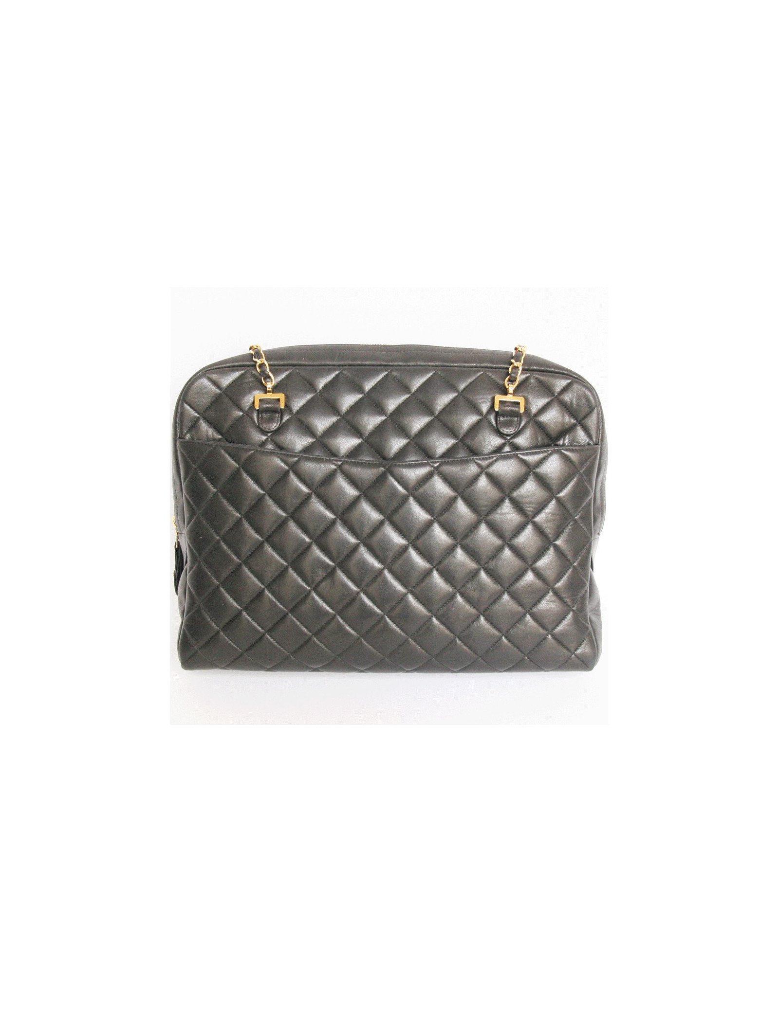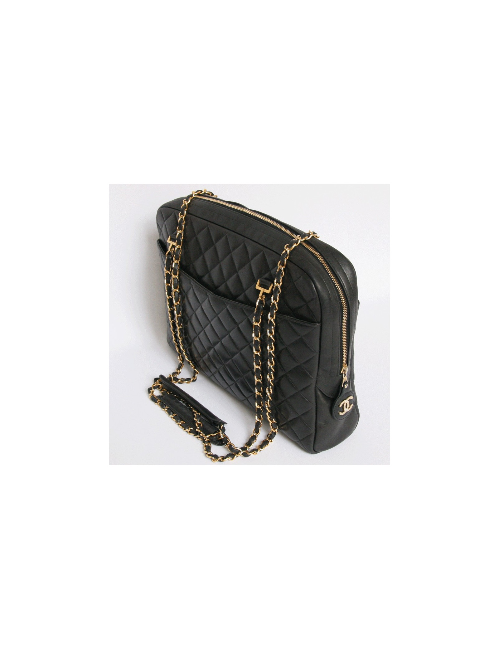 Sac vintage caméra CHANEL en cuir matelassé noir. Il se ferme par une fermeture éclair terminée par un macaron en cuir revêtu du sigle CHANEL.