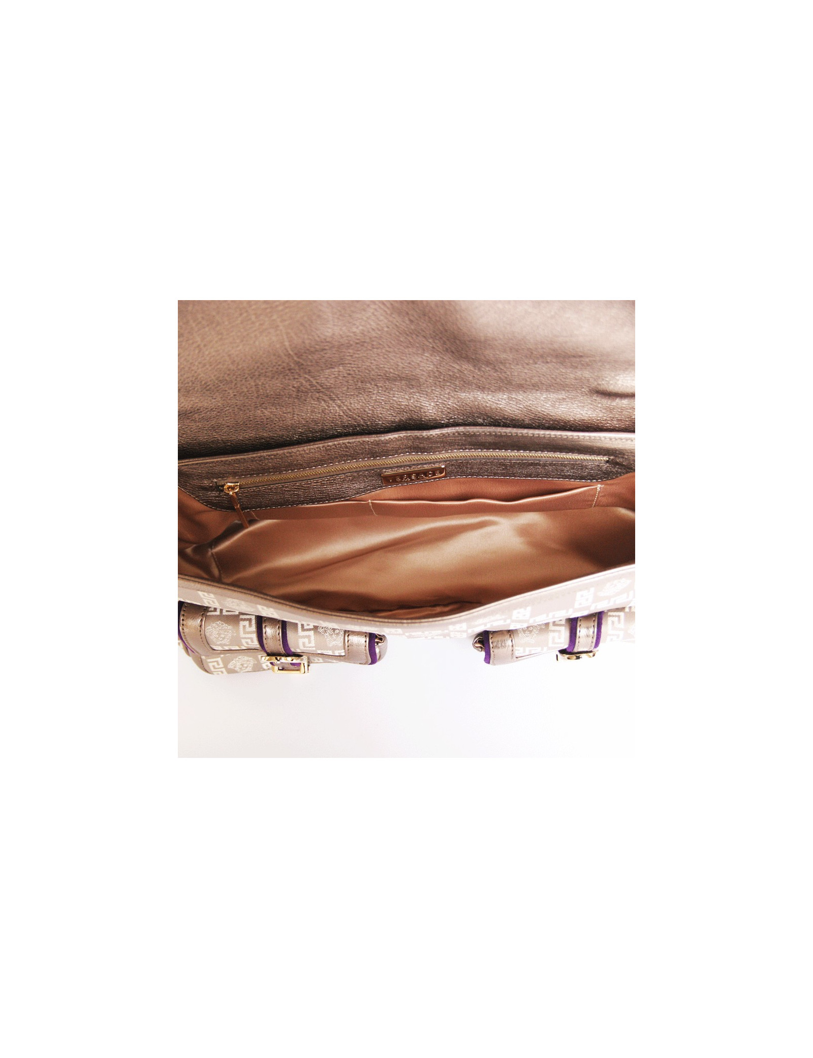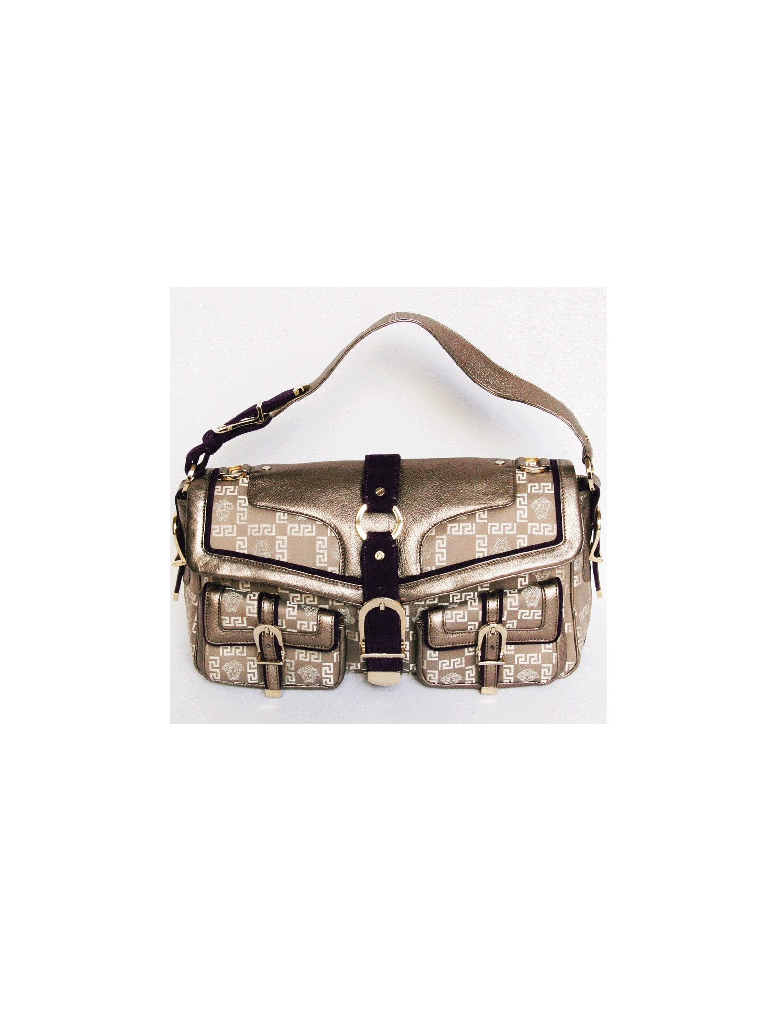 Beaucoup d'originalité pour ce sac composé de trois matière: tissu monogrammé VERSACE, cuir argenté et daim violet.