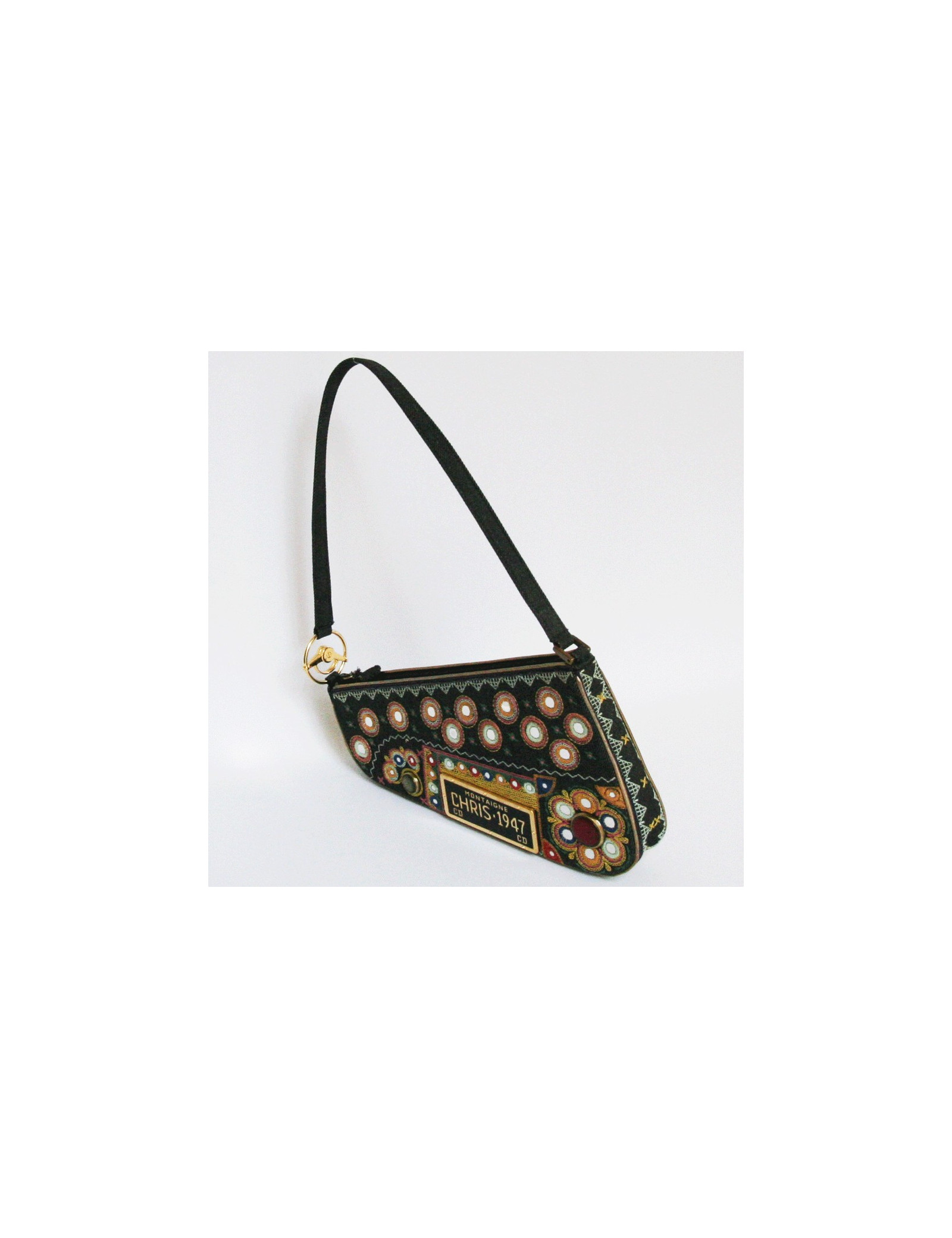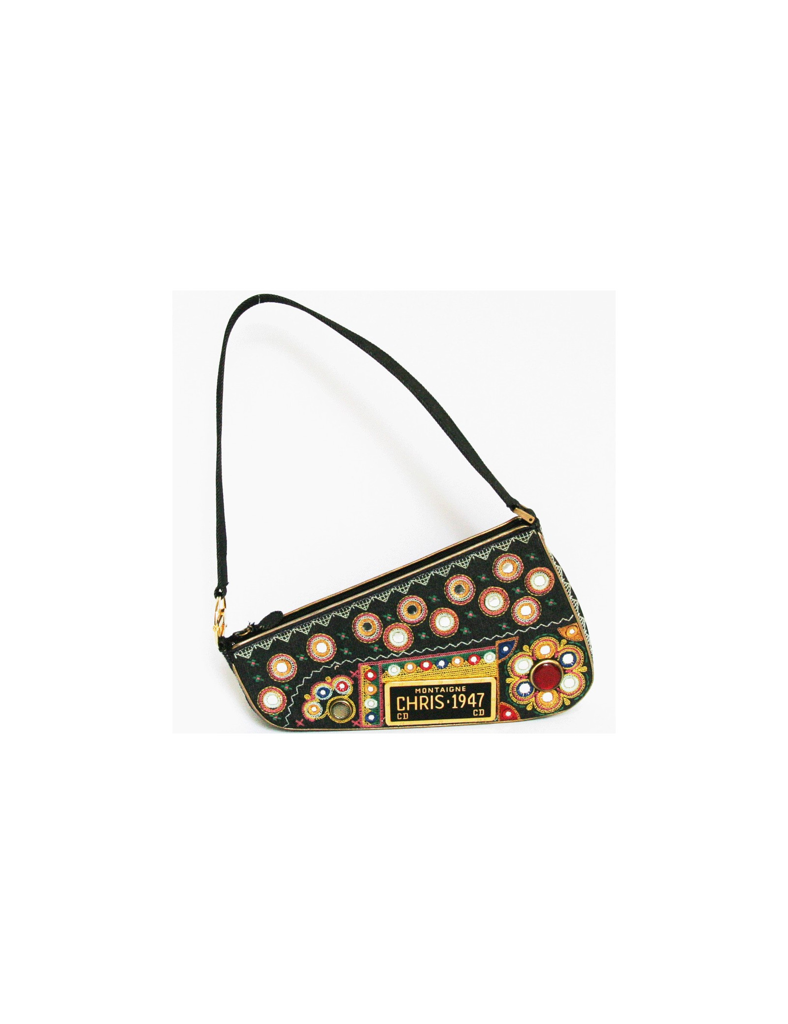 Sac "CHRIS 1947" de la Maison CHRISTIAN DIOR en jean's brodé de motifs multicolores et miroirs. pièce de collection !!
