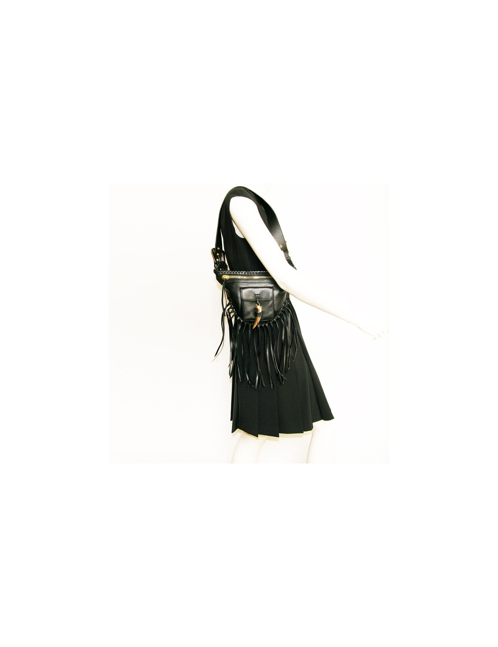 Cette banane GIUSEPPE ZANOTTI est en cuir noir avec des franges. Très original, ce sac peut être porté à la taille ou à l'épaule en cross-body. Il se ferme à l'aide d'un zip en métal doré et a un grand espace de rangement. A l'intérieur une poche plate. Une autre poche à l'avant du sac se ferme avec une une corne en métal doré. La ceinture est réglable sur quatre crans (de chaque côté).