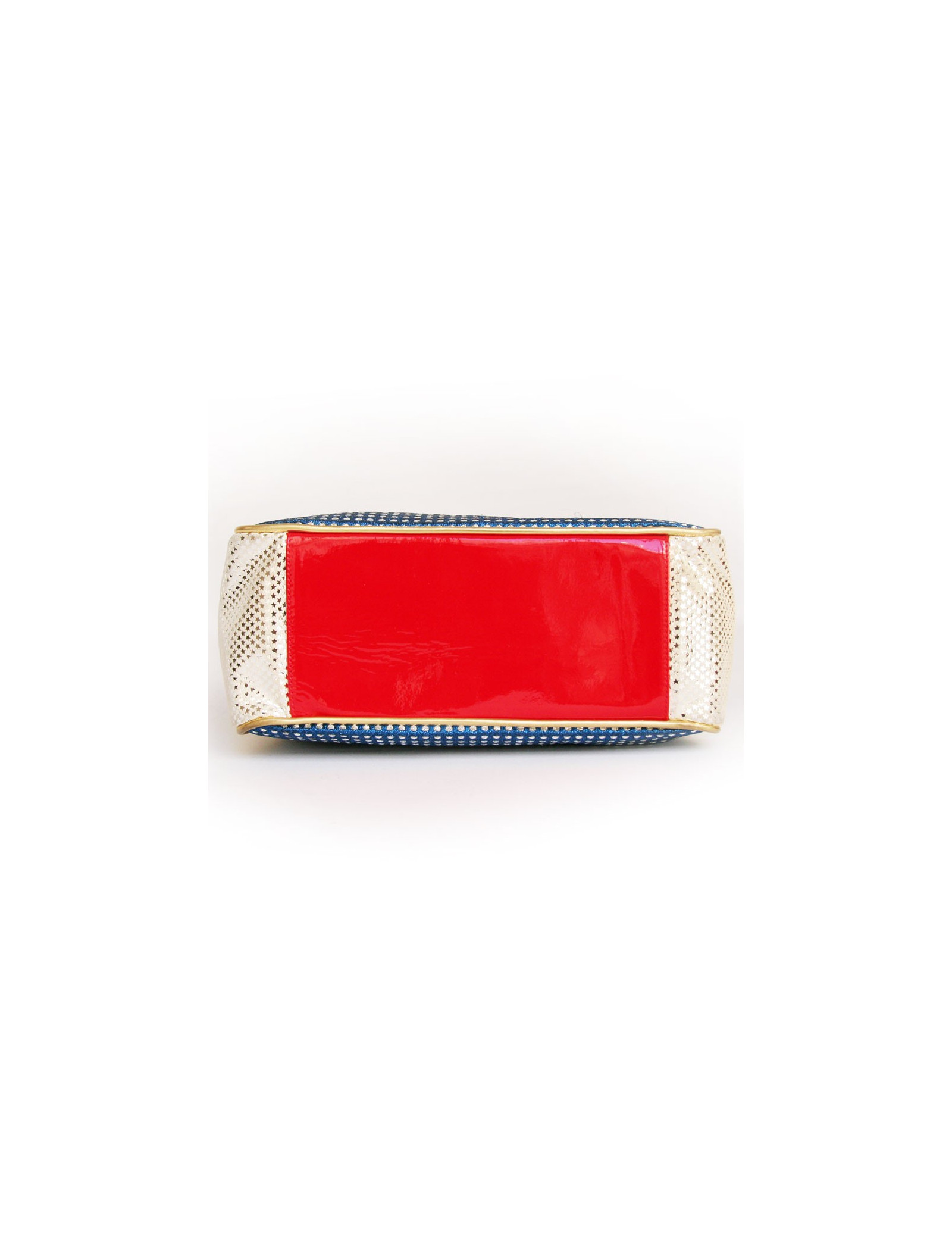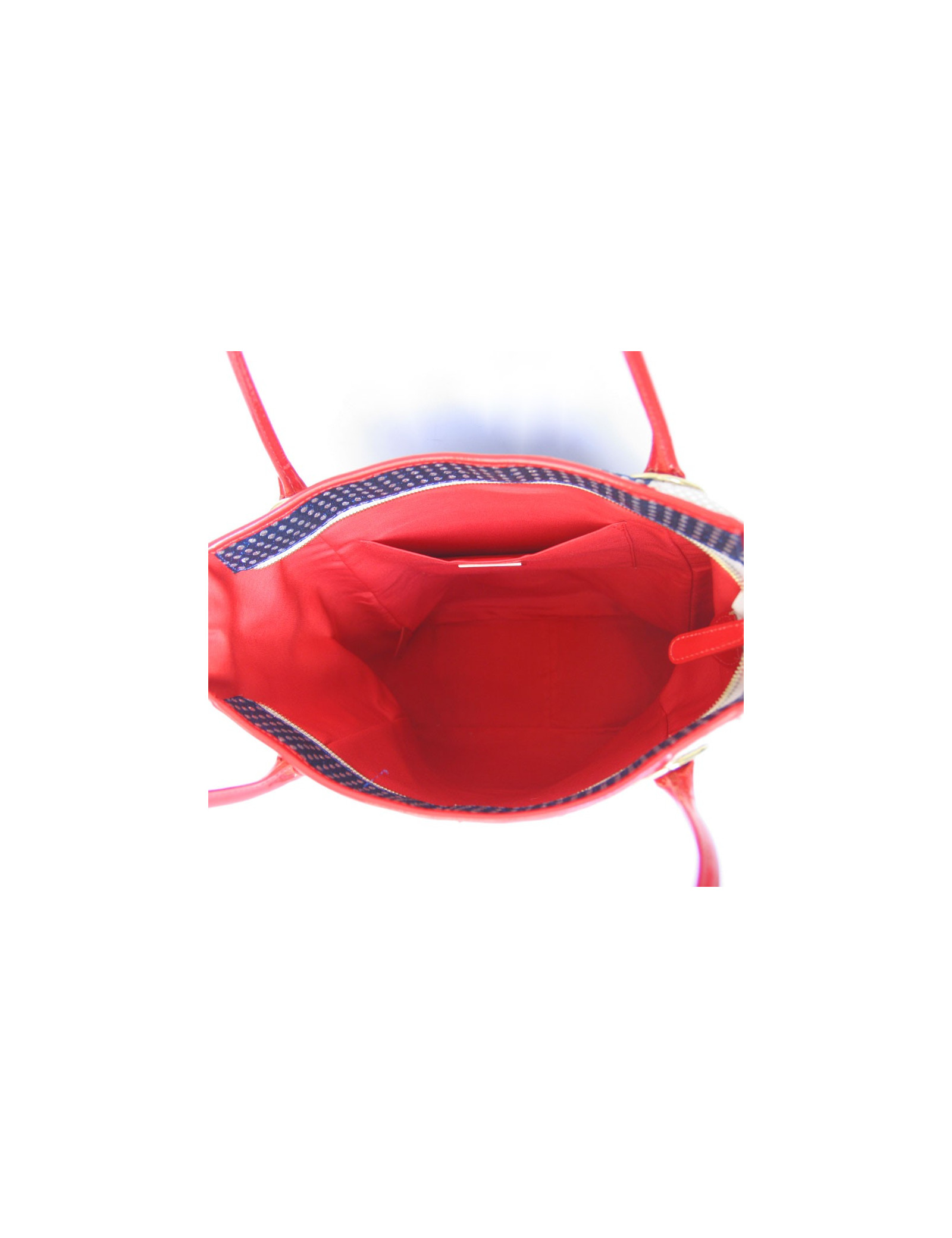 Il se ferme à l'aide d'un zip. L'anse est en cuir verni rouge et elle mesure 58 cm.