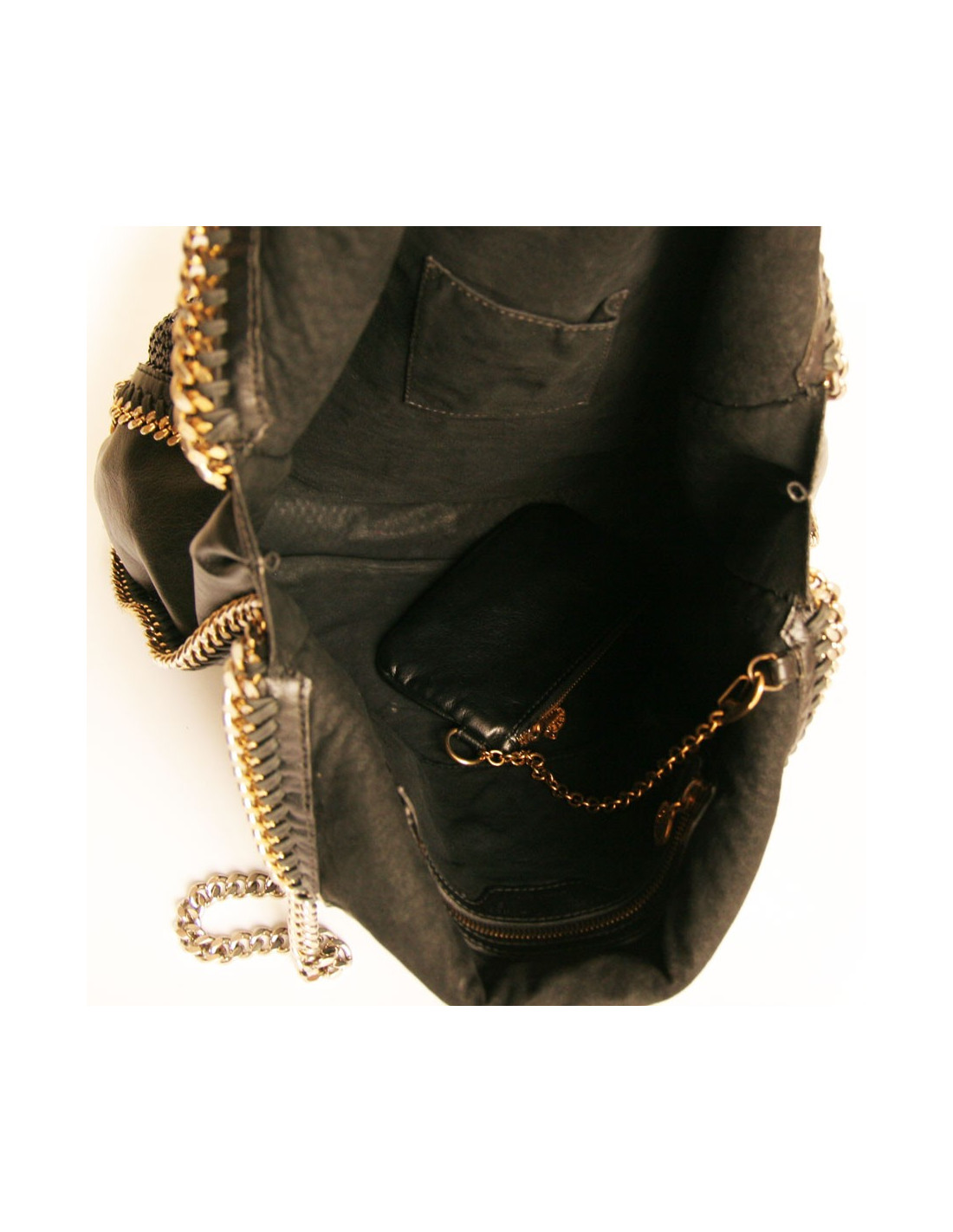 A l'intérieur, deux poches dont une zippée et une pour le smartphone. Il y a également une pochette attachée à une chaine en métal doré. En bon état. Les chaines étaient à la base en métal doré et deviennent argenté. Ce qui leurs donnent un coté vieilli.