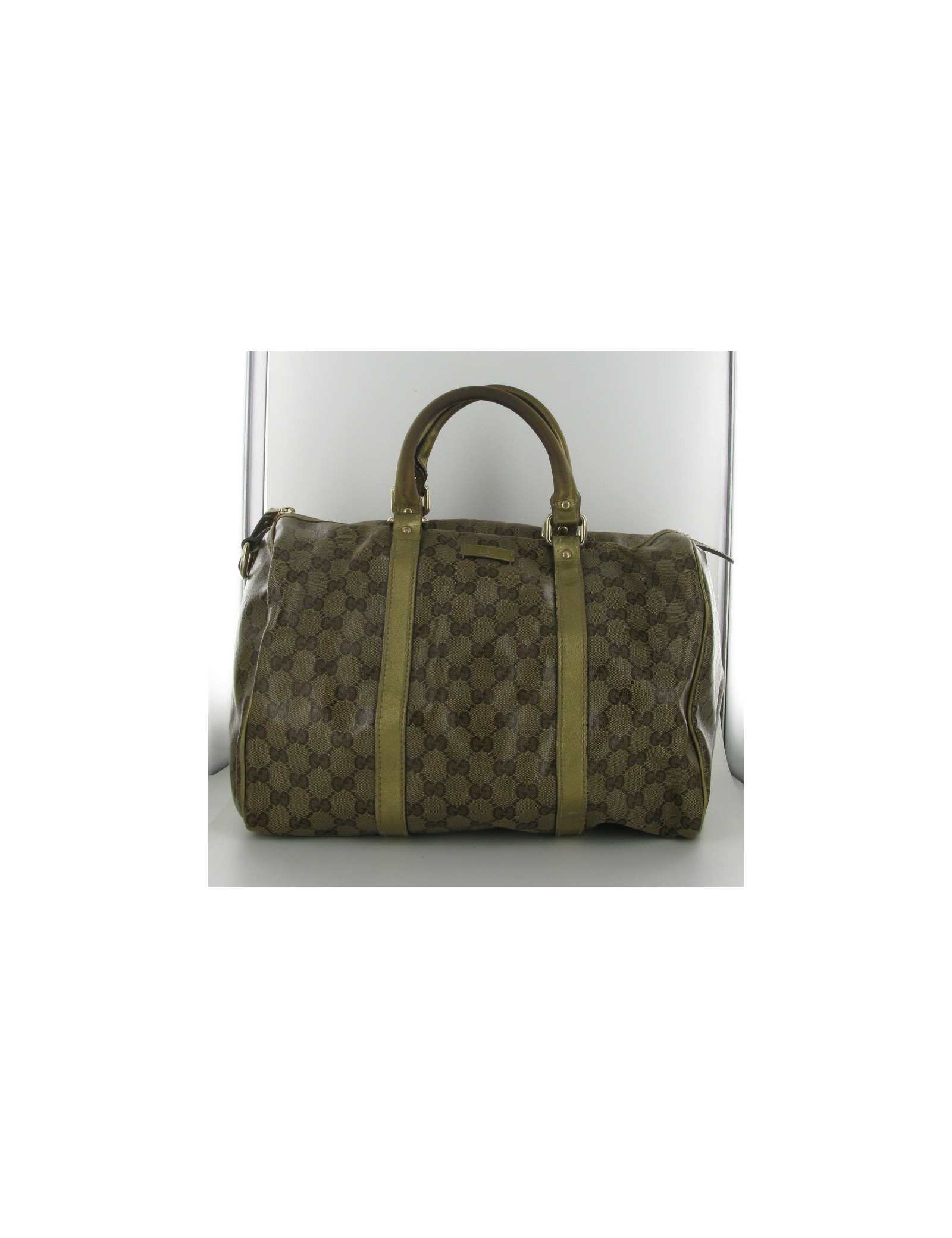 Magnifique sac Boston Joy Crystal en toile enduite vernie et cuir doré GUCCI.