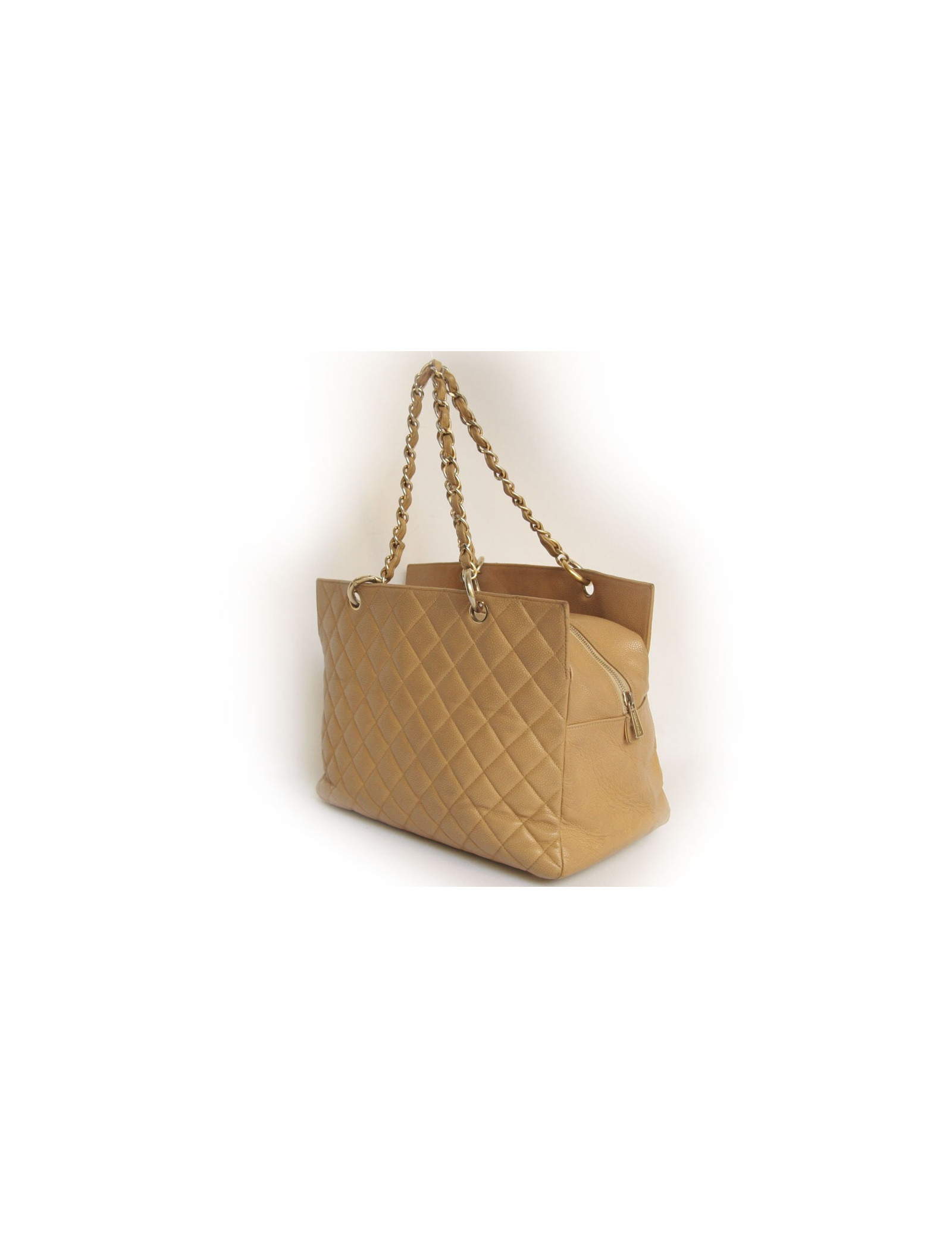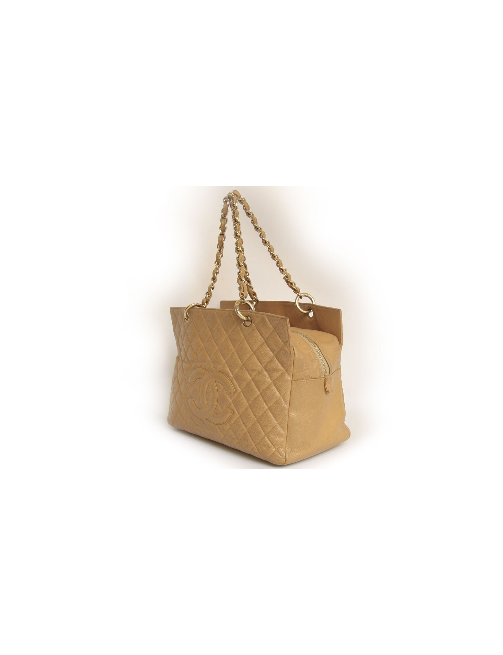 Le classique sac shopping de la Maison Chanel en cuir grainé beige. Très pratique car il peut contenir tous vos accessoires grâce à son grand espace de rangement ainsi que les deux grandes poches qui se trouvent à l'avant et à l'arrière. L'intérieur est en tissu beige avec quelques taches. Les ferrures sont en métal doré. Il se porte de trois façons: à la main, au bras et à l'épaule. La bandoulière est en chaîne dorée et cuir beige. En bon état. Les coins sous le sac sont marqués. Le cuir de la bandoulière est légèrement usé. Il y a une marque sous le sac. Voir photos. Hologramme